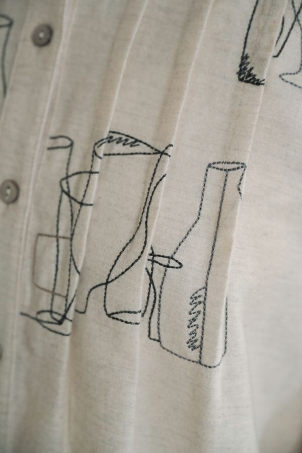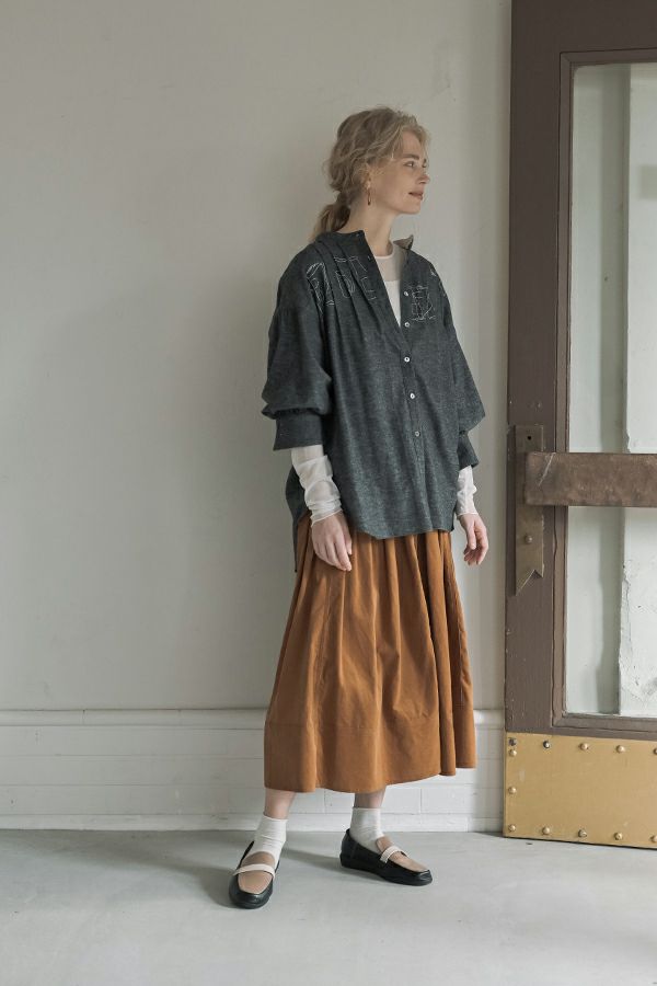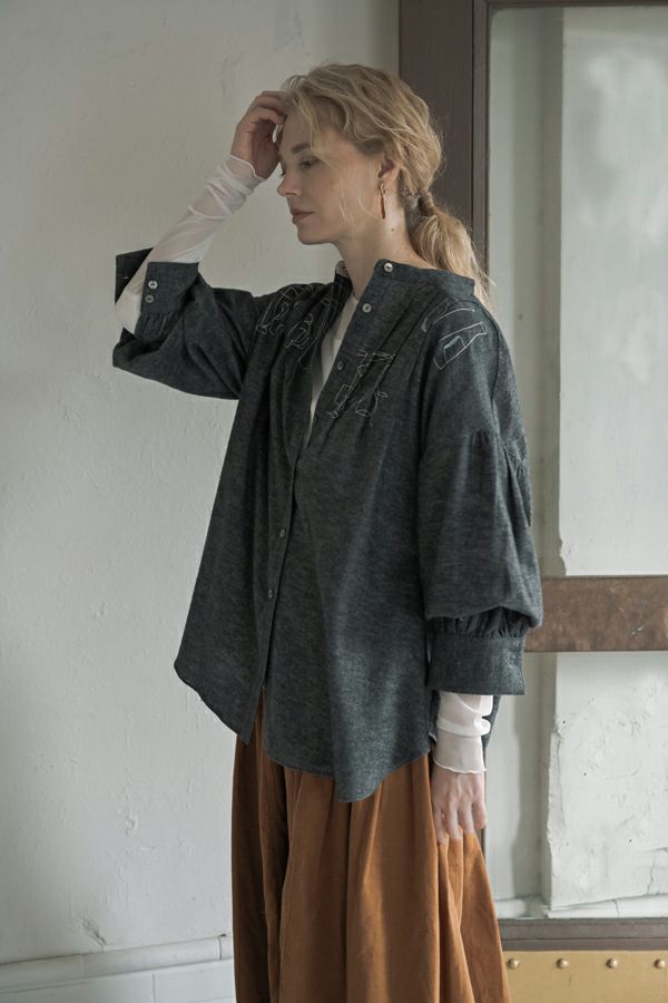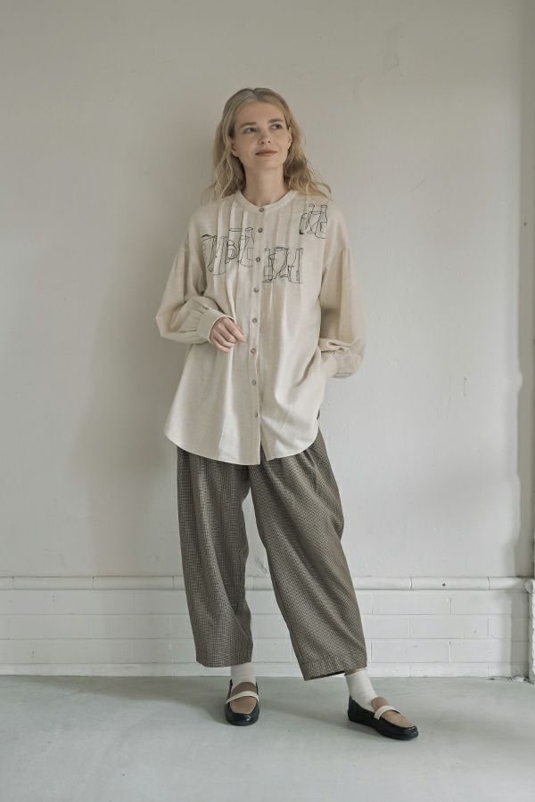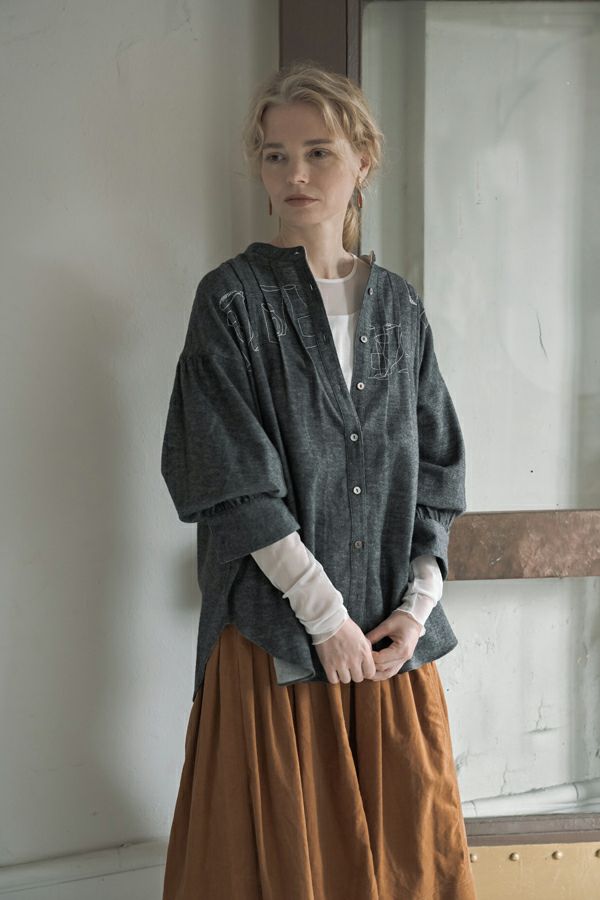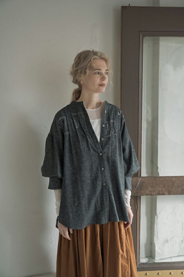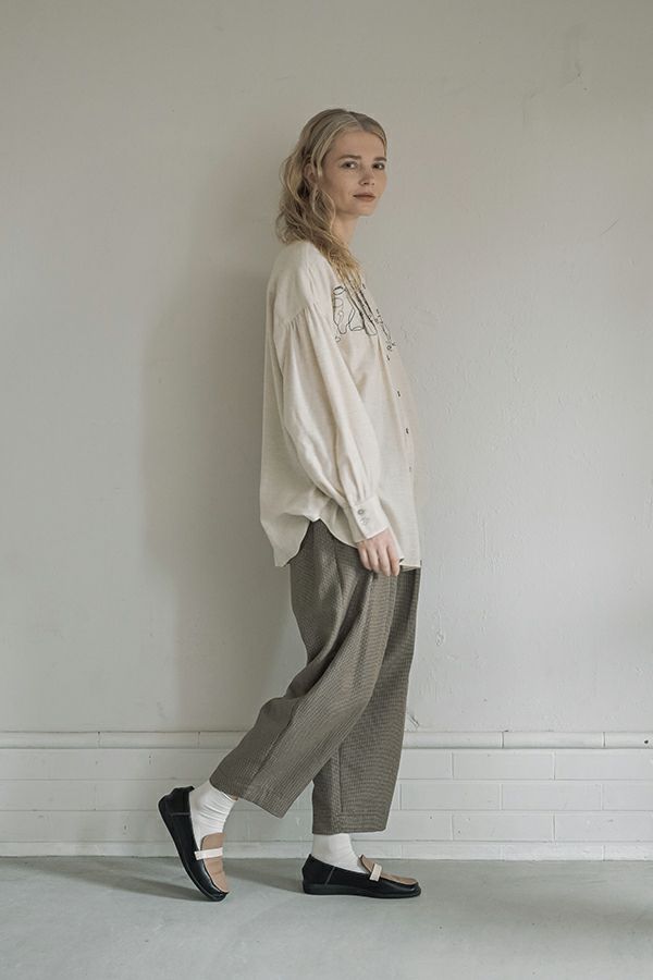 大人可愛い刺繍が目を惹く綿起毛ブラウス。 曲線的なカップやフラワーベースがモチーフのステッチ刺繍。前に入った太めのピンタックが立体的でバストや気になるお腹周りをカバーする仕掛けに。 衿裏、前立て裏、カフス裏にakaneらしいチェック配色の異素材使いがポイント。 フワッと優しい起毛綿素材は肌ざわり抜群で、秋冬に重宝するakane定番素材を使用しています。1枚着でも羽織りとしても便利な分量感たっぷりのアイテムです。