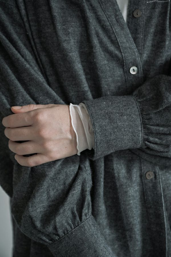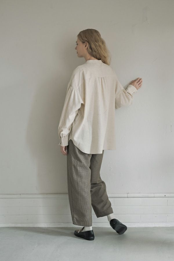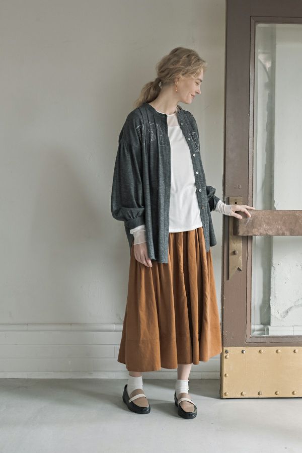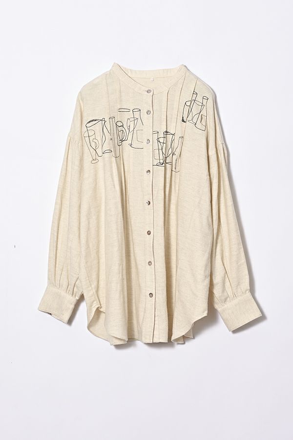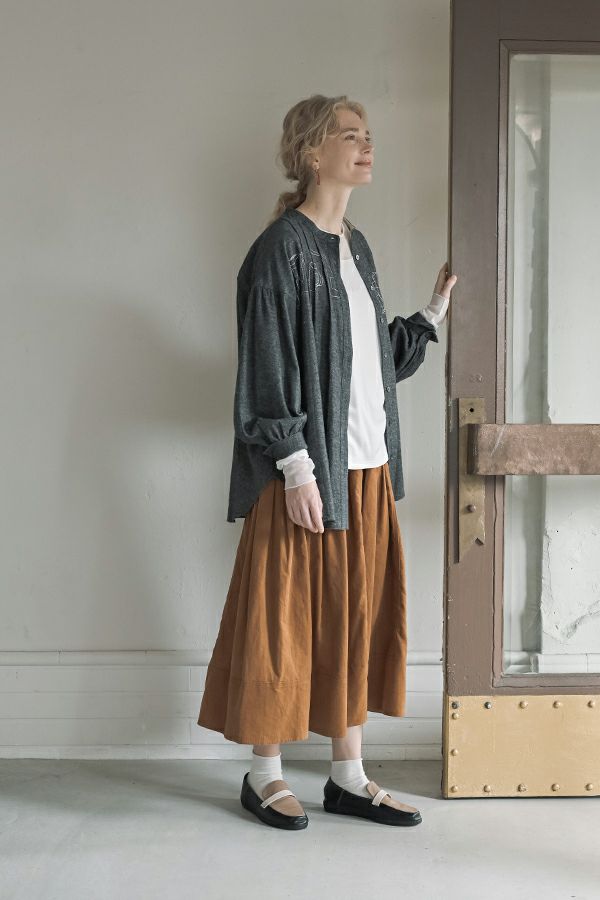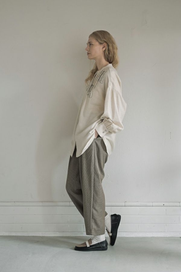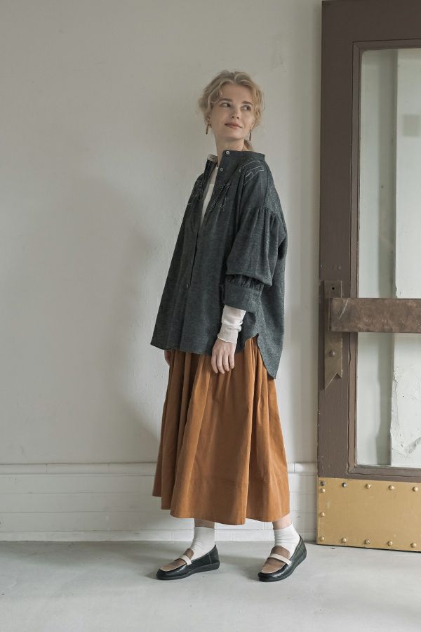 大人可愛い刺繍が目を惹く綿起毛ブラウス。 曲線的なカップやフラワーベースがモチーフのステッチ刺繍。前に入った太めのピンタックが立体的でバストや気になるお腹周りをカバーする仕掛けに。 衿裏、前立て裏、カフス裏にakaneらしいチェック配色の異素材使いがポイント。 フワッと優しい起毛綿素材は肌ざわり抜群で、秋冬に重宝するakane定番素材を使用しています。1枚着でも羽織りとしても便利な分量感たっぷりのアイテムです。