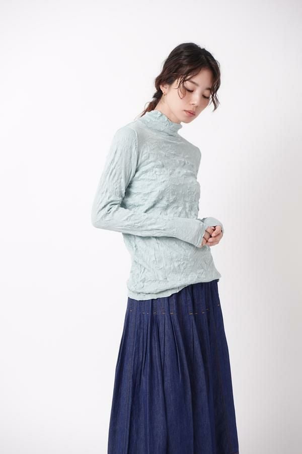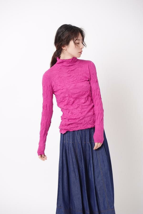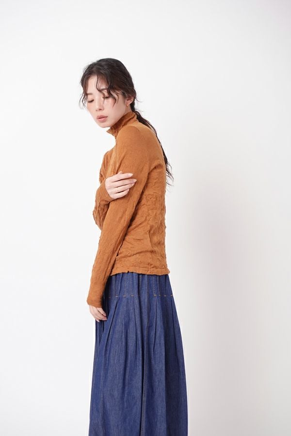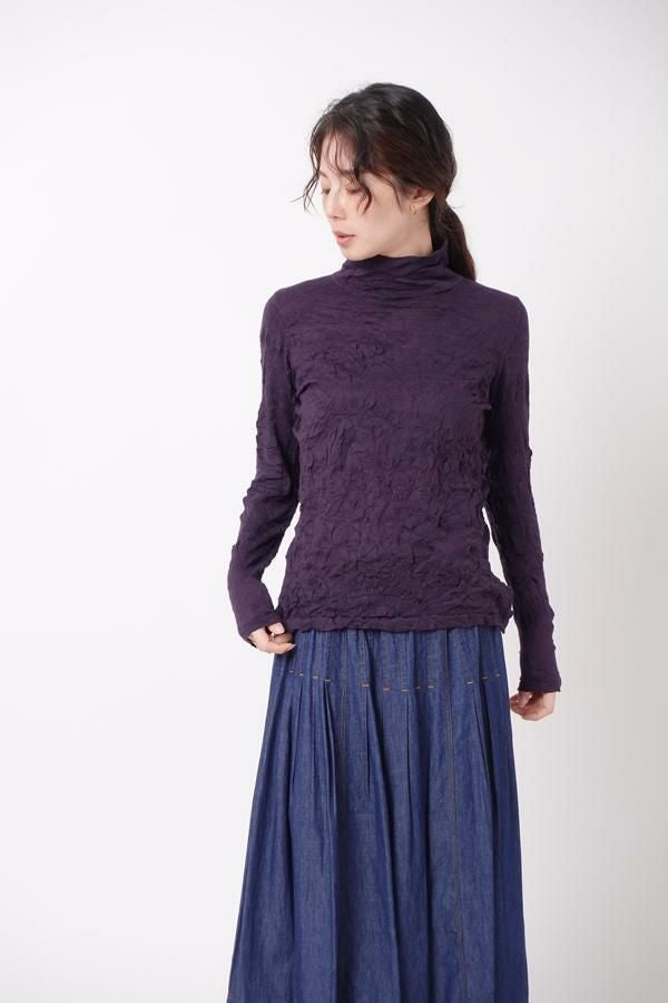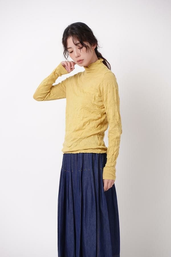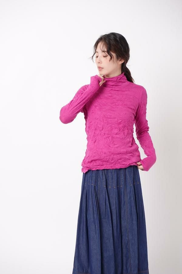 肌触りの良い綿ポリエステルの素材で、真夏以外年中着用可能な素材です。チクチクする素材はイヤ!とおっしゃるお客様には、喜んで頂ける定番ロングランヒットの一着です。 お色違いで買い揃えても後悔しません。 ①洗える! ②薄手でソフト ③肌触りが良い ④元々シワが入っている為、洗いざらしのまま着用可能 ⑤小さくなるのでバックに入り旅行に最適 ⑥色展開が豊富 これが長年愛され続ける理由です。上に何でも重ねられ、衿の高さやフィット感が着こなしをオシャレに仕上げてくれます。 職人の絶妙な加減で作られているシワ加工製品は一枚一枚のシワの出方が違う希少価値の高い製品です。 ランダムに入るシワによって体型が出にくい外観にもなっています。伸びも良く何度も着たい優しい肌触りです。衿の高さは、高すぎず低すぎない実用かつ、オシャレに着こなせる衿元を実現。 色々なアイテムの着合わせに最適です。綿とポリエステルの混紡素材で、ソフトな肌触り。 シワ加工に必ず必要なポリエステルは、ポリステルの特徴である熱に強く一度熱で変形させると元に戻らない性質を利用。ポリステルの混率が高いほどシワ加工のセット性も高くなります。 今回ポリエステルの特性を生かして肌に優しい天然繊維の綿素材との混紡素材で市場では少ないシワ加工のセーターを作りました。
