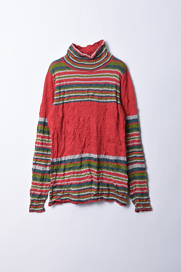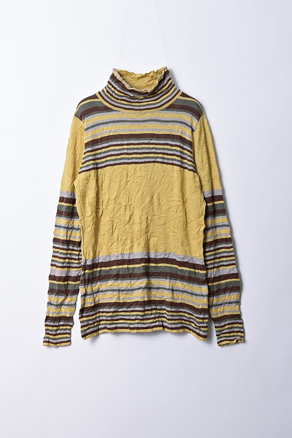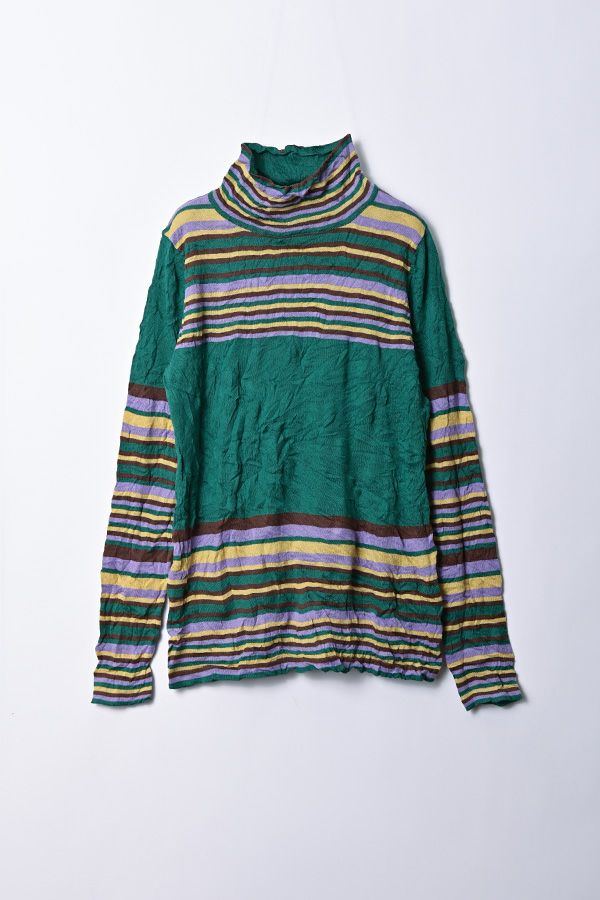 肌触りの良い綿ポリエステルの素材で、真夏以外年中着用可能な素材です。チクチクするの素材はイヤ!とおっしゃるお客様には、喜んで頂ける定番ロングランヒットの一着です。お色違いで買い揃えても後悔しません。 ①洗える! ②薄手でソフト、肌触りが良い ③元々シワが入っている為、洗いざらしのまま着用可能 ④小さくなるのでバックに入り旅行に最適 ⑤ボーダー柄でポイント作れます これが長年愛され続ける理由です。上に何でも重ねられ、衿の高さやフィット感が着こなしをオシャレに仕上げてくれます。職人の絶妙な加減で作られているシワ加工製品は一枚一枚のシワの出方が違う希少価値の高い製品です。 ランダムに入るシワによって体型が出にくい外観にもなっています。伸びも良く何度も着たい優しい肌触りです。 衿の高さは、高すぎず低すぎない実用かつ、オシャレに着こなせる衿元を実現。色々なアイテムの着合わせに最適です。綿とポリエステルの混紡素材で、ソフトな肌触り。 シワ加工に必ず必要なポリエステルは、ポリステルの特徴である熱に強く一度熱で変形させると元に戻らない性質を利用。 ポリステルの混率が高いほどシワ加工のセット性も高くなります。今回ポリエステルの特性を生かして肌に優しい天然繊維の綿素材との混紡素材で市場では少ないシワ加工のセーターを作りました。