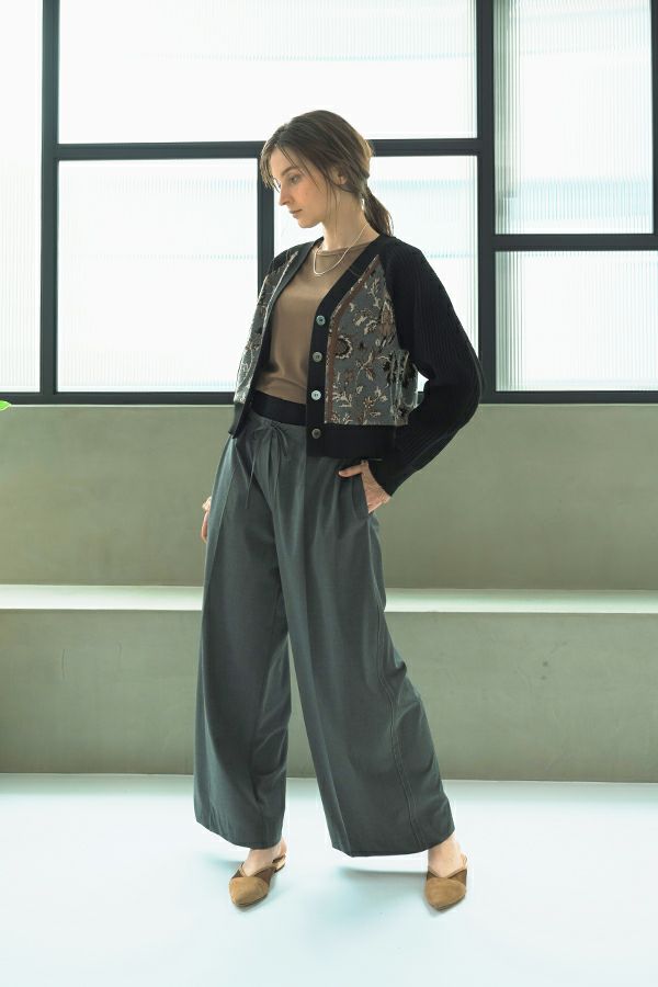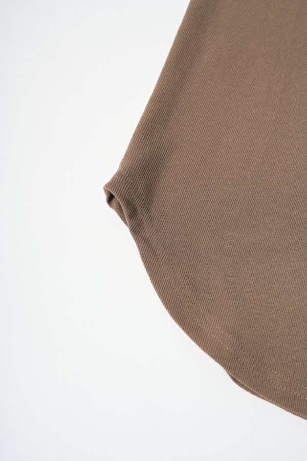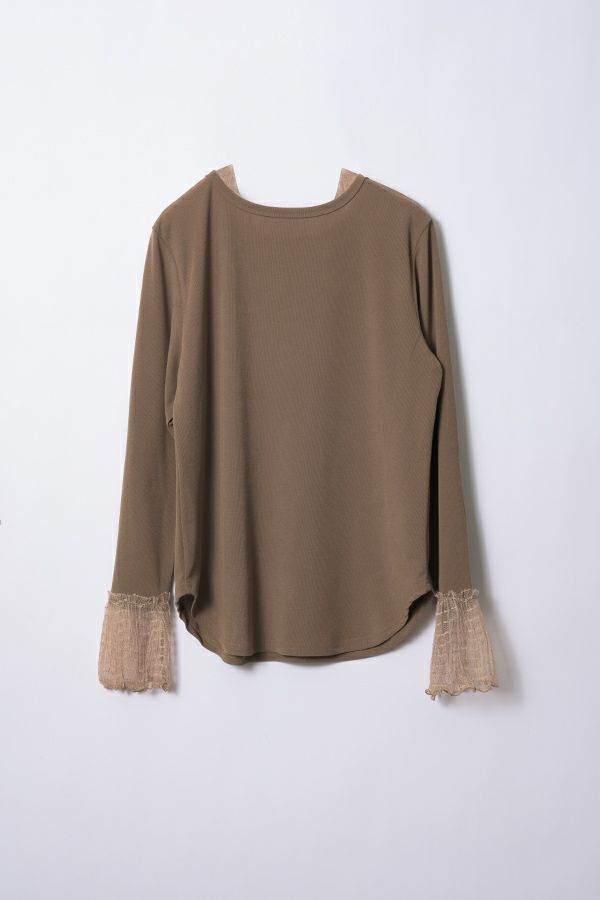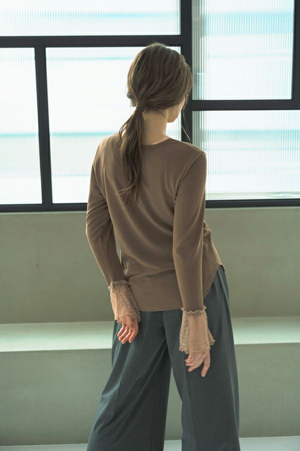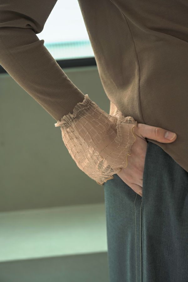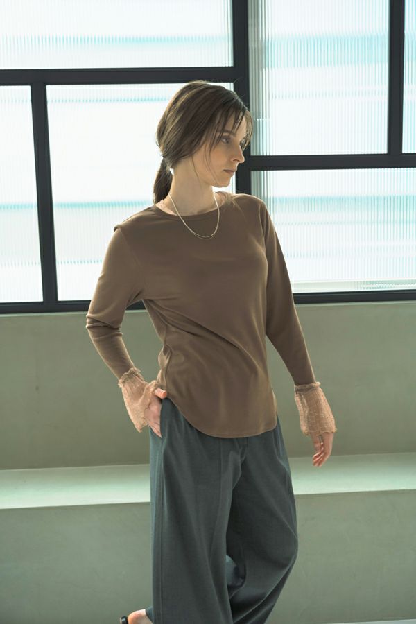 袖口からのぞくチュールのフリルカフスがアクセントになったリブカットプルオーバー。 伸縮性のある着心地の良いリブカットソーで、裾はラウンドし程よいフィット感が特徴。デコルテ周りが綺麗に見える、絶妙なクルーネックも洗練された印象に。 シンプルながらもこなれた雰囲気に仕上がります。 1枚での着用はもちろん、ジャンパ―スカートやサロペットのインナーにもおすすめです。またシャツやワンピースの下にレイヤードで合わせても大活躍間違い無しです。