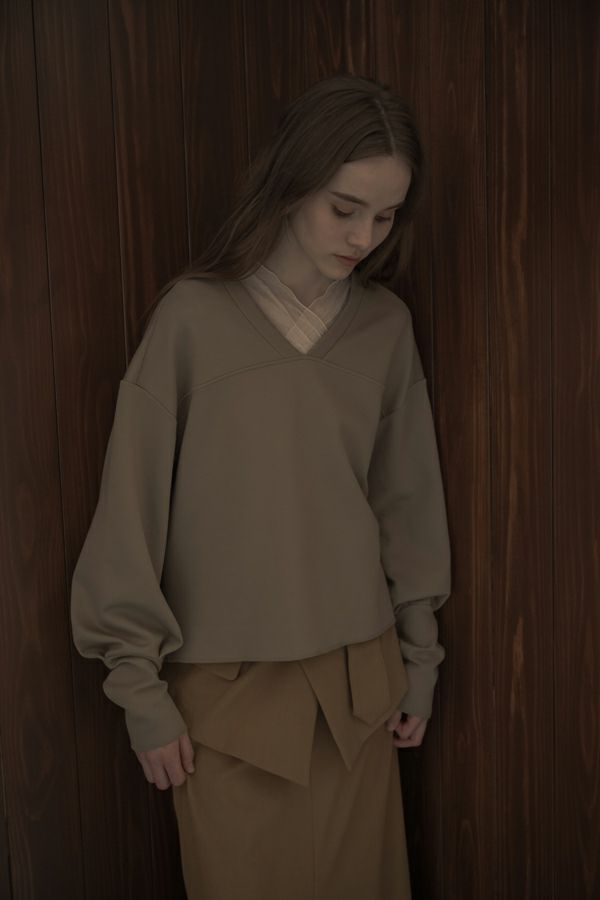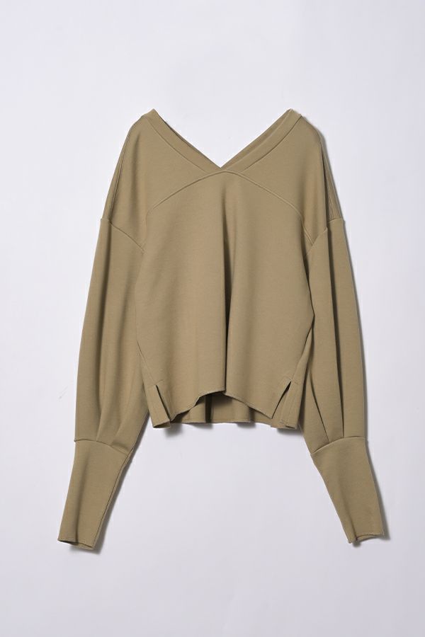 モードなVネック長袖カットプルオーバー。 肩先を落としたドロップショルダーと前後のネックラインがしなやかでリラクシーな雰囲気がポイントです。 カットソー素材でカジュアルになり過ぎないように、袖口にかけて絞ったような長めの切替とタックを入れてフィット&ボリュームな袖シルエットにも拘りました。 ラグウォームモイストポンチ生地使用でモチッと感のある風合いが快適な着心地。 タイトスカートやデニムに前裾をウエストインして、後ろに抜いて着るのもおススメです。 インナーにブラウスやカットソーを重ねて、裾を出すレイヤードスタイルも◎ ラグウォームモイストポンチとは →湿気や汗を熱に変える吸湿発熱性がある為、暖かさを実感できます。 加工工程に拘ることによって生み出されたソフトな風合いと滑らかな肌触り に加えストレッチ性にも富んでいるので、心地よい着用感が楽しめます。 ピリングもしにくく、機能性・ファッション性・安定性を兼ね備えたJapan quality 素材です。