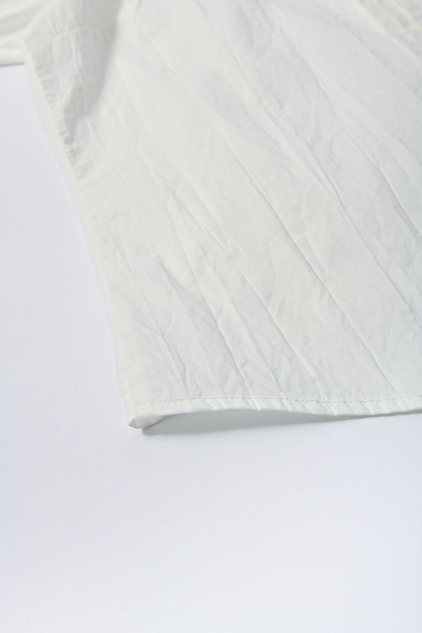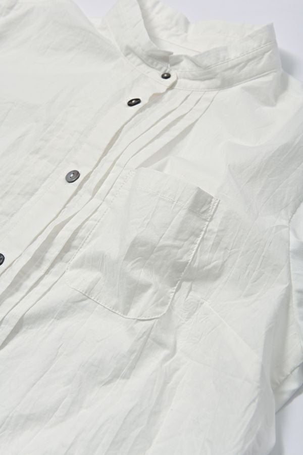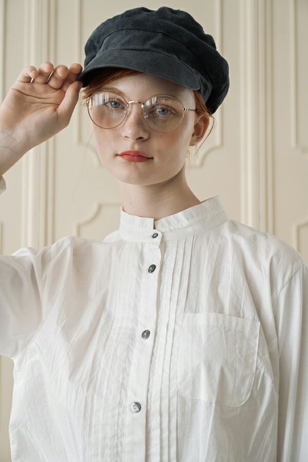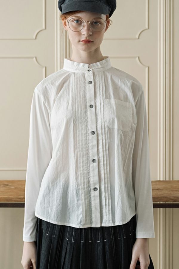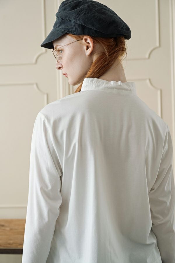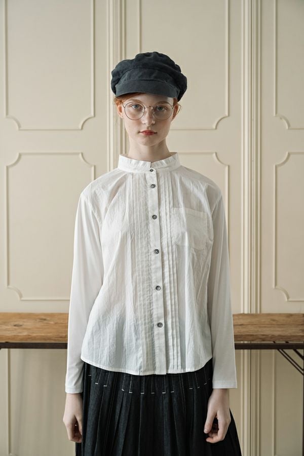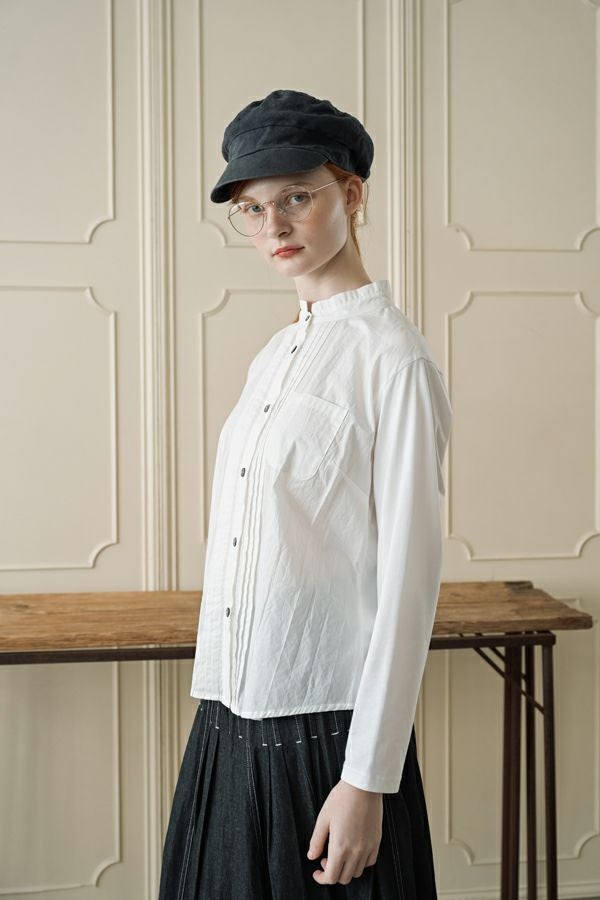 定番バックカットブラウス。前はピンタックの綿生地で後ろと袖はカットソーのインナーシャツ。 細いスタンドカラーは襟元をきちんと見せます。 前は軽くワッシャー加工入り。お腹が隠れる丈でカーブを付けてます。 後ろと袖のカットソーは伸縮性があるので着心地抜群! ①サイズ感はそのままキープ。 ②綿生地は、少しハリ感があり 目が詰まった綺麗めタイプに。 ③カットソー地は、吸湿・速乾の機能性素材を使用。 ④着用時、熱がこもりにくく より快適な着心地にバージョンアップ! ⑤シーズンレス 様々なアイテムのインナーに合わせられるお役立ちアイテムです。