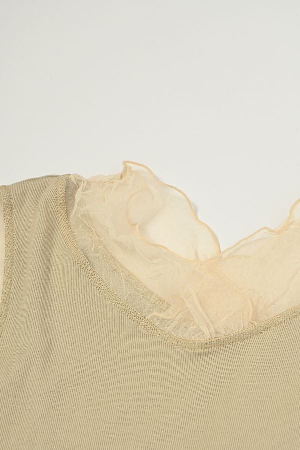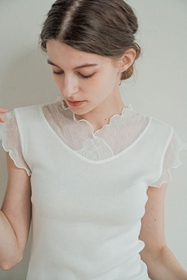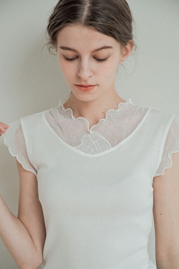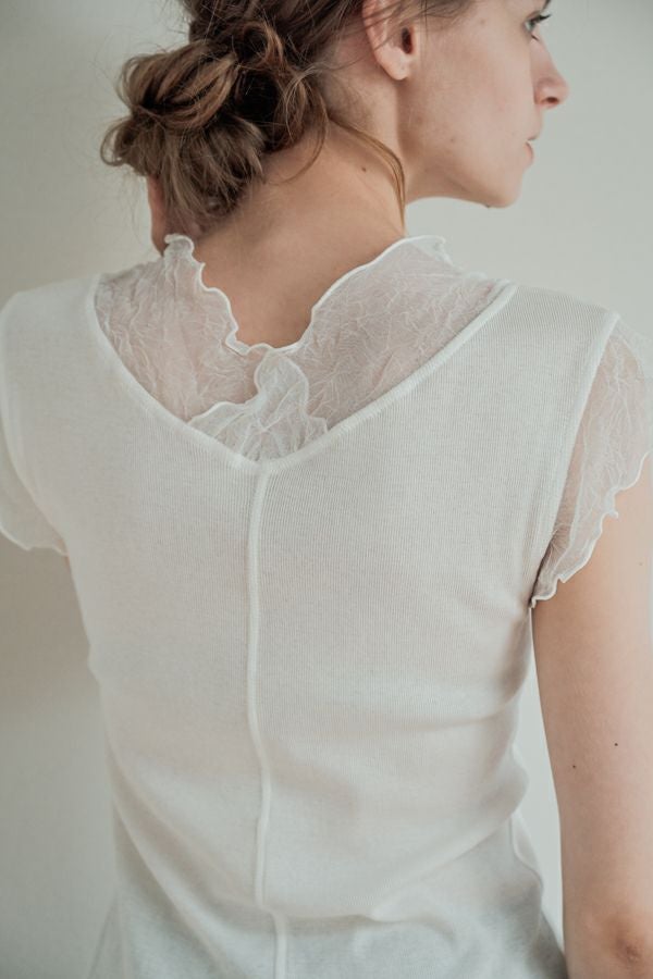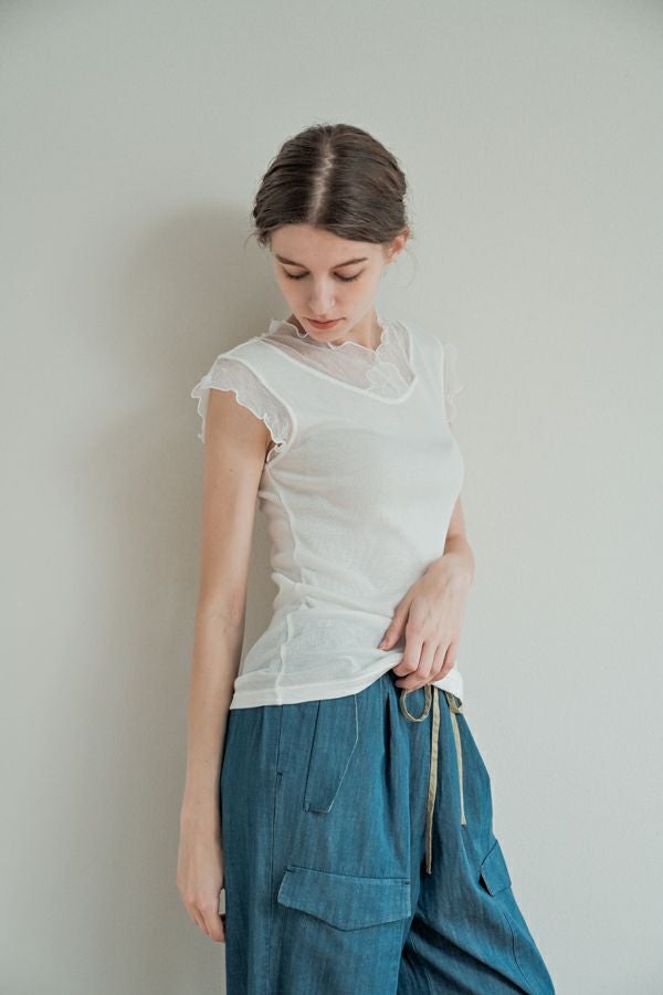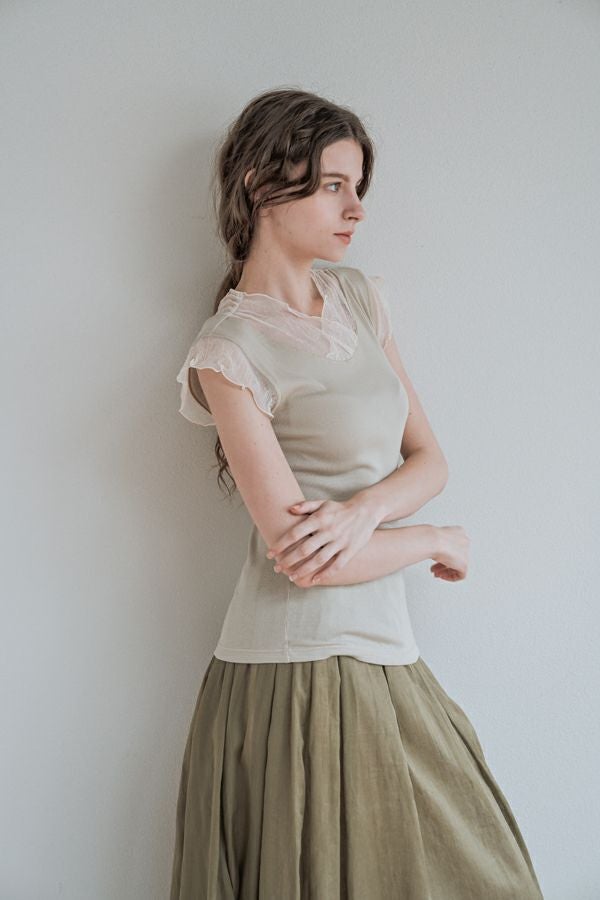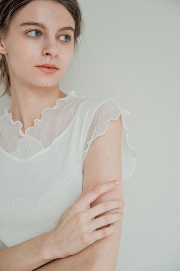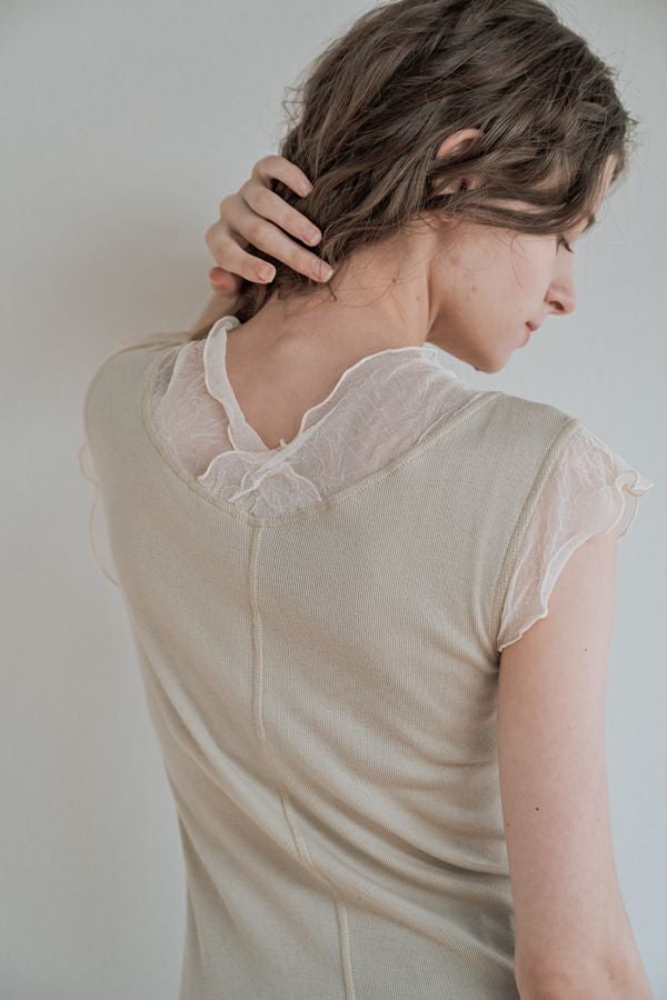 レイヤードスタイルに欠かせない、フレンチスリーブタンク。 リブ生地とクラッシュメッシュを組合わせ、洗練された印象のアイテム。 24年秋シリーズで登場したメッシュネックプルオーバー(24228-1614Z-G)が大好評。今回は人気商品の夏バージョンです。 素材は特殊なアルビニスタシフォンテレコ素材で、肌触りも良いコットン100%で優しい着心地になっています。首元が大きく開いたトップスなどのインナーに使えます。軽やかなクラッシュレースを首元から覗かせて可愛い衿廻りにアレンジ可能。 着心地の良さとさり気ないシアー感で一枚はもちろん、ジャンパースカートやキャミワンピースのインナー合わせにもおススメです。華奢な雰囲気でレイヤードアイテムとして重宝します。 ●日本製 ●【アルビニスタシフォンテレコ】(イタリア糸) → 細番手の綿をテレコ組織で甘く編み下ろし、肌離れの優れたエアリーなタッチと程良い透け感が新鮮な素材の生地。