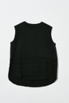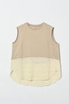 シーズンレスで活躍、シャーリングレース×コクーンシルエットのタンクトップ。 綿のシャーリングレースと身頃の切り替えが絶妙なバランスを生むデザイン。 前後差のある裾がヒップからお腹周りを優しくカバーし、気になる腕周りは肩先まで被る広めの肩幅で、腕の付け根がすっきりと見えるように配慮しています。 包み込むようなコクーンシルエットは、ボトムのウエスト周りにドレープ感を出し、胸周りにはダーツを入れてすっきりとしたサイズ感を実現。 春から初秋にかけて、シーズンを問わず活躍すること間違いなしの一枚です。