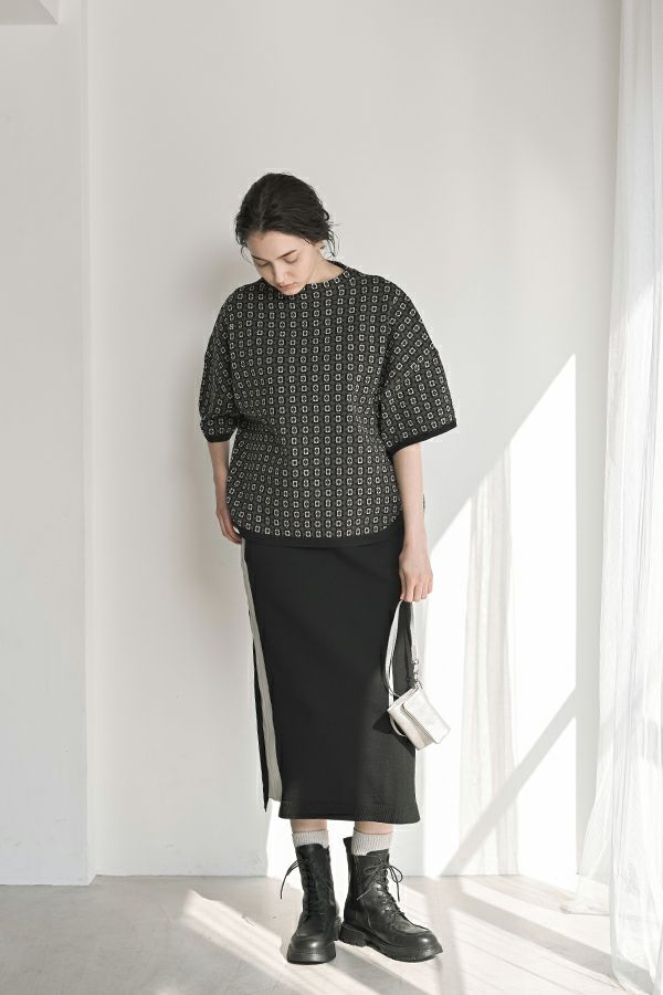 シンプルと個性の洗練デザインが目を惹く、ジオメトリー柄ニットプルオーバー。 スポンジのような弾力と柔らかなハリ感で伸縮性抜群な着心地です。オーバーサイズなボディーにラウンド裾が可愛いく、後ろ裾を長め設定にしているので気になる腰周りもカバーしてくれます。 シックなジオメトリー柄に袖と裾の無地のトリミングがグッと引き締まった、大人の遊び心あるアイテム。プルオーバーとして一枚着でも使え、肌寒くなったらベストとしてレイヤードスタイルにしたりとシーズンレスで大活躍のアイテムです。 シンプルなボトムに合わせるとスタイリッシュな着こなしに。サイドライン美スカート(25228-8371T-W)を合わせるとセットアップコーデがお楽しみいただけます。 ●手洗い可