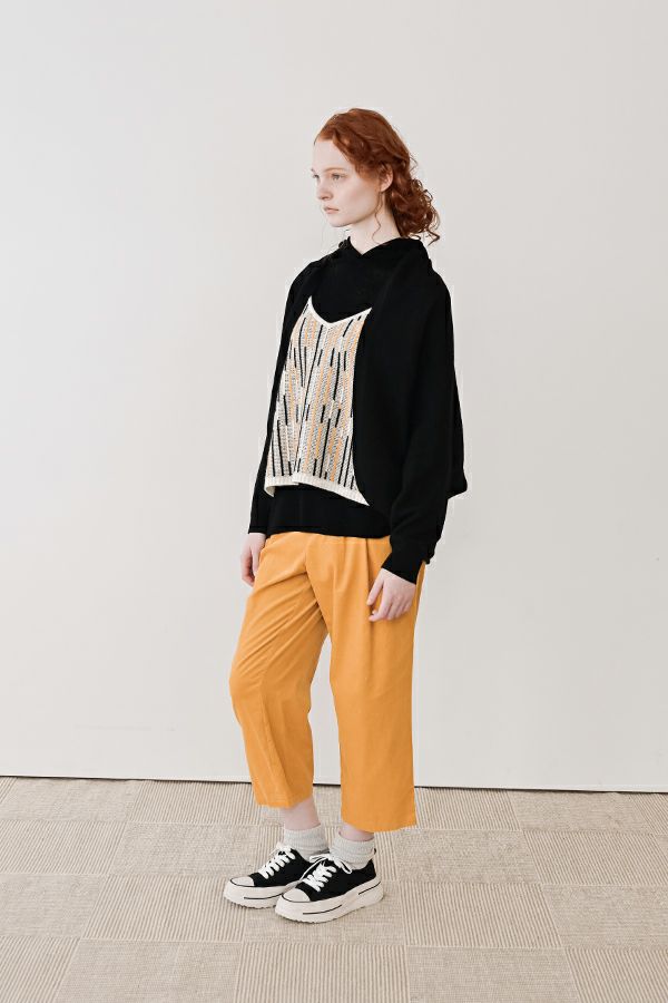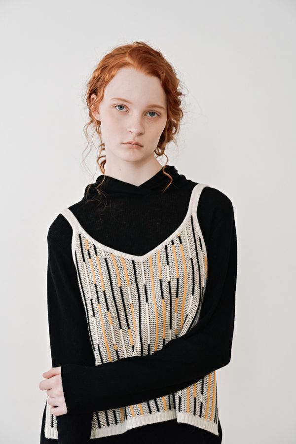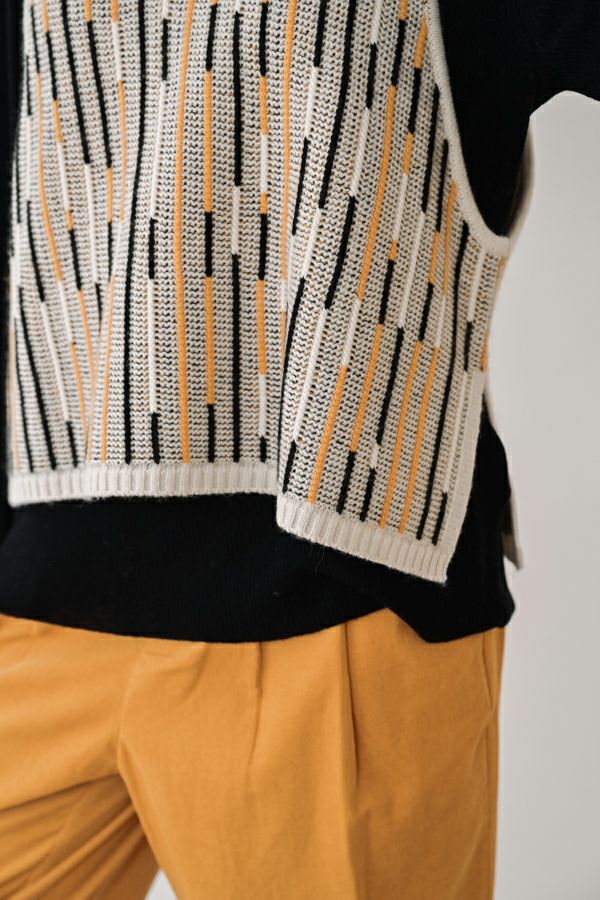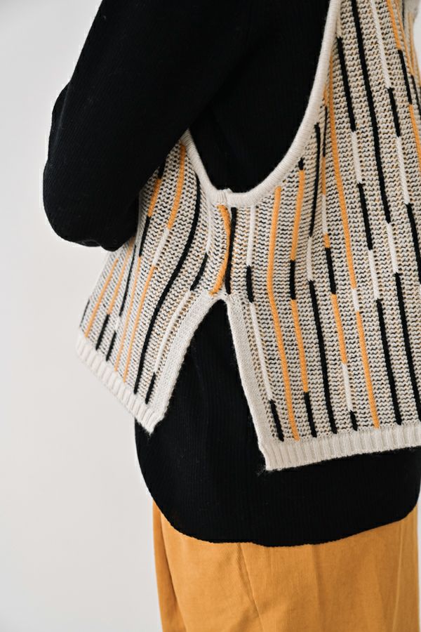 重ねるだけで、抜け感と彩りを。大人のための2WAYニットビスチェ。 絶妙な色合いのカラフルな編み柄が大人可愛く、縦ラインがすっきりとした印象に導きます。 前はVネック、後ろはラウンドシルエットと、前後で異なるネックデザインの2WAY仕様。その日の気分やインナーに合わせてアレンジが楽しめる、嬉しいデザインです。裾の両サイドに入れたスリットがウエスト周りに程よいゆとりを持たせ、重ね着もスムーズに。 ニットビスチェは伸縮性があるので、着心地や着脱も楽ちん。秋口にはシャツやカットソー、冷え込む冬にはタートルとのレイヤードで、スタイリングのアクセントにも活躍。シンプルなスタイリングに、さりげなくトレンド感と季節感を添えてくれる万能アイテムです。
