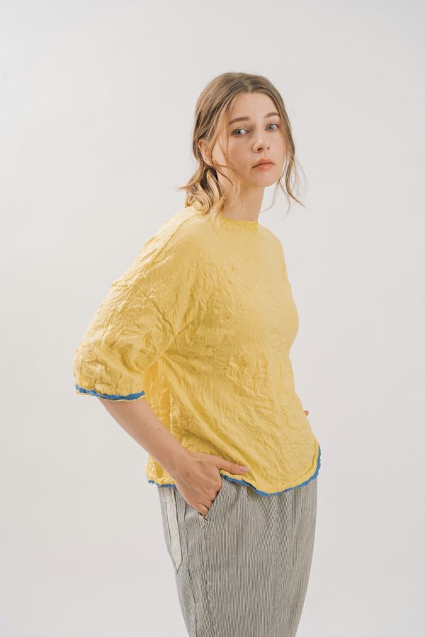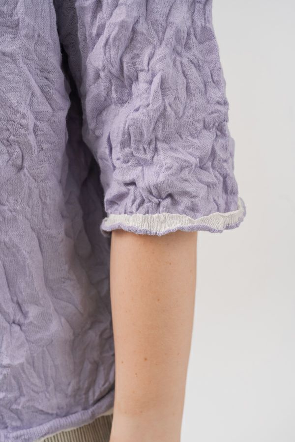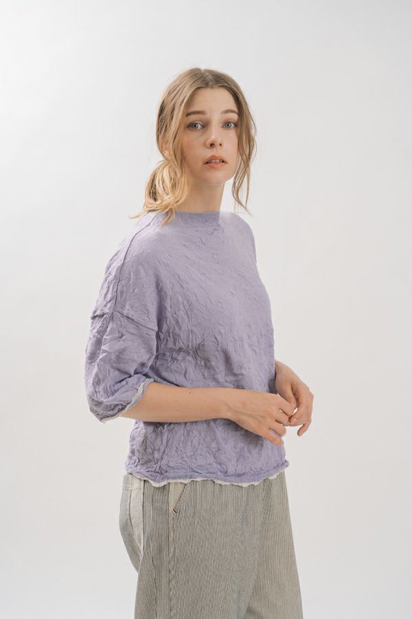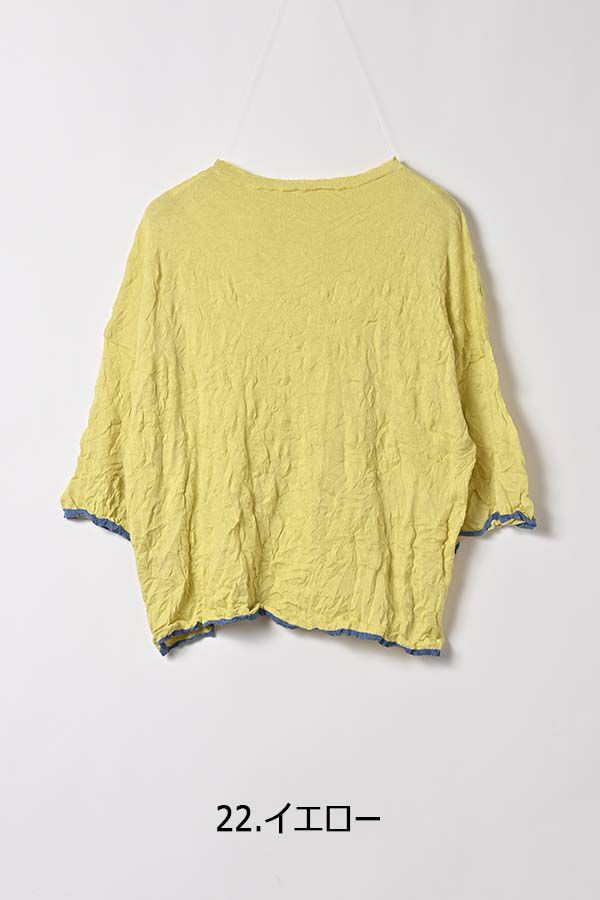 伸びも良く何度も着たい優しい肌触りのシワ加工プルオーバー 肌触りの良い綿ポリエステルの素材で、真夏以外年中着用可能な素材です。チクチクするの素材はイヤ!とおっしゃるお客様には、喜んで頂ける定番ロングランヒットの一着です。お色違いで買い揃えても後悔しません。 今回、お客様のご意見を頂いてお作りした新型ゆったりサイズのボートネック半袖が登場!肌にくっつき過ぎないサイズ感と半袖にすることで暑い時期でも着用していただけるようになりました。元々シワが入っている為、洗いざらしで着れるのも嬉しい。 職人の絶妙な加減で作られているシワ加工製品は一枚一枚のシワの出方が違う希少価値の高い製品です。ランダムに入るシワによって体型が出にくい外観にもなっています。綿とポリエステルの混紡素材で、伸びも良く何度も着たい優しい肌触りです。シワ加工に必ず必要なポリエステルは、ポリステルの特徴である熱に強く一度熱で変形させると元に戻らない性質を利用。ポリステルの混率が高いほどシワ加工のセット性も高くなります。今回ポリエステルの特性を生かして肌に優しい天然繊維の綿素材との混紡素材で市場では少ないシワ加工のセーターを作りました。