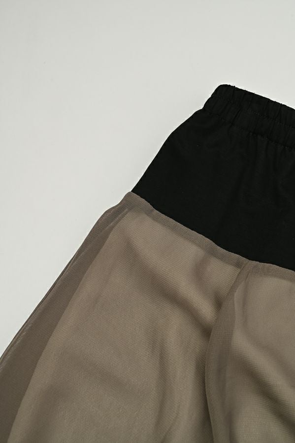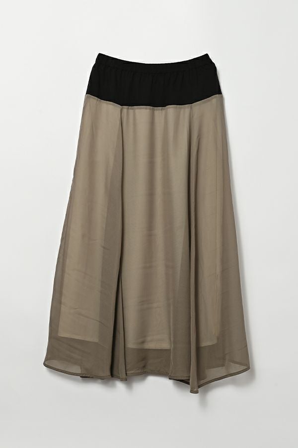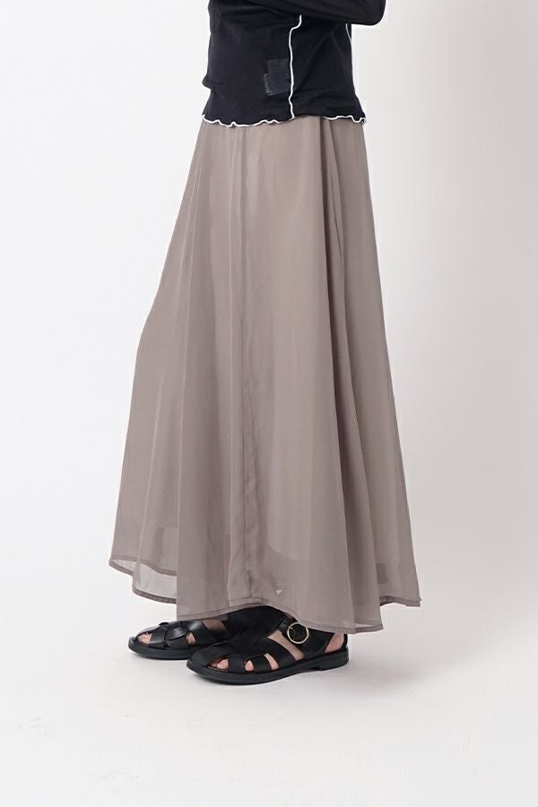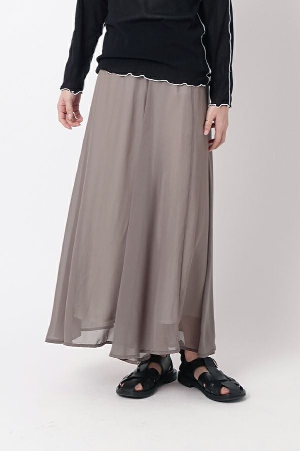 シフォンにワッシャー加工を入れたシンプル上品スカート。 ウエスト部分はカットソーを使用しているので締めすぎない履き心地がポイント。シフォンの裏地は白を使っているので、重くならない軽やかな見た目になります。 カジュアルなトップスやシンプルなプルオーバーに合わせても、さりげなく上品な印象にまとめてくれるお役立アイテムです。