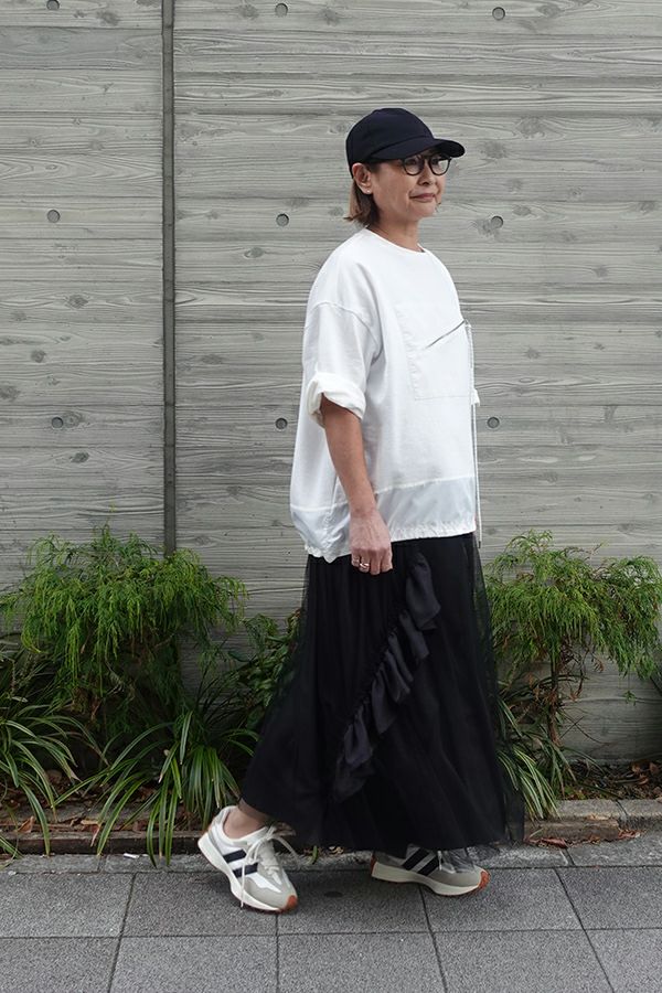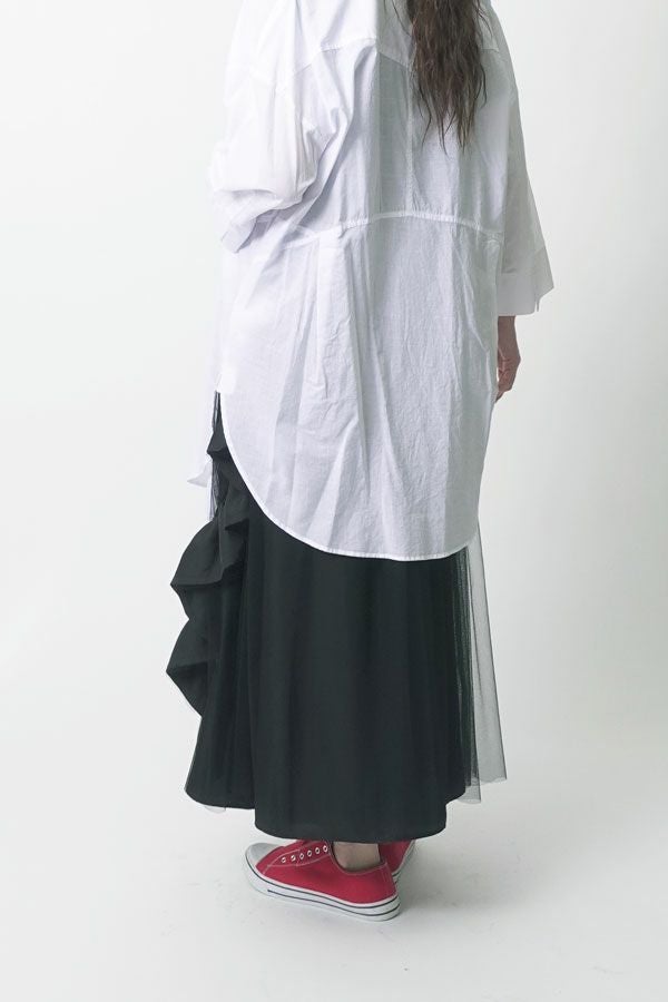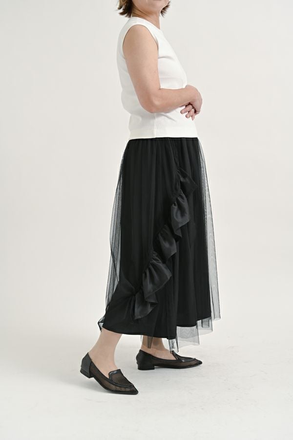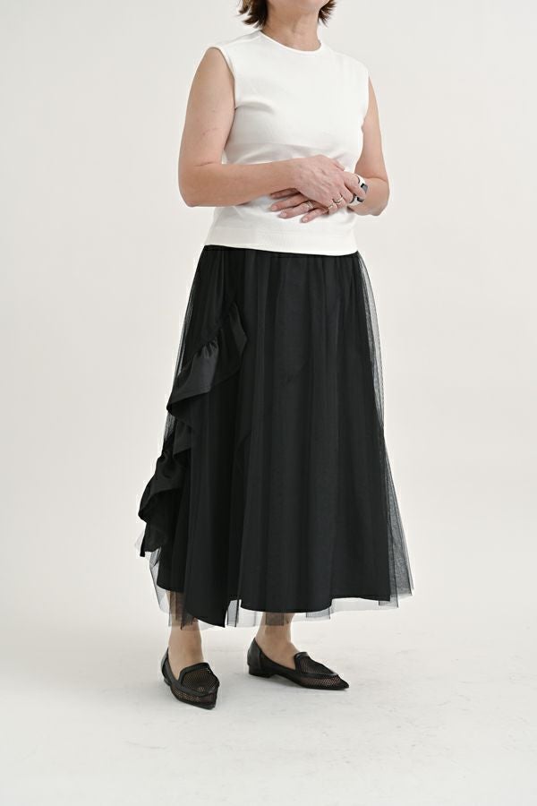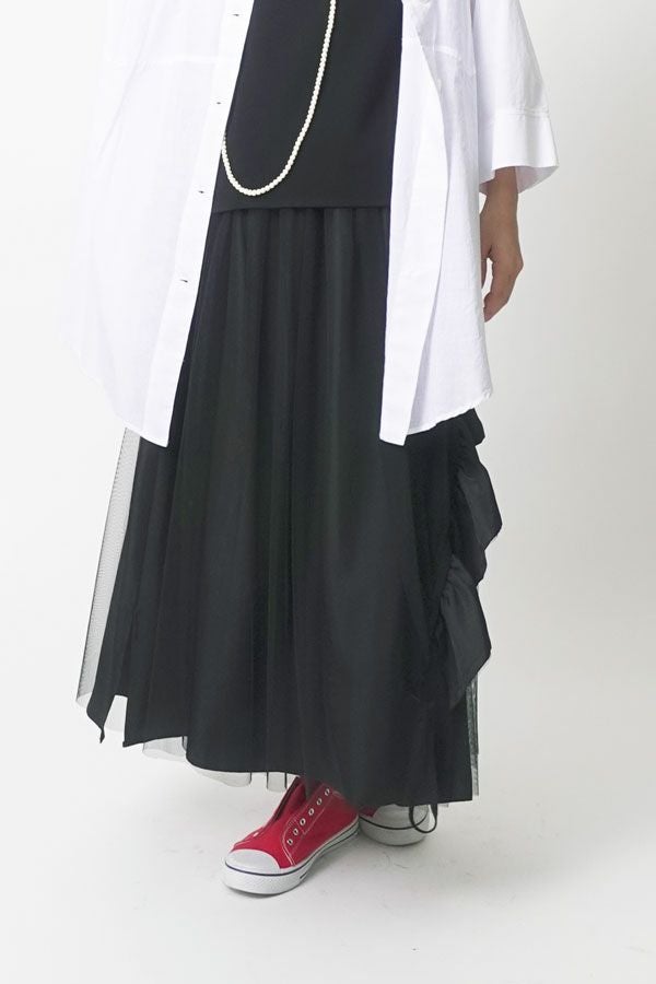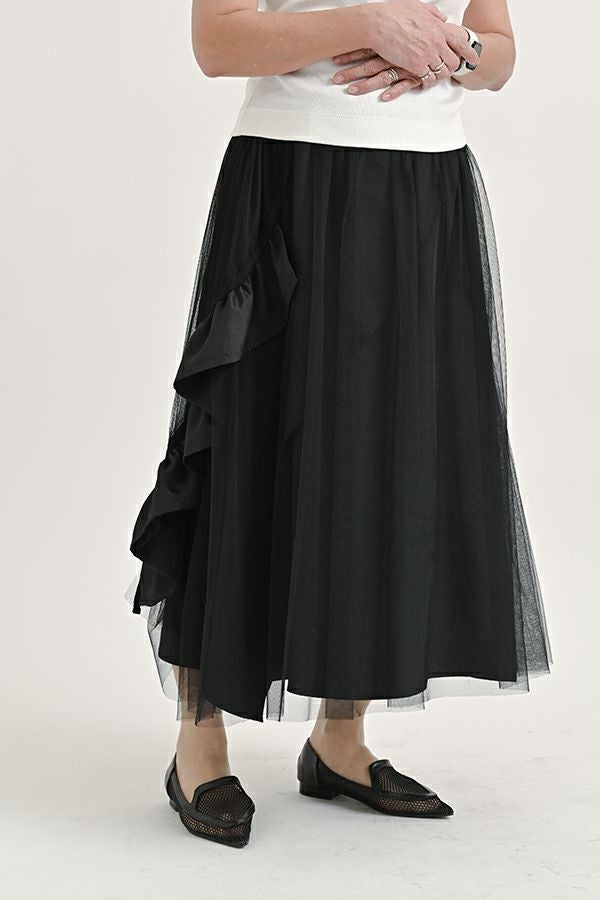 動きのあるシルエットが視線を奪う、大人モードなチュールスカート。 右脇から後ろ裾へと斜めに流れるフリルサテンが視線を惹きつけ、動きに合わせてドラマティックな表情を生むモードなデザイン。フリルの分量感はシャーリング紐で自在に調節でき、アシンメトリーなシルエットでスタイルにエッジを効かせます。 ペチスカートでフェミニンにまとめるのはもちろん、セパレート使いでデニムとレイヤードすれば、洗練された大人カジュアルが完成。1枚でモード感、華やかさ、カジュアルの要素を自在に楽しめる万能アイテム。 遊び心を持ちながらもシックな存在感があり、スタイリング次第で日常から特別なシーンまで幅広く活躍します。 気分やシーンに合わせて何通りものスタイリングが楽しめる一着です。