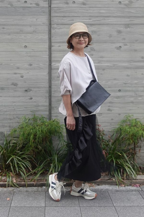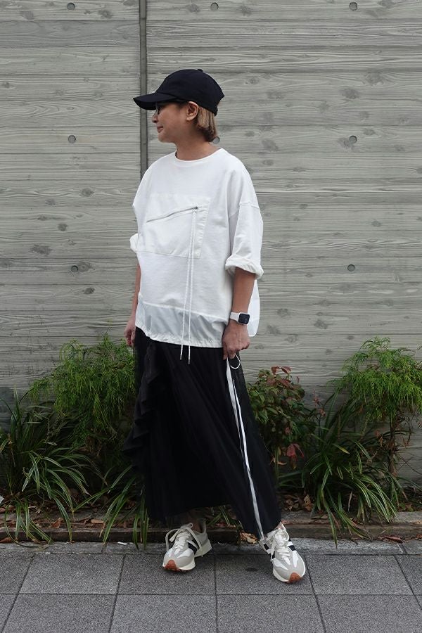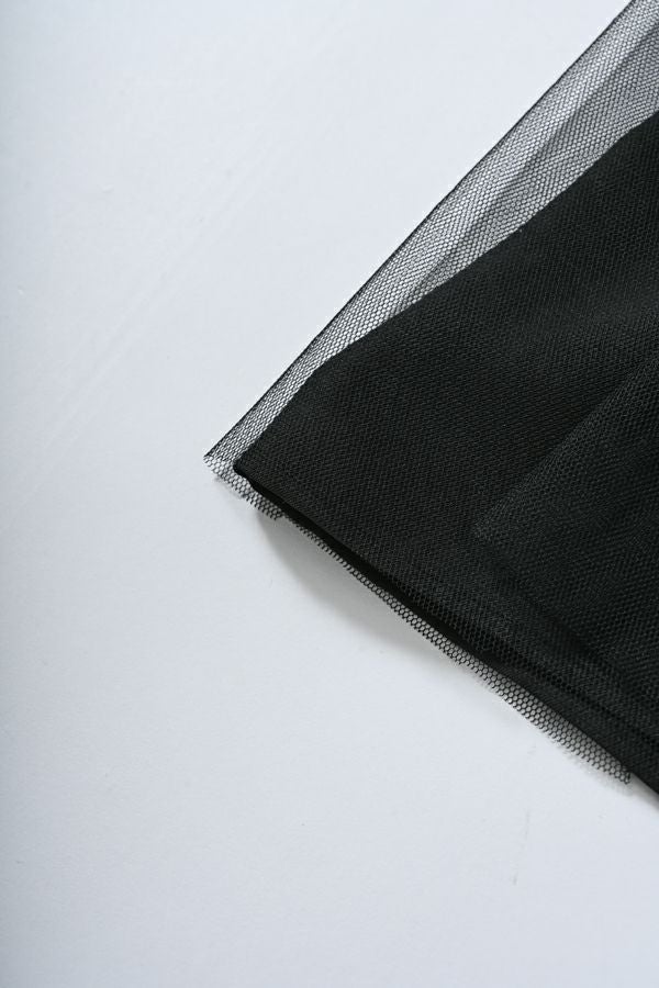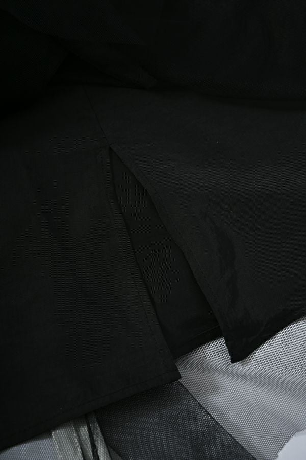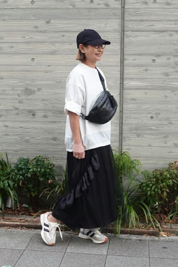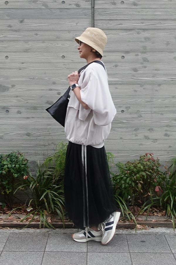 動きのあるシルエットが視線を奪う、大人モードなチュールスカート。 右脇から後ろ裾へと斜めに流れるフリルサテンが視線を惹きつけ、動きに合わせてドラマティックな表情を生むモードなデザイン。フリルの分量感はシャーリング紐で自在に調節でき、アシンメトリーなシルエットでスタイルにエッジを効かせます。 ペチスカートでフェミニンにまとめるのはもちろん、セパレート使いでデニムとレイヤードすれば、洗練された大人カジュアルが完成。1枚でモード感、華やかさ、カジュアルの要素を自在に楽しめる万能アイテム。 遊び心を持ちながらもシックな存在感があり、スタイリング次第で日常から特別なシーンまで幅広く活躍します。 気分やシーンに合わせて何通りものスタイリングが楽しめる一着です。