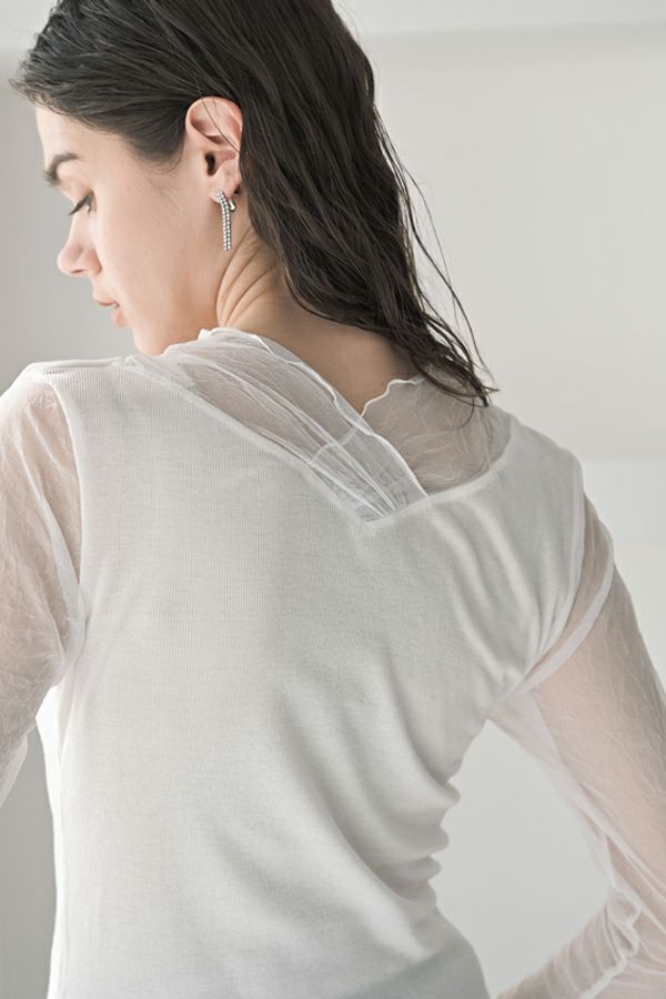 大人のニュアンスは袖に宿る、シアーを纏うロンTEE。 リブ生地とクラッシュメッシュの切り替えで生まれる、さり気ないシアー感。 その透け感が、旬のスタイルを完成させてくれます。 素材には、特殊なアルビニスタシフォンテレコを使用。コットン100%ならではの柔らかなタッチで、肌に優しく寄り添います。 やや長めに仕立てたメッシュ袖は、くしゅっとたくし上げて手元にニュアンスを。 ブレスレットを重ねれば、さりげないアクセントが大人の余裕を演出します 一枚で着ても、ニットやジャケットのインナーとしても映える万能さ。着心地と上品さを兼ね備えた、大人のための必須アイテムです。 ●日本製 【アルビニスタシフォンテレコ】(イタリア糸) → 細番手の綿をテレコ組織で甘く編み下ろし、肌離れの優れたエアリーなタッチと程良い透け感が新鮮な素材の生地。