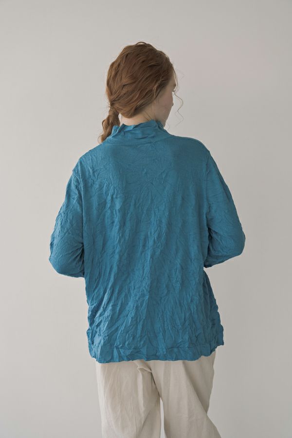ほどよいボリューム、計算されたシルエット。 毎年人気のシワ加工のAラインシルエットのプルオーバーです。 肌触りの良い綿ポリエステルの素材でワンピースやニットのインナーとして着用してもチクチクせずに着心地良い、ずっと頼れる定番アイテム。 衿はゆったりとしたハイネックにボディーラインの出ない程よいゆるさ設定することでインナー感をなくしました。シーズンレスで大活躍のアイテムです。 様々なアイテムのインナーに使いやすいためレイヤードスタイルには欠かせません。さらにレイヤードスタイルだけではなく一枚着でもお楽しみいただけます。 ①洗える! ②薄手でソフト、肌触りが良い ③元々シワが入っている為、洗いざらしのまま着用可能 ④小さくなるのでバックに入り旅行に最適 ⑤旅先やお出掛け先の気温調整にレイヤードで大活躍