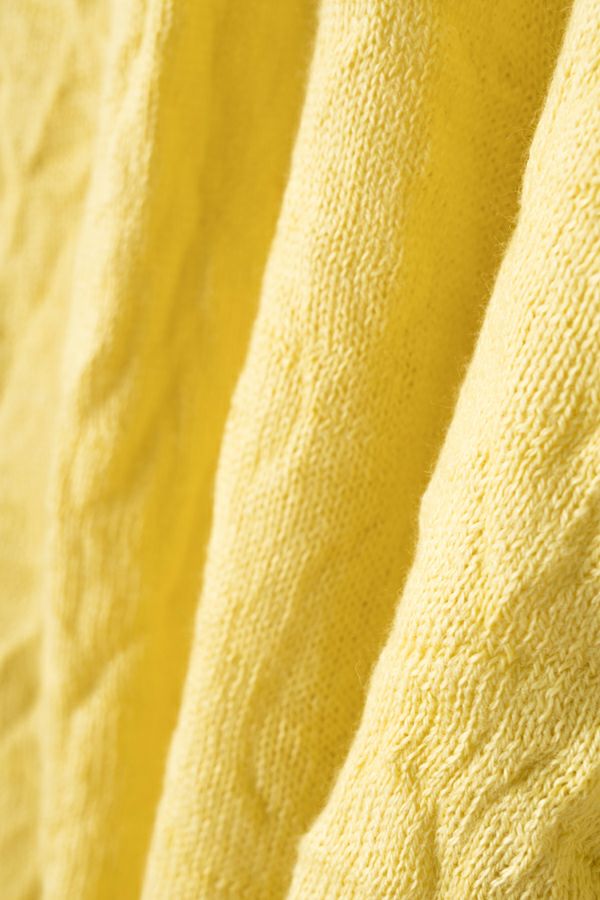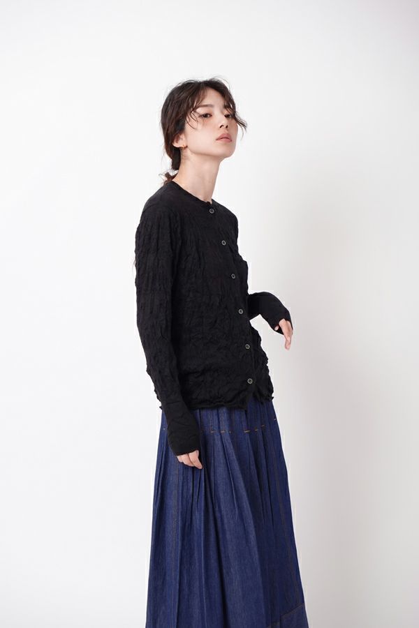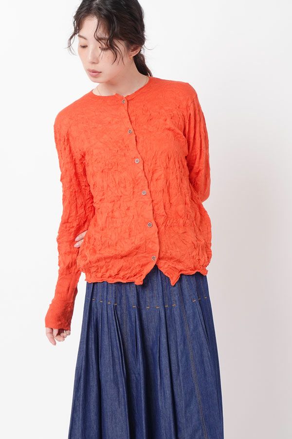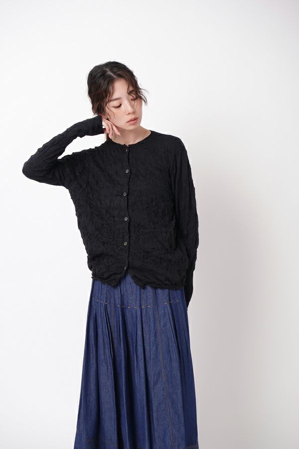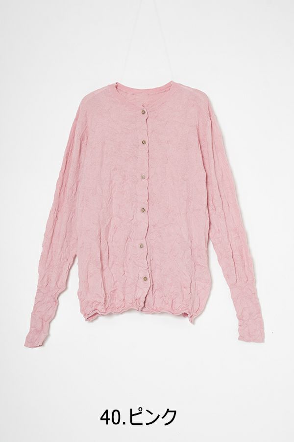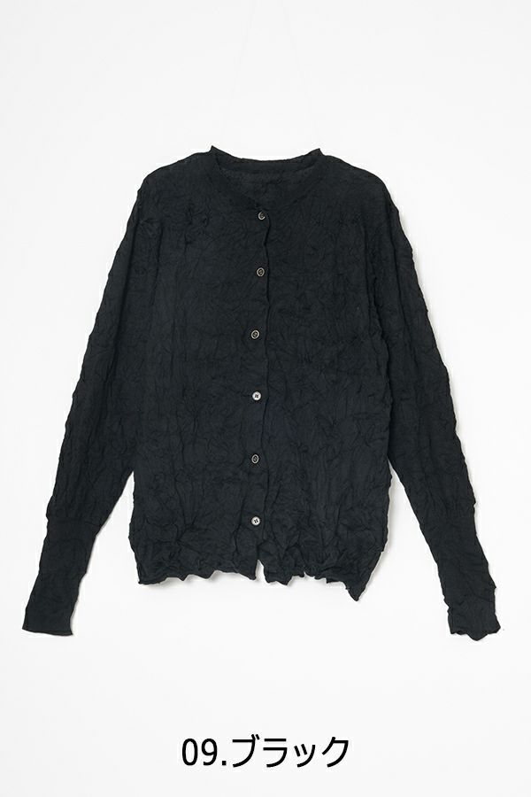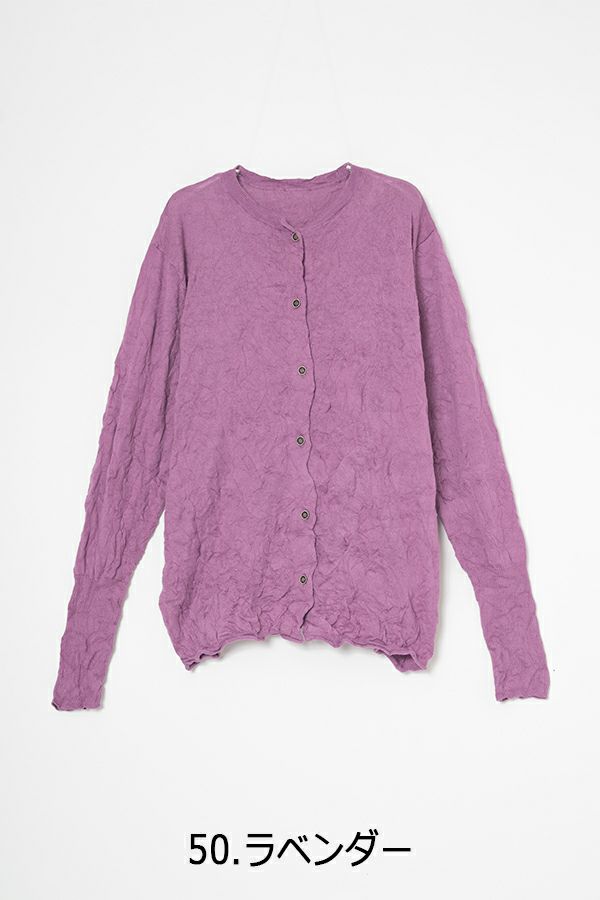 チクチクする素材が苦手な方に好評のロングヒットのカーディガンです。 肌に優しい天然繊維の綿素材との混紡素材で 職人の絶妙な加減で作られているシワ加工製品は、1枚1枚のシワの出方が違う希少価値の高い製品です。 ランダムに入るシワによって体型が出にくい外観にもなっています。 伸びも良く、何度も着たい、優しい肌触りで色々なアイテムの着合わせに最適です。