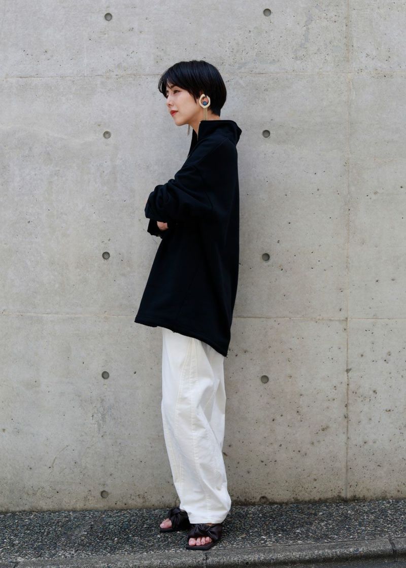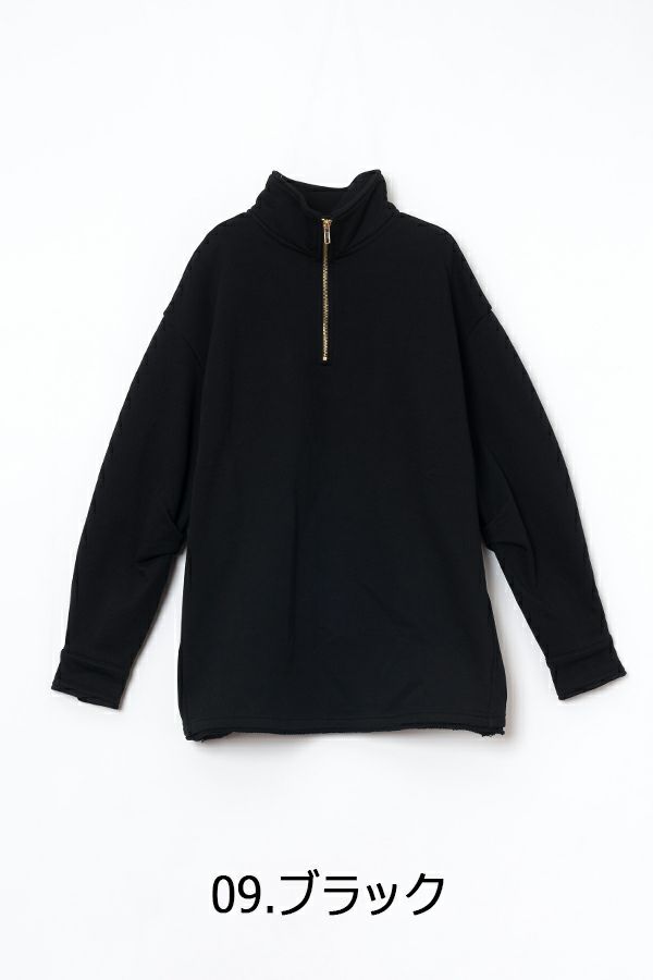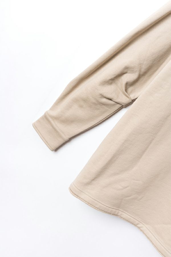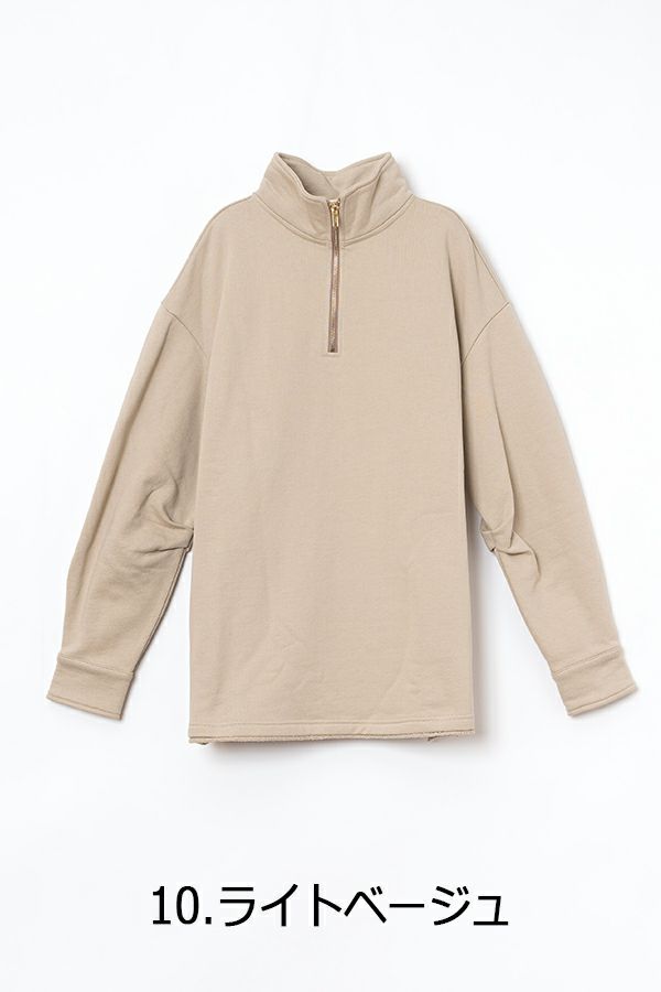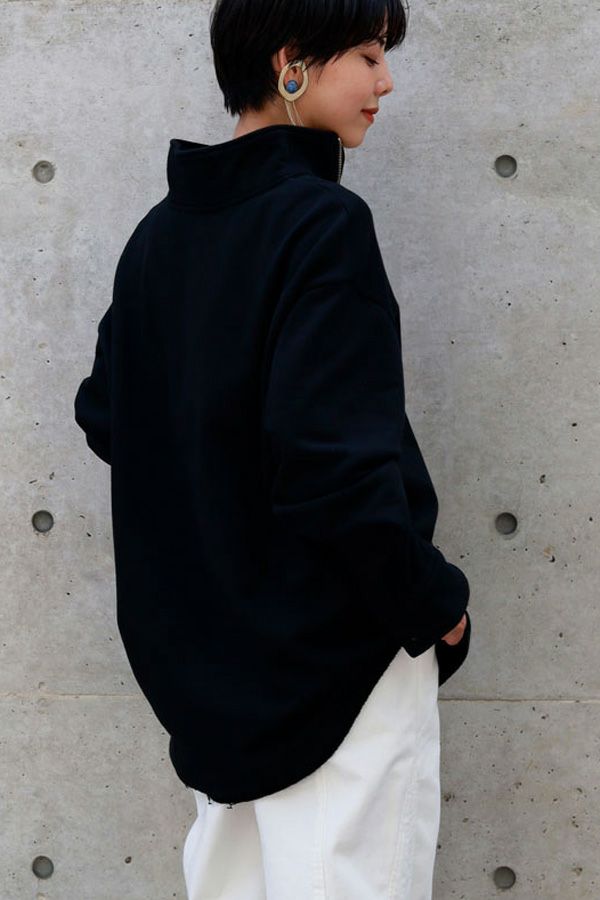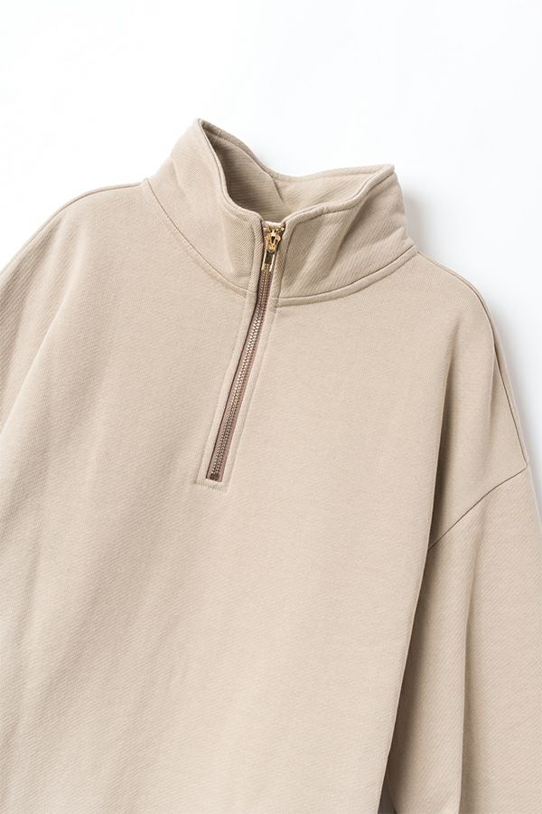 しっかりとしたウェイトの裏毛素材で、カジュアルすぎない印象に仕上げたプルオーバー。 身幅はゆったりしていながら、すとんと落ちるすっきりしたシルエットに。お袖はあまり太くしすぎず、袖口はシャツの様なケンボロ仕様で少しきちんと感もプラス。 ハーフジップの裏にテープをかませて肌に金具が触れないようにしております。スウェットではカジュアルすぎるという方に、オススメのアイテムです。
