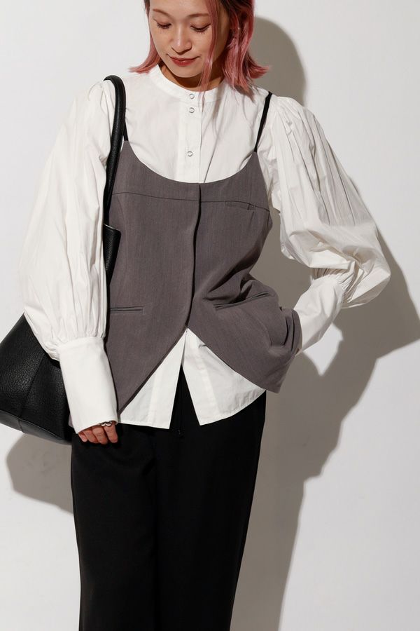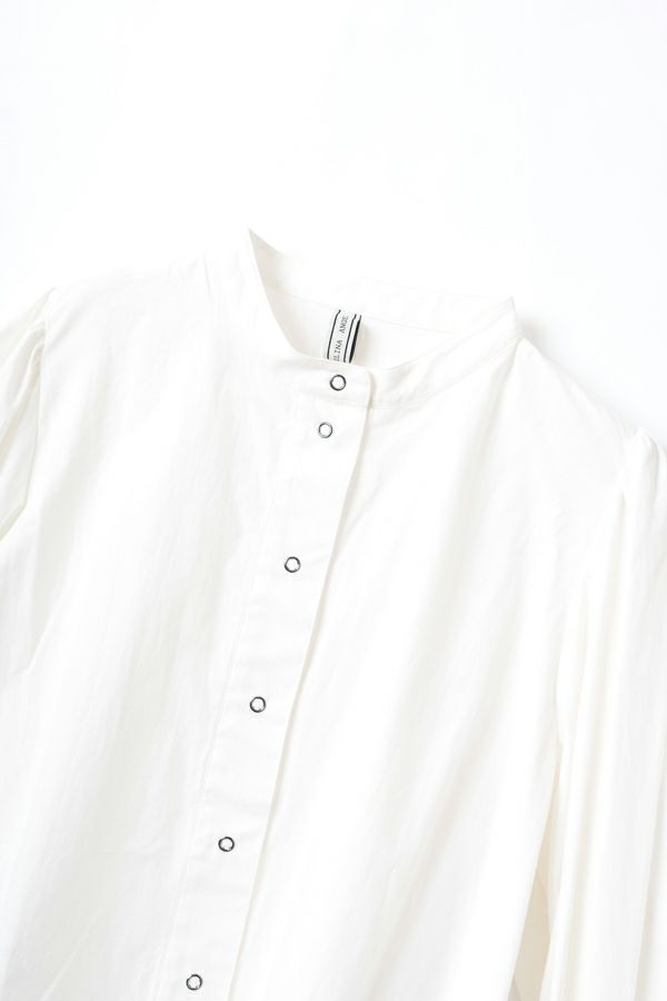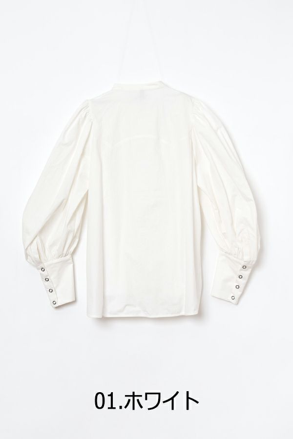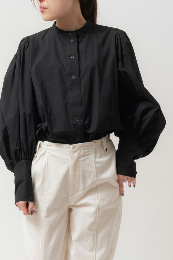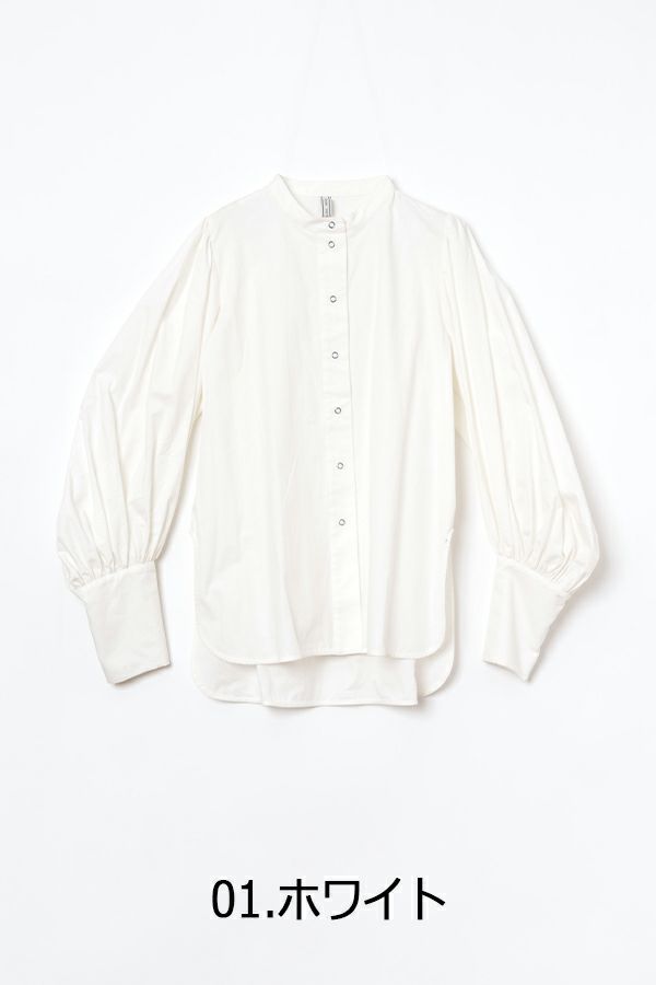 大胆なボリュームのお袖が特徴的なコットンシャツ。 張り感のある素材で構築的なシルエットに。 裾のカーブラインは脇で曲線で繋げて柔らかい印象になり、後ろヨークはウエスティンシャツのカットでワンポイントプラス。 360度どこから見ても抜かりない拘りのシャツです。