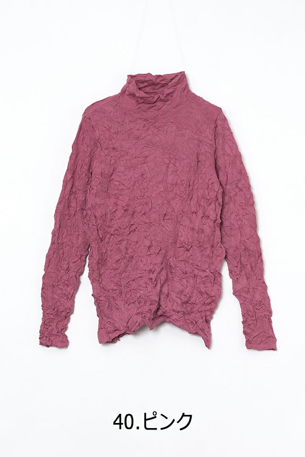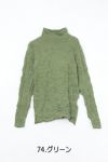 チクチクするの素材はイヤ!とおっしゃるお客様に、大変喜んで頂いている名品カットソー。この秋は、12色展開で登場! 肌触りの良い綿ポリエステルの素材で、真夏以外年中着用可能な素材です。お色違いで買い揃えても後悔しません。 職人の絶妙な加減で作られているシワ加工製品は一枚一枚のシワの出方が違う希少価値の高い製品です。 ランダムに入るシワによって体型が出にくい外観にもなっています。伸びも良く何度も着たい優しい肌触りです。衿の高さは、高すぎず低すぎない実用かつ、オシャレに着こなせる衿元を実現。色々なアイテムの着合わせに最適です。 綿とポリエステルの混紡素材で、ソフトな肌触り。シワ加工に必ず必要なポリエステルは、ポリステルの特徴である熱に強く一度熱で変形させると元に戻らない性質を利用。 肌に優しい天然繊維の綿素材との混紡素材で市場では少ないシワ加工のセーターを作りました。