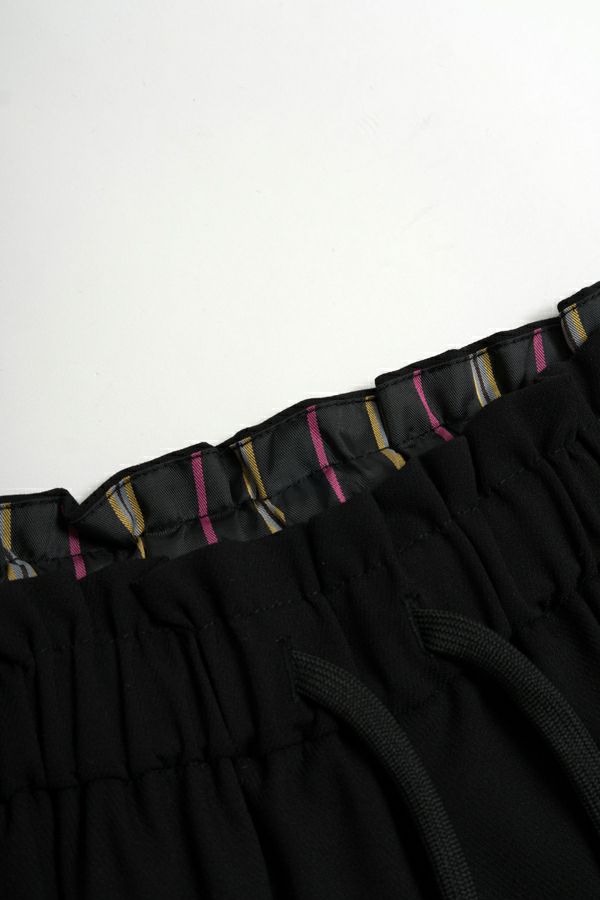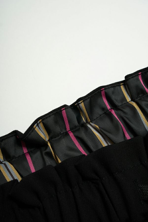 ヒップ周りはゆったりさせ、太ももから裾にかけては少しボリュームを抑えてスッキリさせたシルエットです。 ウエストに紐がついているので、ウエストの調節も可能。 シンプルな中に、ベルト裏はカラフルなストライプ使いで少し遊び心を取り入れています。 きれいめ素材なのに、お手入れがラクチンで手洗い可能です。