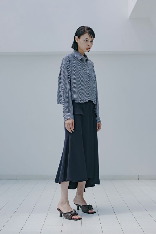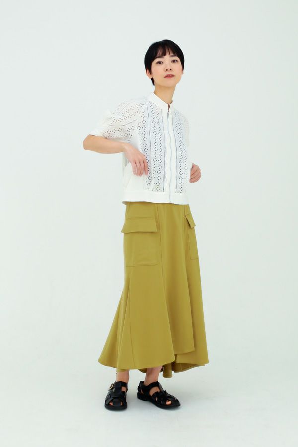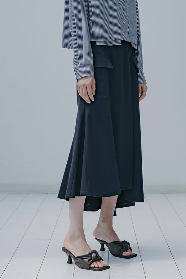 アシンメトリーヘムでANGELINAっぽいミリタリーディティールのマーメイドスカート。 左前のベンツ開きがポイントです。後ろウエストはゴムが入っているのでアジャスト可能です。ショート丈のジャケットやブルゾンと合わせたスタイリングがおすすめです