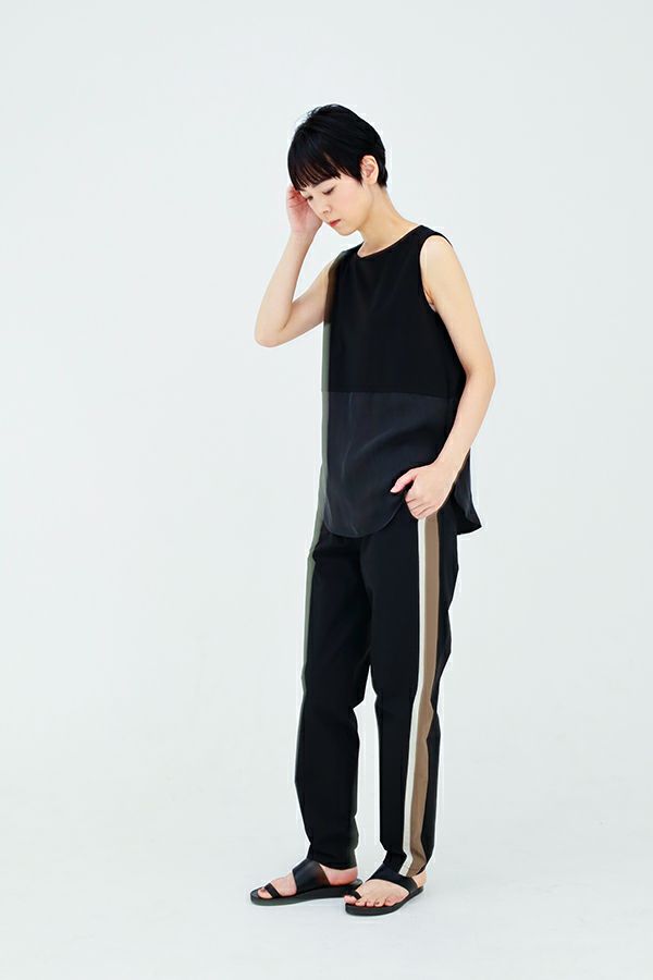 人気のあったロングスリーブのノースリーブVer.。 しっかりした肉感のポンチと上質なハリと上品な光沢感を持ったキュプラの素材をドッキングさせました。きれい見えするのでオケージョンにも着用できる1枚です。