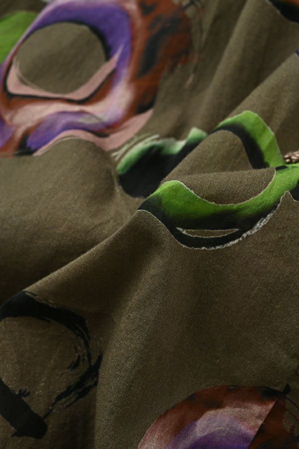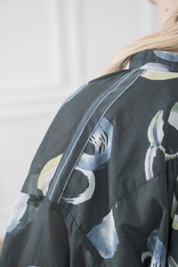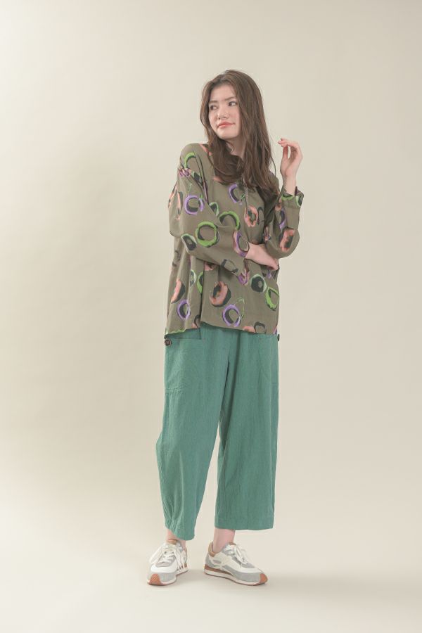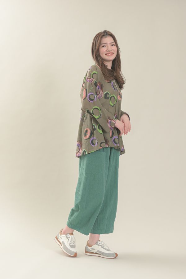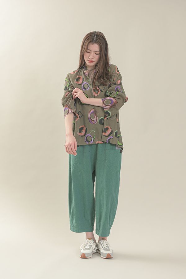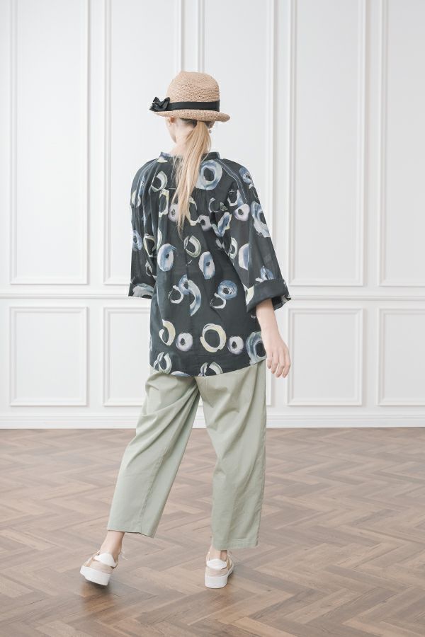 akaneオリジナルのサークルドットプリントは清涼感のある、ゆったりとしたAラインブラウスです。 部分的に使った3つの素材が効果的です。 衿元と後ろのギャザー、紐(ドローストリング)でゆるふわフォルムを楽しめます。 大きく開いた前のスリットは首を長く見せ、太めの袖は動きやすく腕をスッキリ感じさせます。 ヒップが隠れる丈なのでパンツ合わせがGOOD!