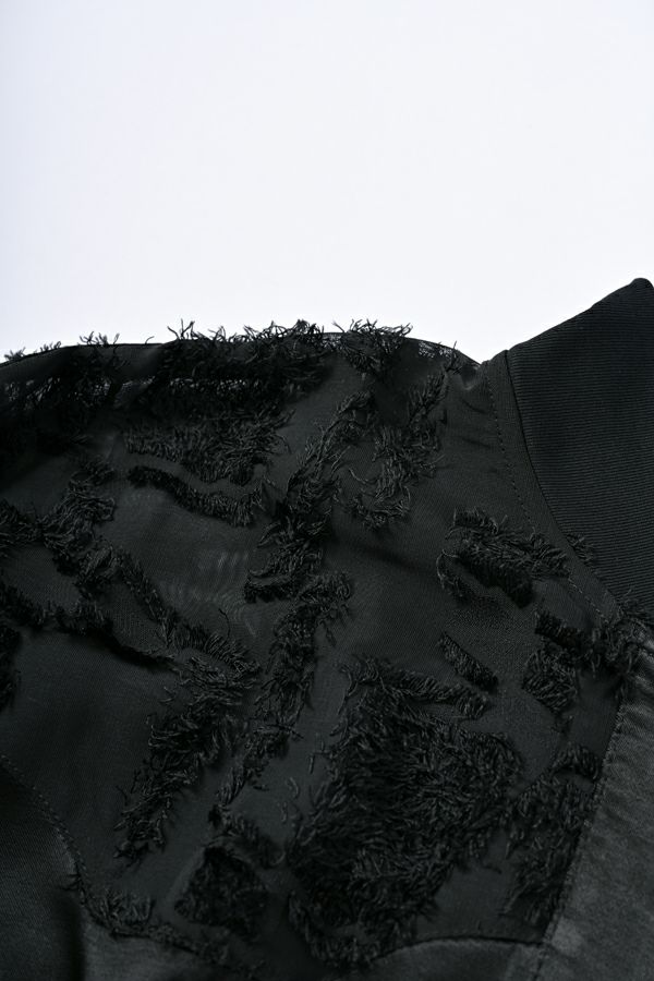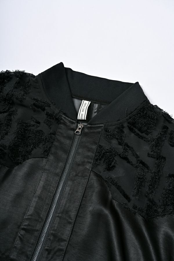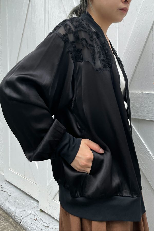 浮きたつジャガードが印象的な大人っぽいサテンブルゾン。 人気のカットジャガードシリーズにブルゾンが登場!単調になりがちなサテンのブルゾンですが、シアーなジャガード素材を組合わせることで動きのある表情をプラス。 ウエスタン調に切替えた肩部分に透け感があるので女性らしい印象に。一味違ったブルゾンで新鮮な着こなしをお楽しみください。ブルゾンとしてだけでなくトップスとして透け感を活かし、タンクトップやキャミソールでヘルシーに着こなすのもおすすめです!