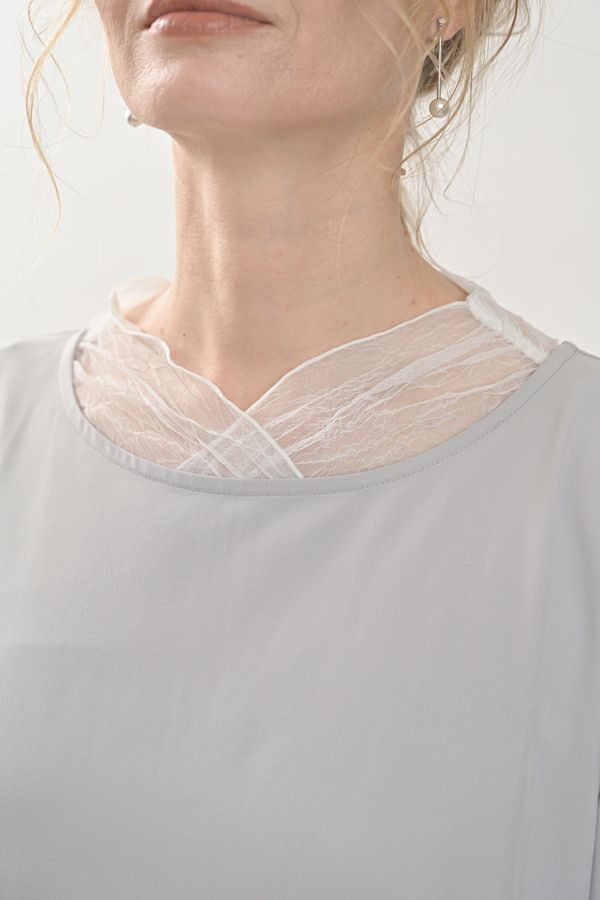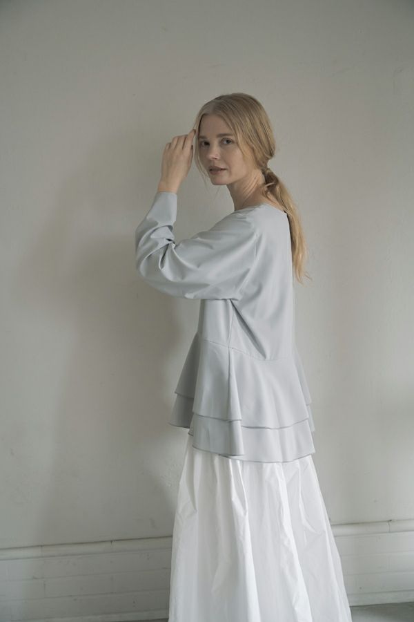 裾部分に2枚重ねたフリルが素敵なブラウス。 腰のラインに2重に重ねてボリューム感があるので、タックパンツなどにあわせてもお腹周りが目立ちにくいのも嬉しいポイント。落ち感のある素材で、サラリと肌馴染みも良くノンストレスに着て頂けます。衿元は緩めに開いているので、女性らしい印象に。 キレイめのパンツを合わせて、オケージョンやオフィスカジュアルにも使えます。衿元が気になる場合は、インナーにメッシュプルオーバーを合わせてレイヤードでも楽しめます。 ジャケットやニットカーデを羽織った時に、前あきの裾から見えるフリルで より上品なスタイリングが叶います。