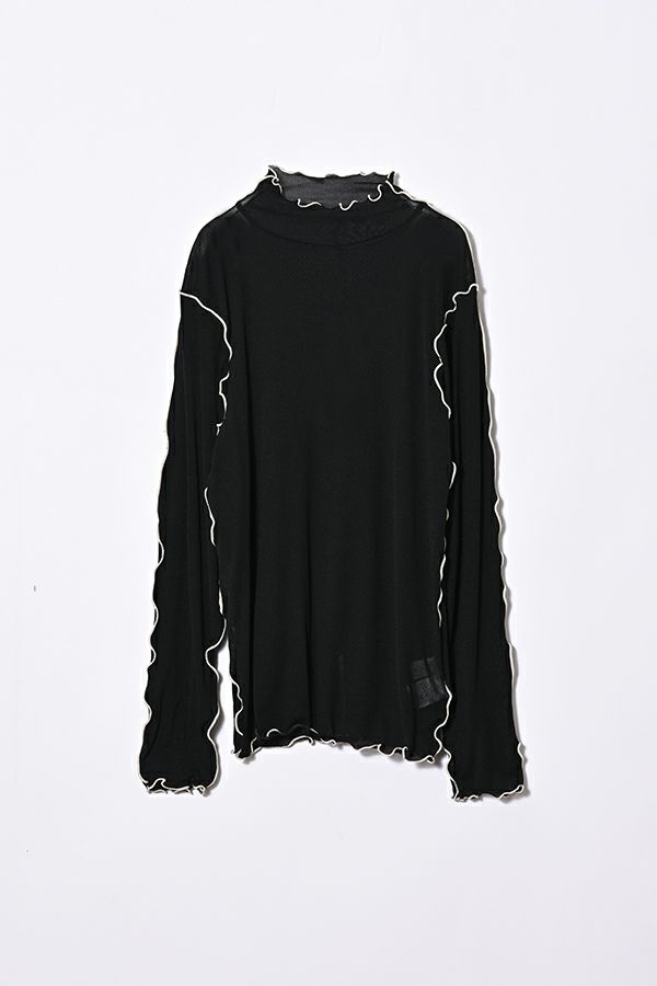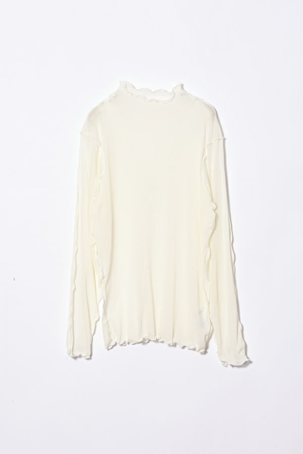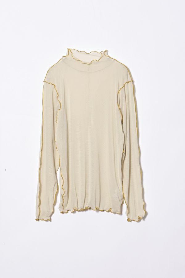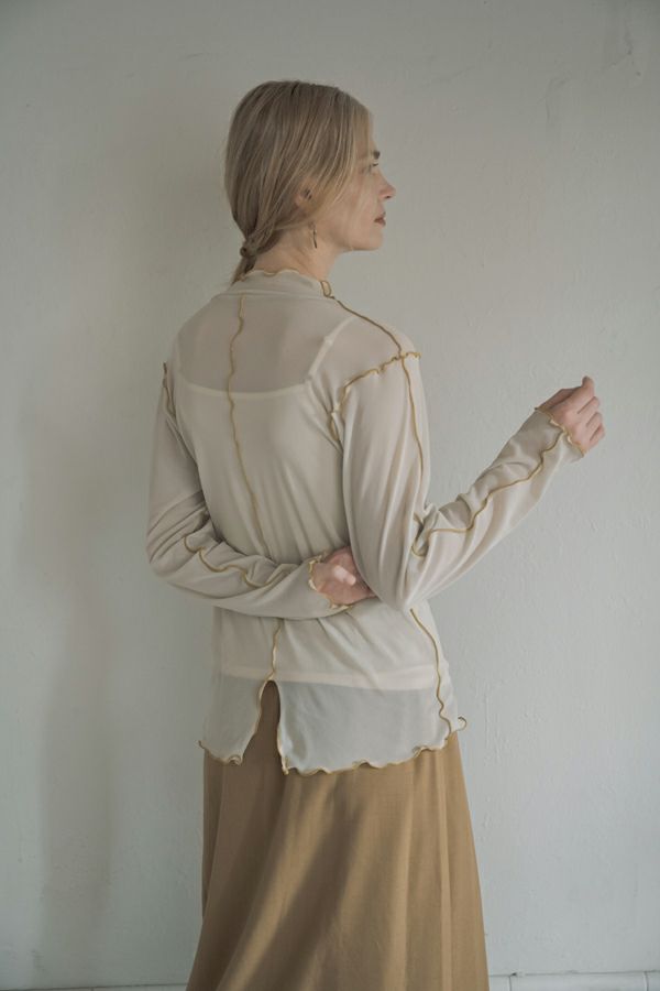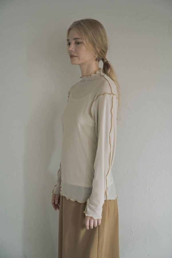 シンプルなデザインが魅力のシアーハイネックプルオーバー。 コンパクトなシルエットと後ろに入ったスリットで大人の抜け感を演出。ソフトで優しい風合いのメッシュ素材を使用し、配色のメロウステッチがシンプルな中にモード感漂うデザインアクセントになっています。 通常のインナーメッシュタイプより 身頃を少しゆったりめのシルエットにすることで、よりカットソーブラウスとして着用しやすい一枚です。 キレイめなジャケット合わせはもちろん、カジュアルなスウェットやロンTEEのインナーに使ったり、メンズライクなシャツのインナーに合わせて華やかさを出すスタイリングもおススメです。