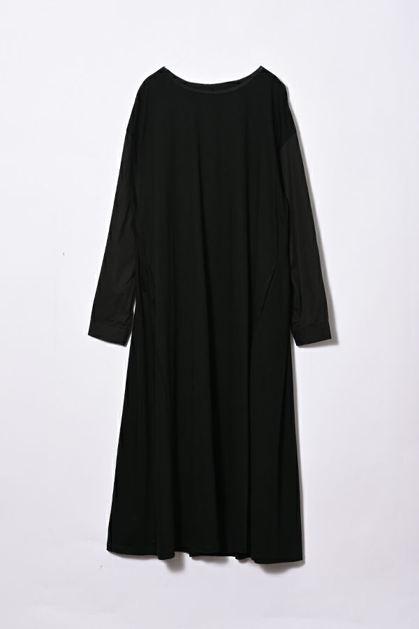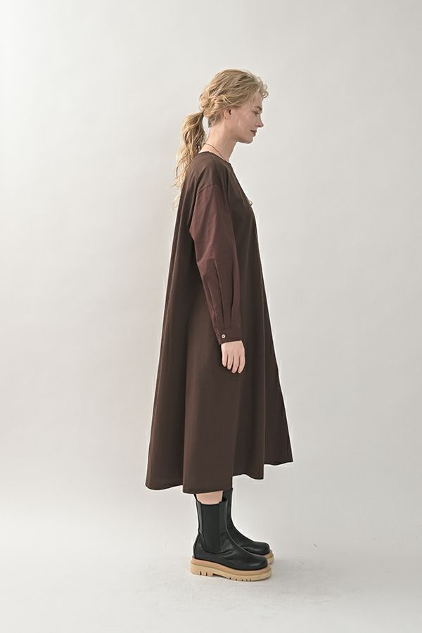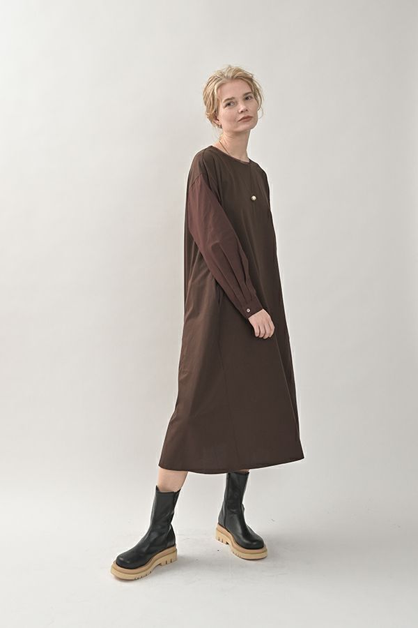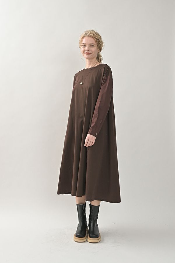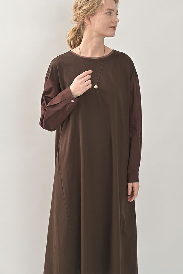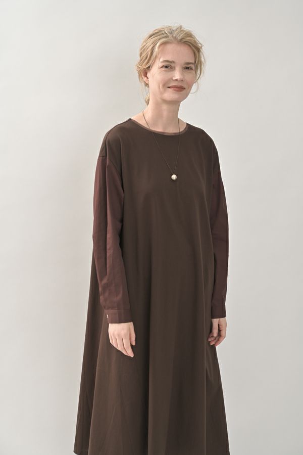 飾らない女性らしさと心地よい着心地を兼ね備えたワンピース。 今夏に大好評!Aラインカットソーワンピースの秋冬バージョンが登場です。動きやすく透け感のないシルケット(光沢加工)カットソー素材×ハリ感のある綿シャツ素材の組合わせです。 衿元のチュールアクセントが軽く優し気な印象に。前を縦に切替えて脇が後ろにつながったフレアーは、歩くたびにふわりと揺れ動きエレガントさを演出。 袖は布帛を使い、シャツ仕様にすることでカジュアルダウンし過ぎないキチンと感を出しています。ブラウスを重ねるのがバランス良く好相性です。