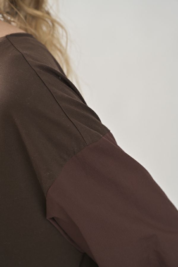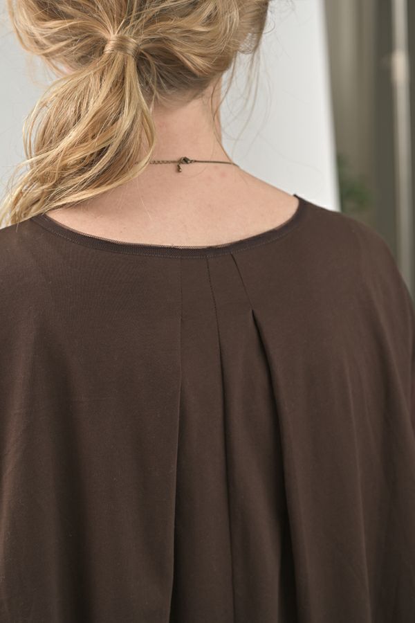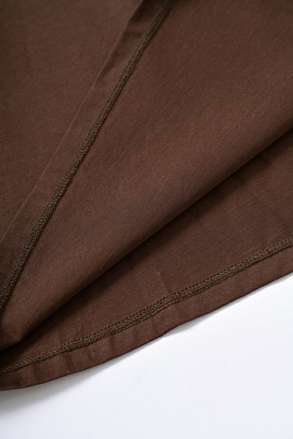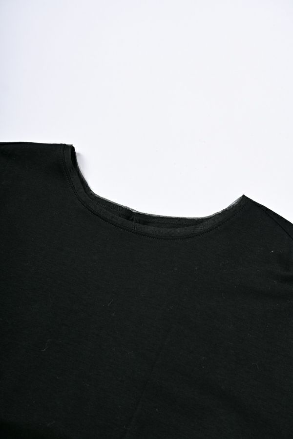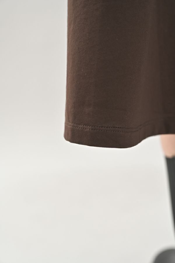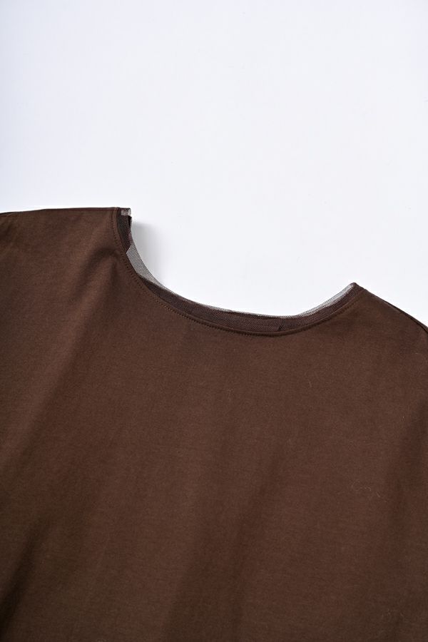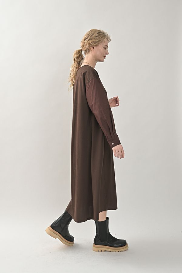 飾らない女性らしさと心地よい着心地を兼ね備えたワンピース。 今夏に大好評!Aラインカットソーワンピースの秋冬バージョンが登場です。動きやすく透け感のないシルケット(光沢加工)カットソー素材×ハリ感のある綿シャツ素材の組合わせです。 衿元のチュールアクセントが軽く優し気な印象に。前を縦に切替えて脇が後ろにつながったフレアーは、歩くたびにふわりと揺れ動きエレガントさを演出。 袖は布帛を使い、シャツ仕様にすることでカジュアルダウンし過ぎないキチンと感を出しています。ブラウスを重ねるのがバランス良く好相性です。