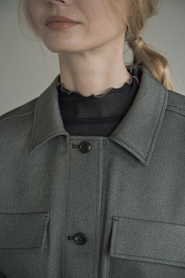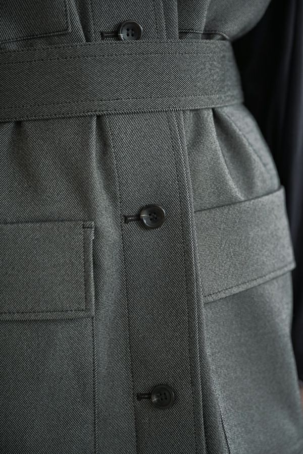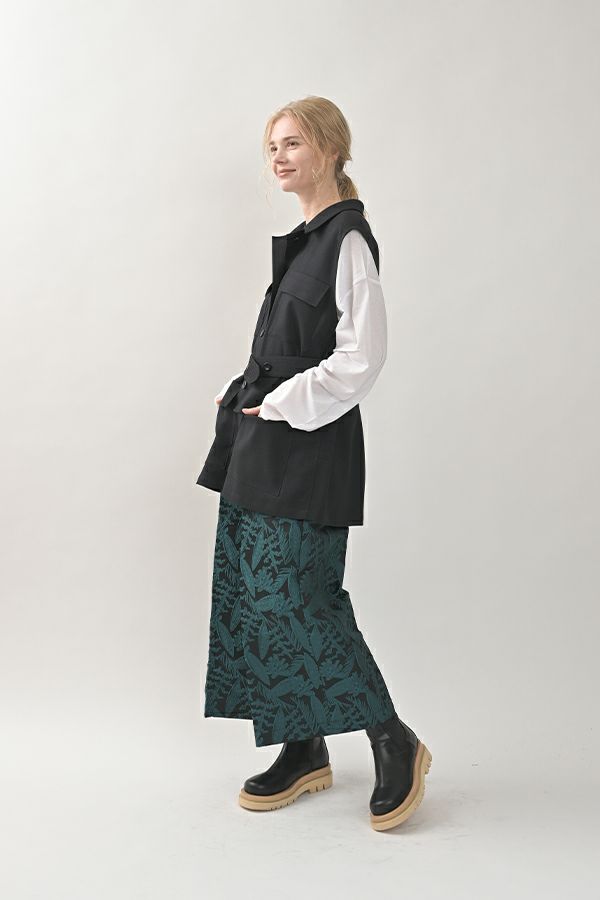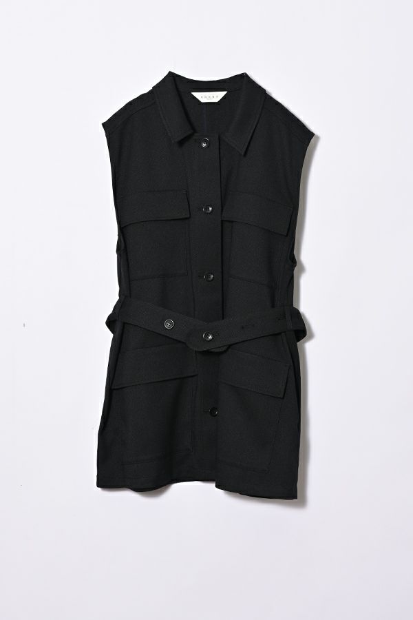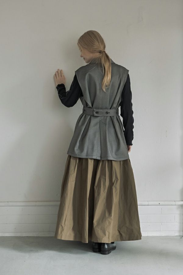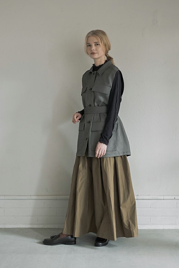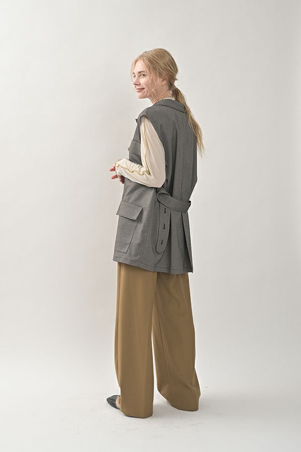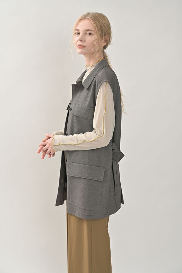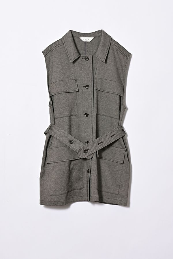 旬のワークテイストなディテールを取り入れたジレベスト。 ポリエステル100%のサラッとした着心地でインナーに合わせる素材を選びません。 トレンドの大きめなボックスポケットに、きれいめなステンカラーのデザインを組合せることで、カジュアル過ぎずクリーンな印象に。 ウエストには取り外し可能なベルト付きで、ベルトを前にも後ろにも留める事が出来き、絞ると よりスタイルアップ見えします。後ろアームにタックを入れて、コクーン型のバックシルエットもデザインポイント。 シャツやブラウスを合わせた上品な着こなしはもちろん、シンプルなTシャツを合わせてカジュアルに着こなすのもおすすめです。甘めのテイスト合わせにも相性が良く、スタイリングに上品さがプラスされます。 ●日本製生地使用