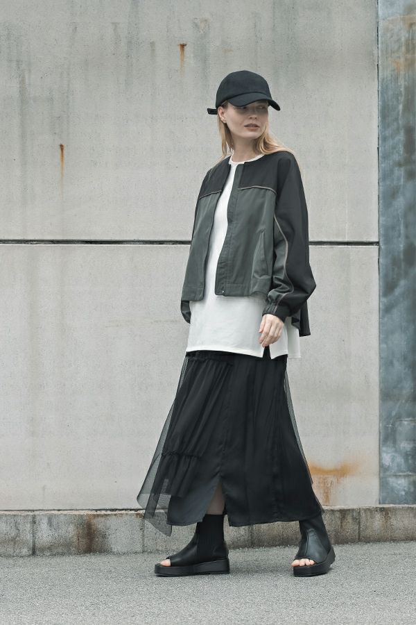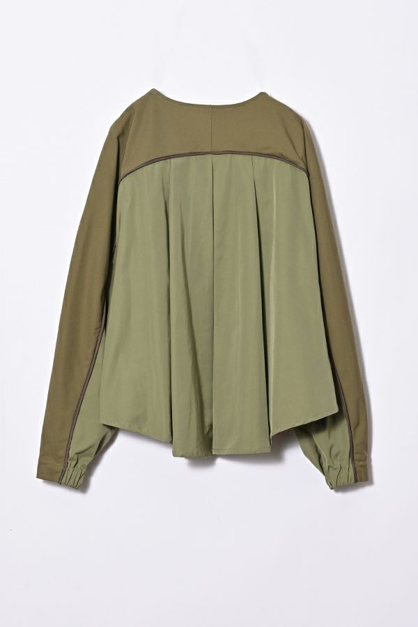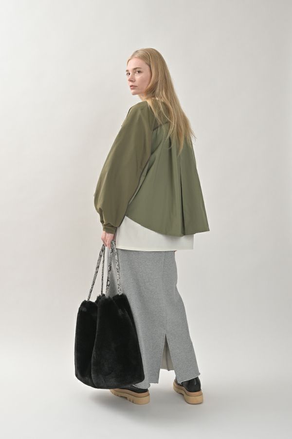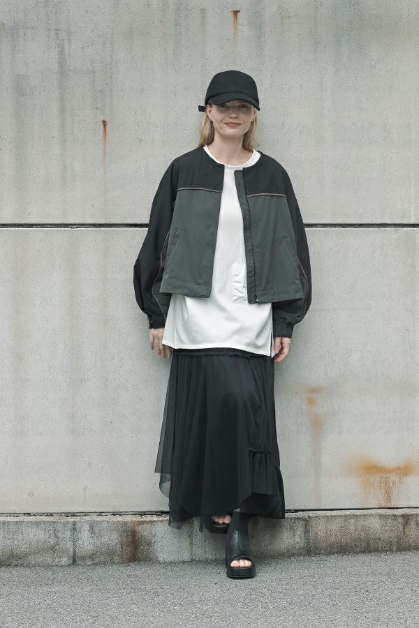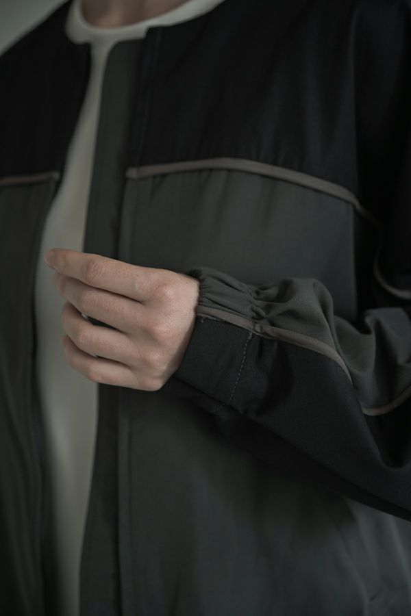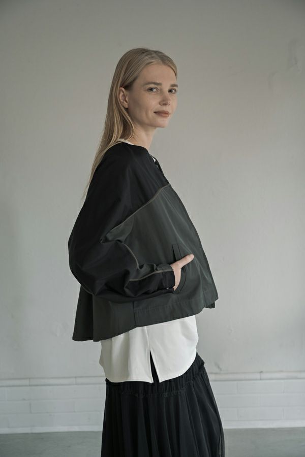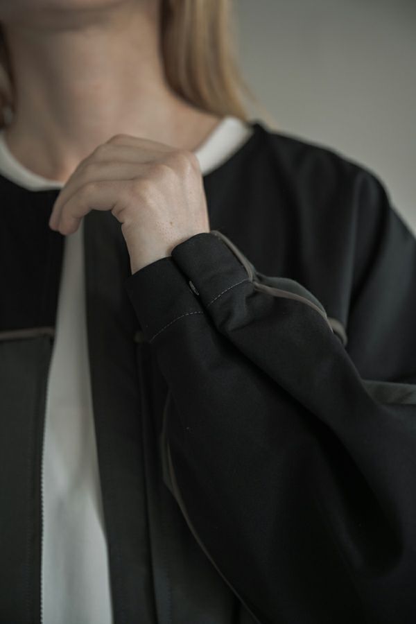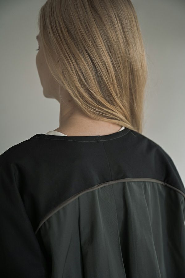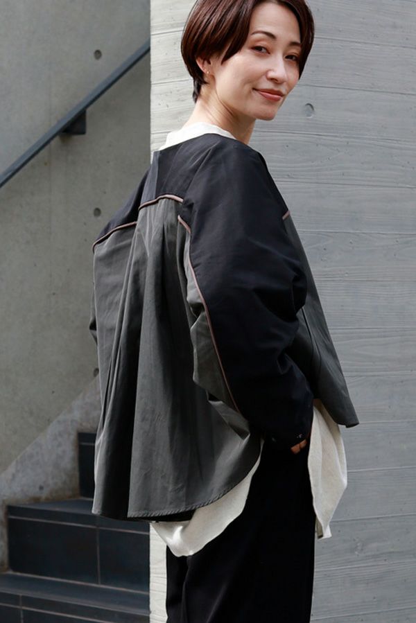 女性らしいシルエットと2トーン配色が効果的なデザインジャケット。 前はショート丈でスッキリ見せ、後ろ下がりのシルエットはボックスタックとタックの組合せでヒップが隠れるデザインに。肩にアームホールの縫い目のないエポーレット袖で、身頃の切替えにコードの入ったパイピングがシャープさと、袖のボリューム感がモードっぽさを表現。袖口も拘りが溢れたデザイン仕様です。 合わせるボトムによってモードにもきれいめにも対応できる優秀アウターです。