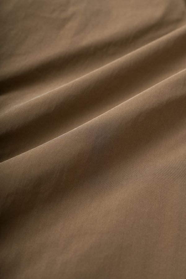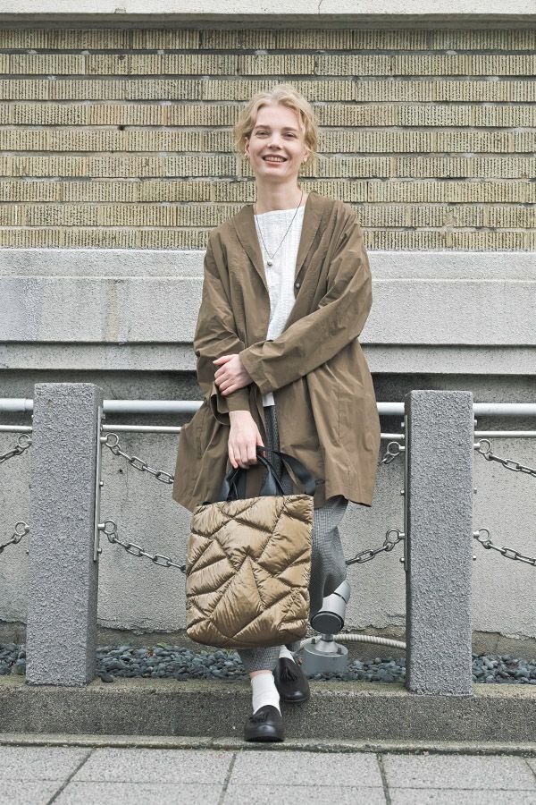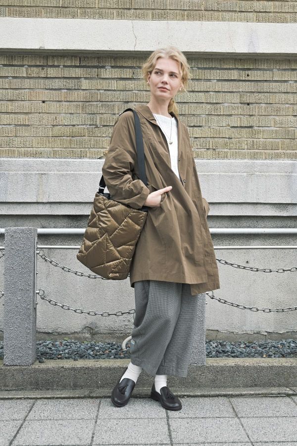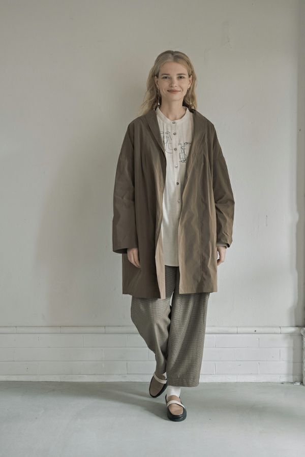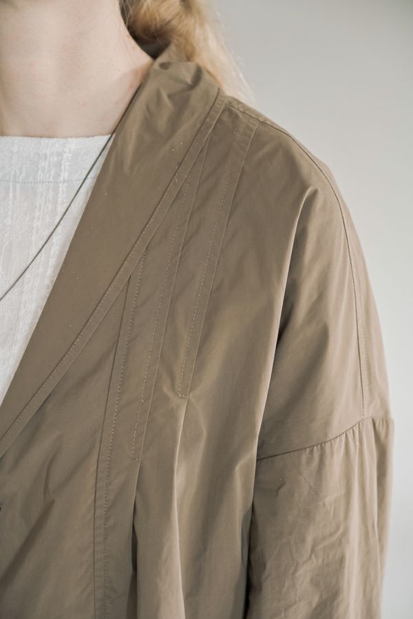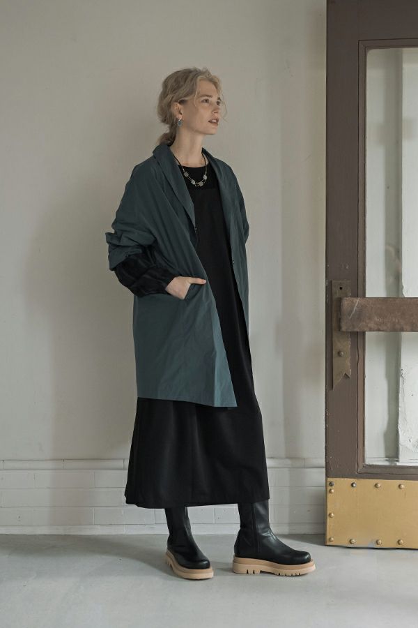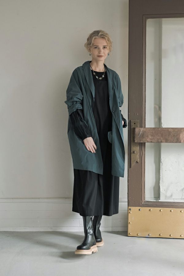 上品な光沢感が大人の着こなしに映えるドレープコート。 微光沢でハリ感のあるタフタ素材は、サラっとした風合いで 風を通さずシーズン通して快適に着用出来ます。反発感もあるのでシワにもなりにくい特徴もある優れもの。 ゆったりサイズなので、厚手でのセーター合わせも問題なし。パサっと羽織って"大人の抜け感"漂う着こなしが出来ます。