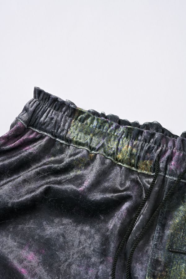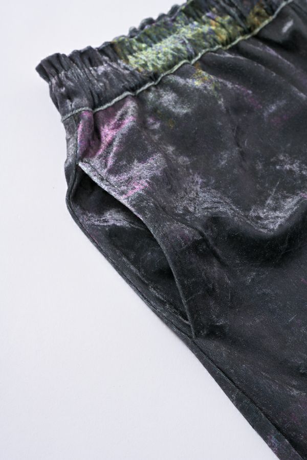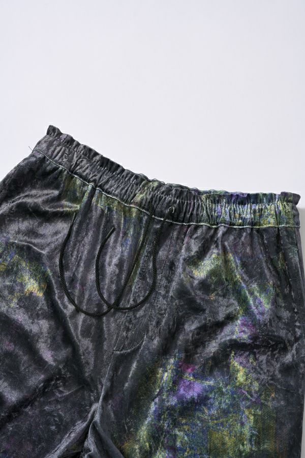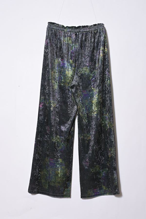 インパクトがありながら洗練された印象のプリントパンツ。 ANGELINAオリジナルのキャンバス柄を大胆な色合いで、テロっと落ち感のあるベロア生地にプリントしました。ムードあるブラックはモード感を出してくれます。 奇抜なイエローピンクは一気にコーディネートの顔となる一着に! ワイドストレートシルエットで、ウエストはゴム仕様+コード付きでサイズ調整可能なイージーパンツです。 ワンピースやスカートとレイヤードさせ、裾からチラ見せするだけでワンランクUPのスタイリングに。