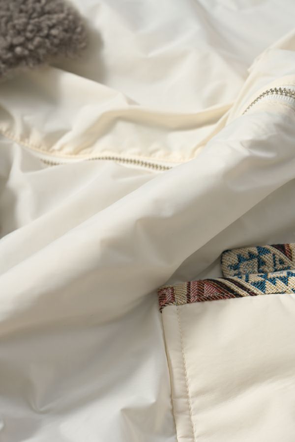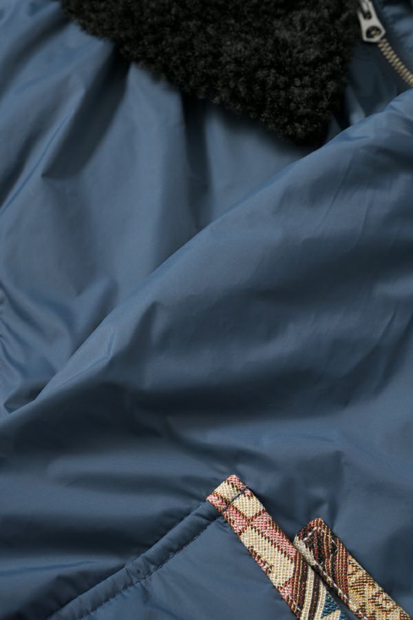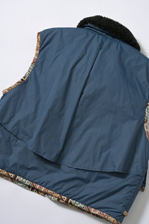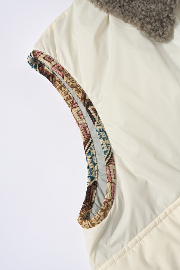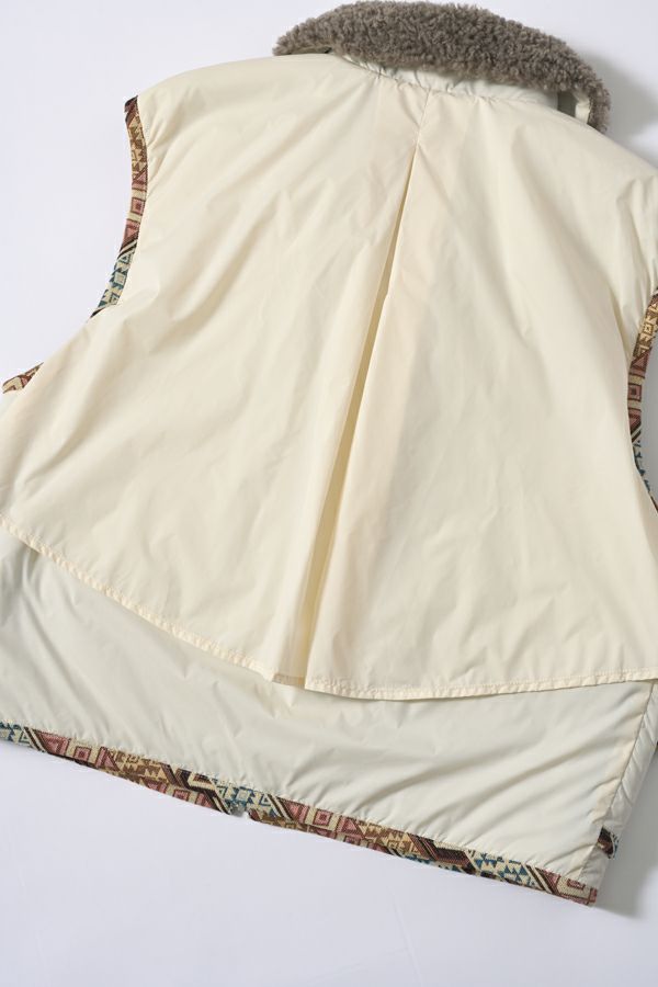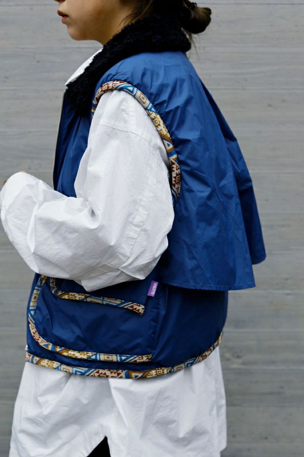 エッジの効いたパイピングが目を惹くコンパクトなベスト。 襟ぐりにギャザーを施し、ネイティブ柄のパインピングを太めに使用し雰囲気のあるデザインに。大きめのポケットはボタンを外さなくても脇から手が入る仕様にしています。ラフにロングTシャツやワンピースにも合わやすいアイテムです。 シンサレートという機能綿を使用し、中綿のゴワつきを抑えています。従来の中綿よりも薄手で、保温性があり湿気も逃す優れた綿です。「暖かいのに、厚くない」を可能にしています。