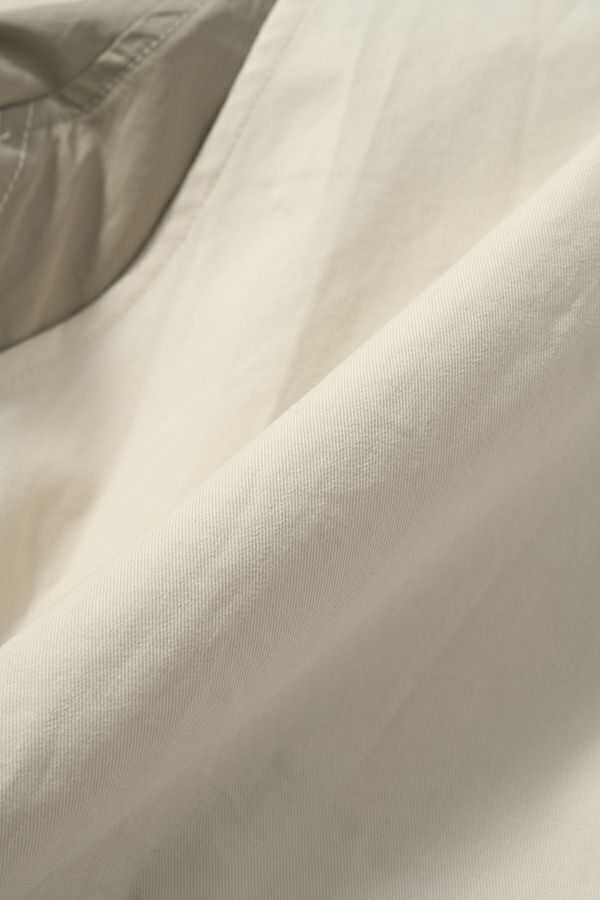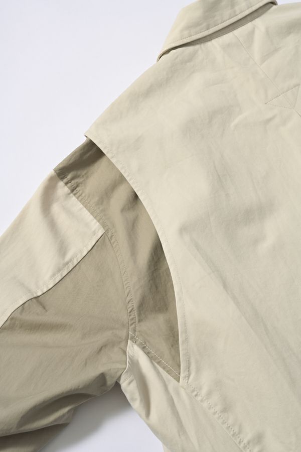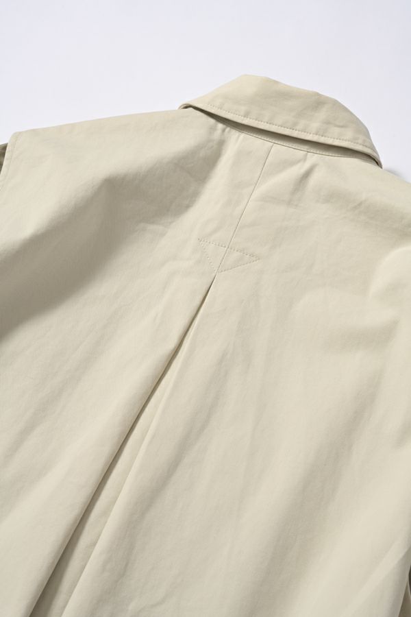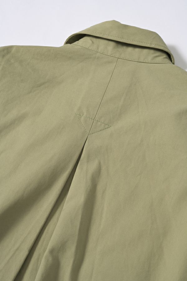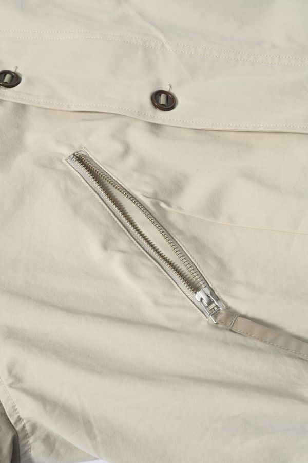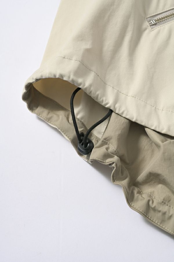 カナダ軍のミリタリージャケットをベースにしたデザインブルゾン。 大ぶりの袖が特徴的で、そのまま着用してもらっても可愛いですが、袖口のボタンをしめ、袖にボリュームをもたすと女性らしいシルエットになります。 前後差のある裾のラインは後身頃側のコードを絞り、丸みのあるシルエットにできるようになっています。 大きめなストームフラップと絞った裾との差が、見た目の雰囲気とのギャップがあるデザインになっています。 特徴的なパラシュートボタンなどもデザインポイントに。どんなスタイルにも合わせやすいアイテムです。