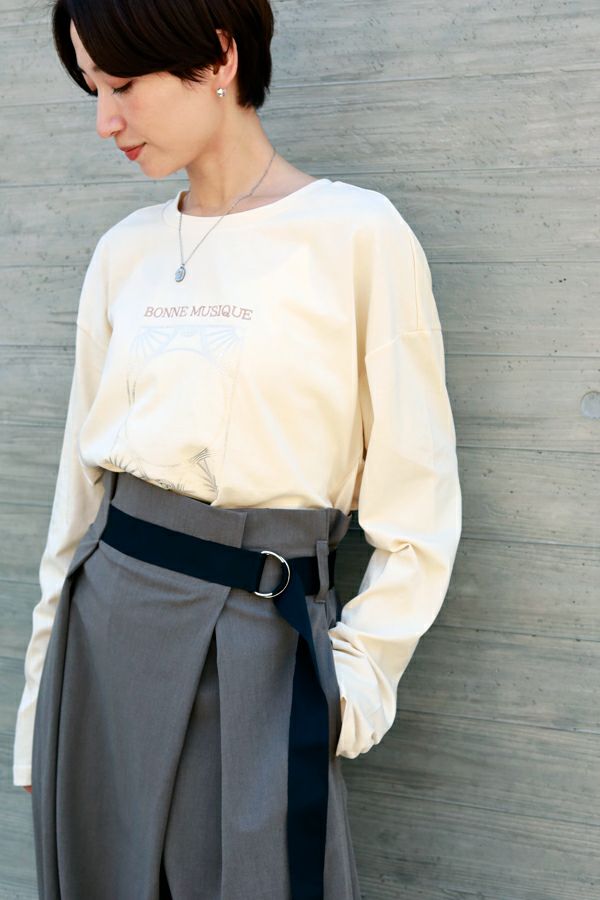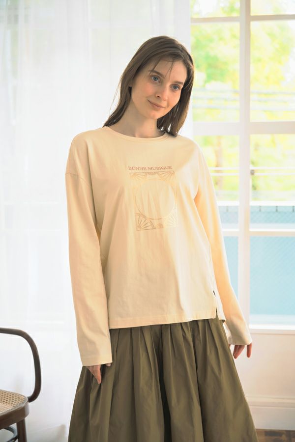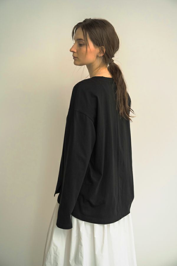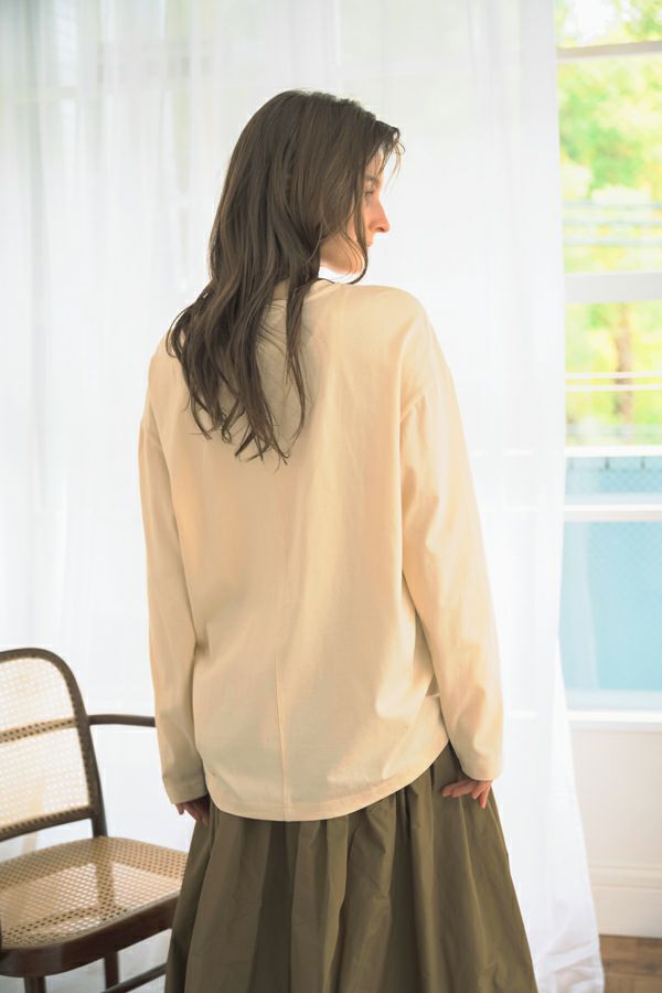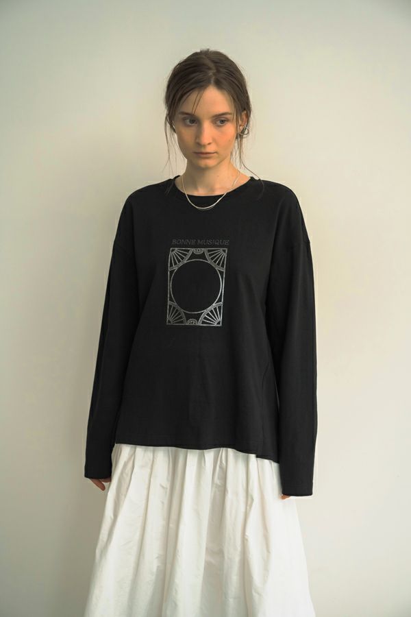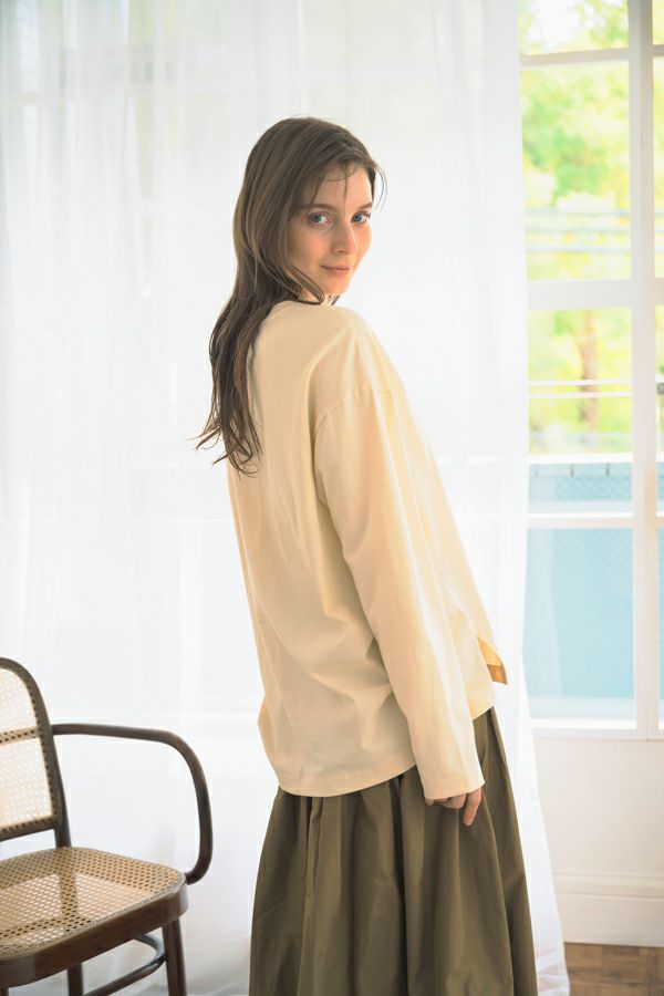 デイリーに使いやすい長袖ロゴTシャツ。コットン100%のサラッとした肌ざわりが心地よく、両脇に入ったタックと裾のスリットで自然なニュアンスを作ります。 首元はミニマルなクルーネック。程よいオーバーサイズ感で胸元のシャープな箔プリントがポイントになっています。 ベーシックなアイテムなのでスカートなど甘さのあるボトムと合わせたり、カラーパンツや柄ボトムなどと合わせた、旬の着こなしもおススメです。