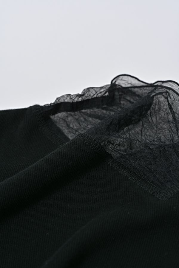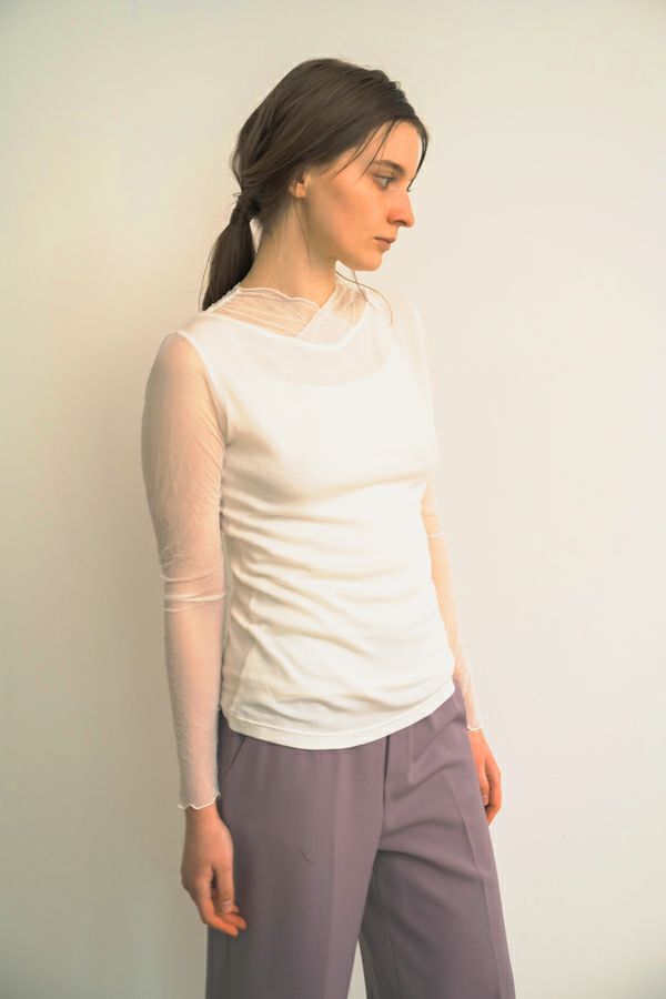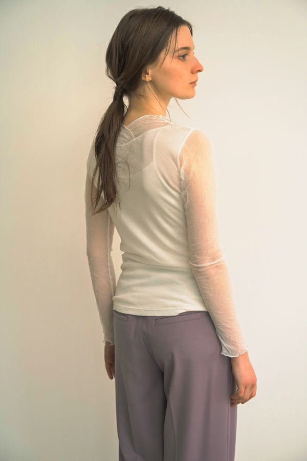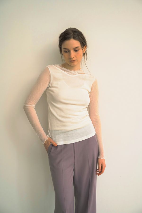 イリブ生地とクラッシュメッシュ切替でのシアー感が今年らしい着こなしに欠かせない日本製 ロンTEE。 素材は特殊なアルビニスタシフォンテレコ素材で、肌触りも良いコットン100%で優しい着心地になっています。今年らしくやや長めのメッシュ袖は、くしゅっと軽くたくし上げて手元のニュアンスを楽しんだり、ブレスレットを合わせるのも素敵です。 着心地の良さとさり気ないシアー感で一枚はもちろん、ニットやジャケットのレイヤードアイテムとしても最適です。 【アルビニスタシフォンテレコ】(イタリア糸) → 細番手の綿をテレコ組織で甘く編み下ろし、肌離れの優れたエアリーなタッチと程良い透け感が新鮮な素材の生地。
