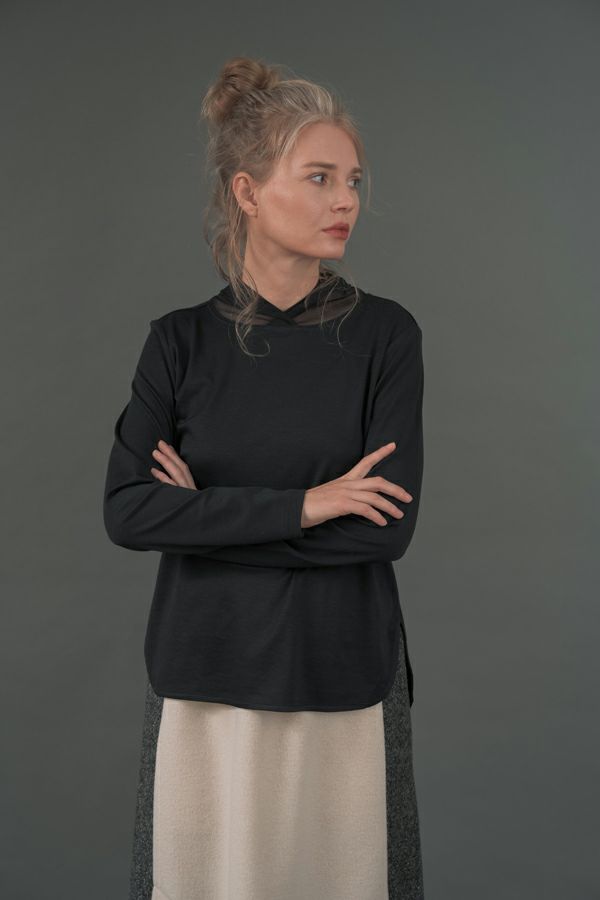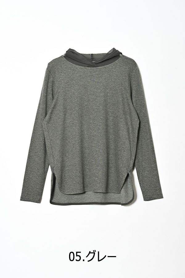 ※※2025年度も新入荷いたしました!(25158-1700Z-R) 商品検索の際は「1700」の4桁を入れていただくとスムーズにヒットします。 大人気のakane定番インナーアイテムは環境にやさしい再生繊維テンセルを80%使用した、ストレッチ性のある編地とポリウレタンを使用することで自然なストレッチ感です。 テンセルが持つ光沢感とドレープ性に加え、プラスシルケット加工をすることでよりきれいな発色性としなやかさを出しています。同色系のチュールフード部分はストレッチ性と透け感があり、気になる首元をふんわりとカバー。 レイヤードのインナーに最適な素材感、1枚着でもOKな秋口から春までのシーズンレスな1枚で多色カラー展開。 ●日本製