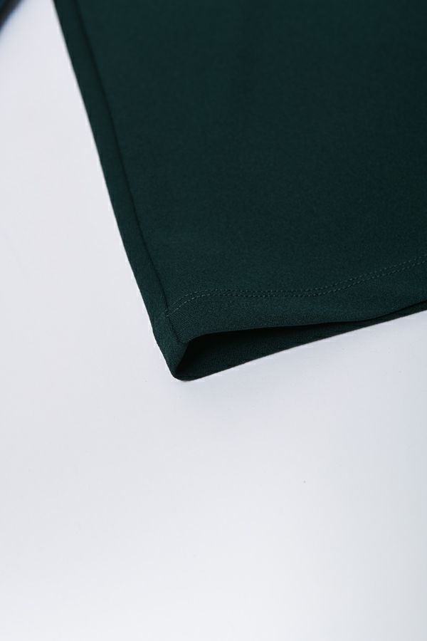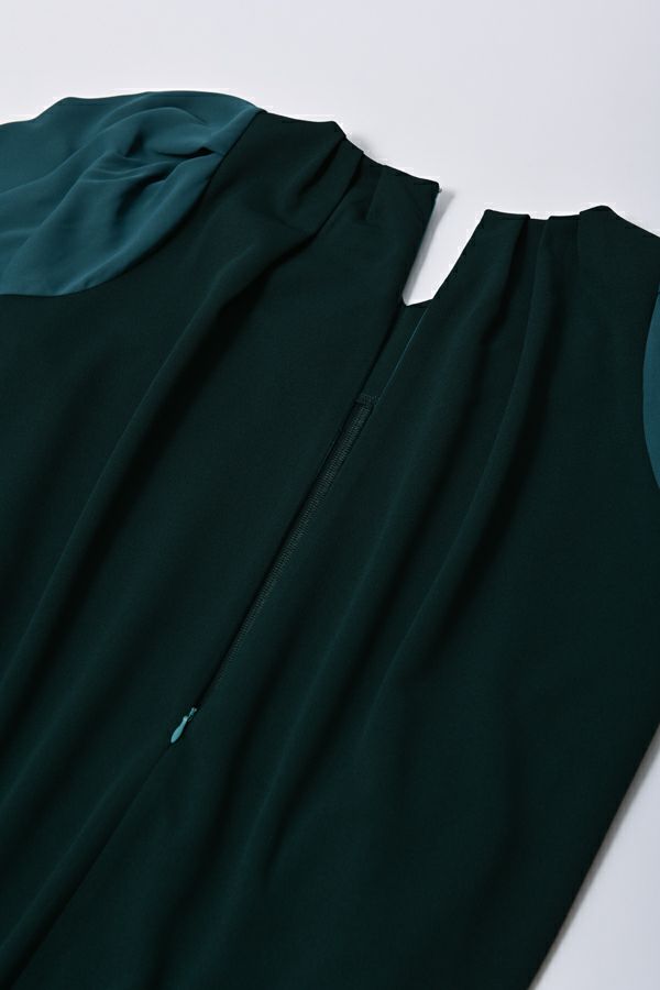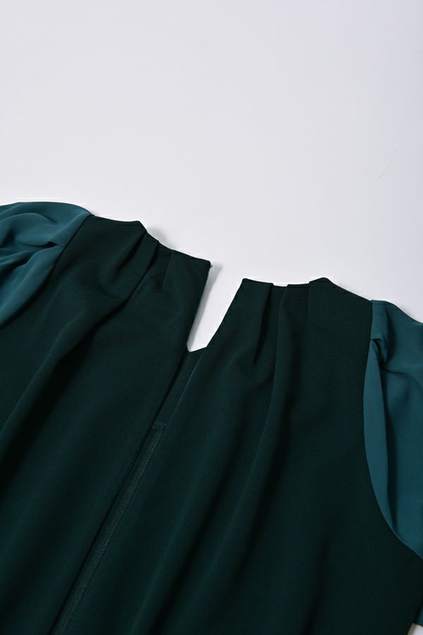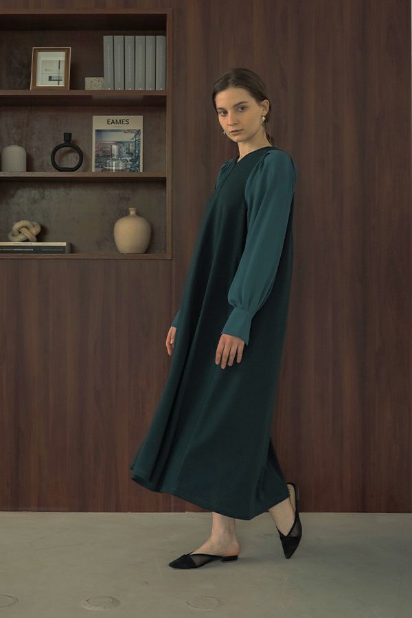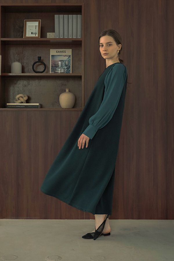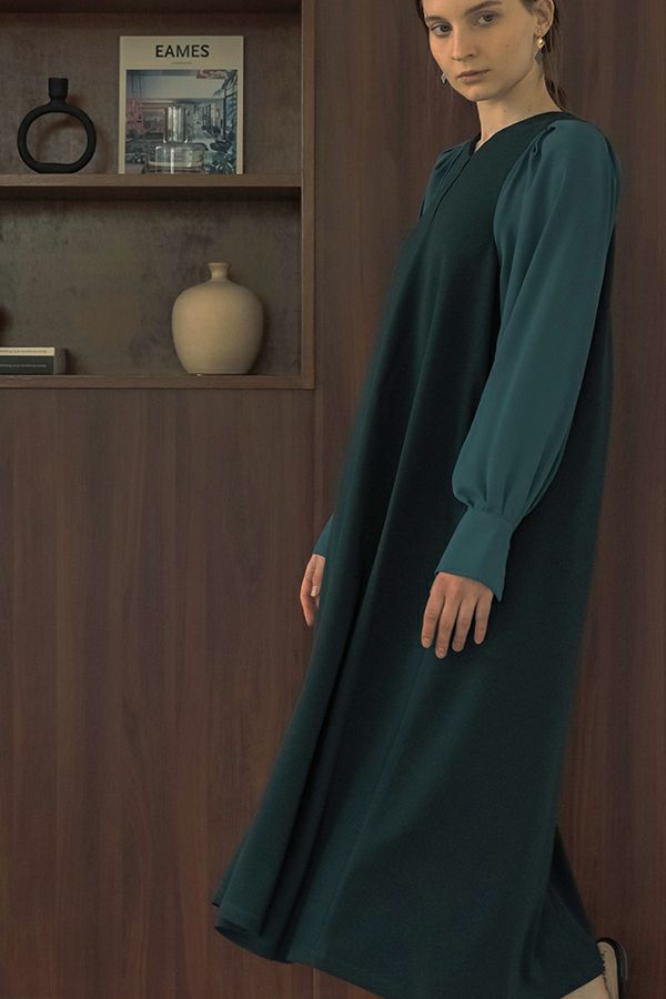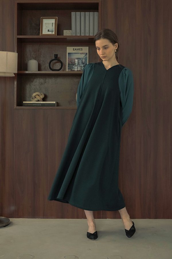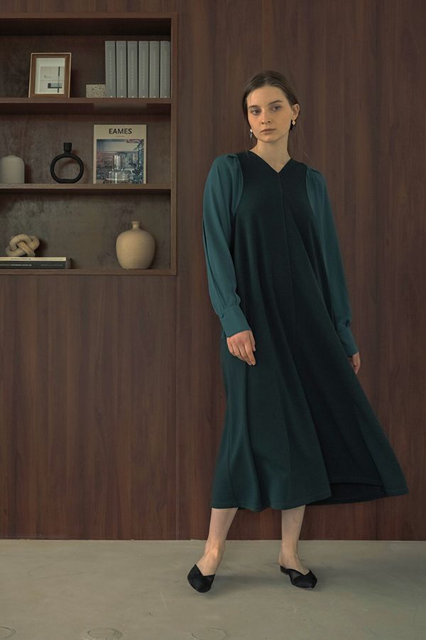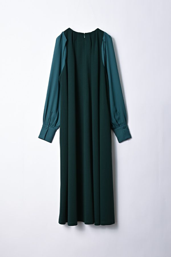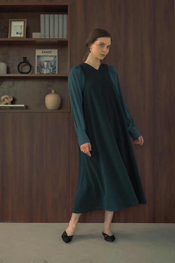 微光沢と落ち感のあるカットソー生地のワンピース。 適度な華やかさもあってオケージョンにもおススメです。袖は透け感のある布帛生地で異素材使いを取り入れ、細い肩巾からアームホールにかけての切替ラインと高い位置でのVネックデザインでスッキリとしたフィット&フレアに仕上げました。 サラッと一枚で着用しアクセサリーやシューズで遊んで楽しんだり、ショート丈のベストやジレと合わせて、今風の着こなしもおススメです。