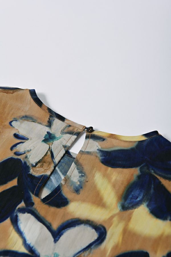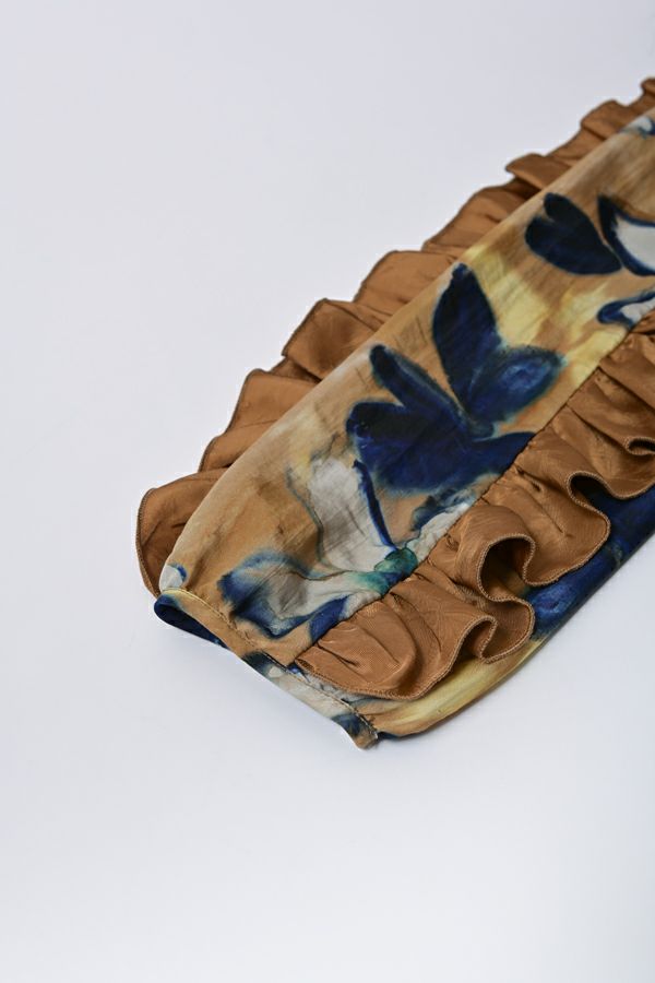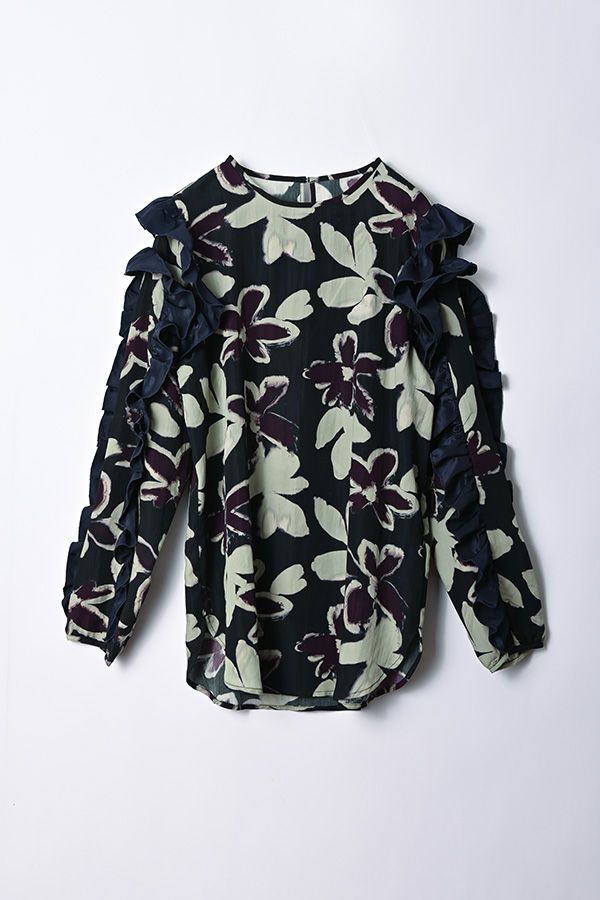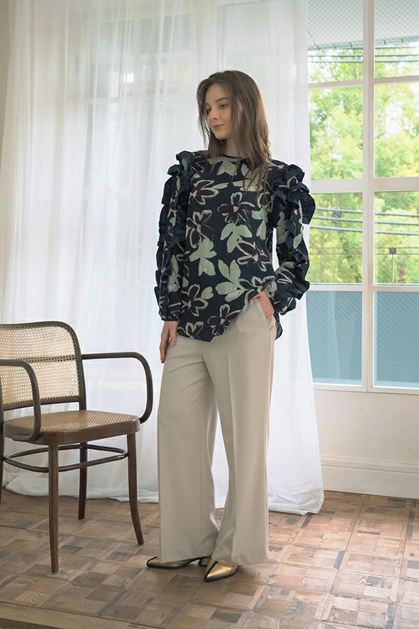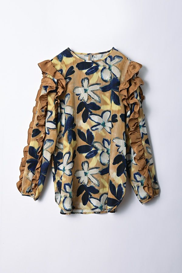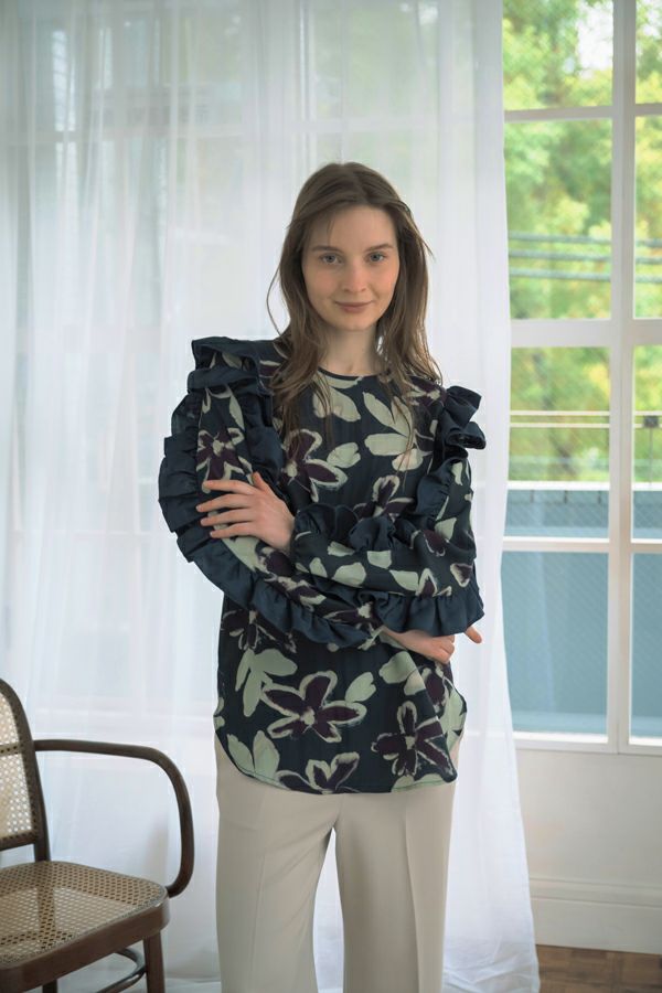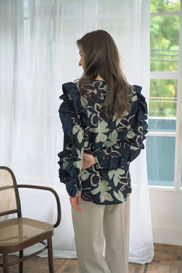 存在感抜群!アート柄オリジナルプリントのノーカラーフリルブラウス。 肩と袖山に入った配色無地のギャザーフリルでボリュームを出し、エレガントで主役級なデザイン!ヒップまで隠れる長め丈で、裾ラインはラウンドし、ベルトインにもアウトにも対応できます。 ボリュームのシルエットなので、スッキリボトムとの相性抜群です。あえてカジュアルなデニムやカーゴパンツで合わせ、抜け感を出したスタイリングもお洒落です。