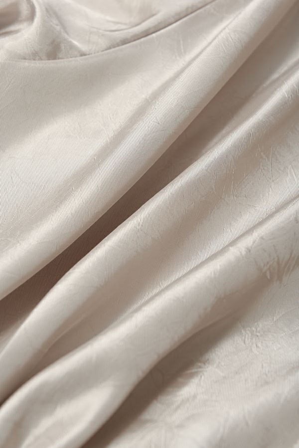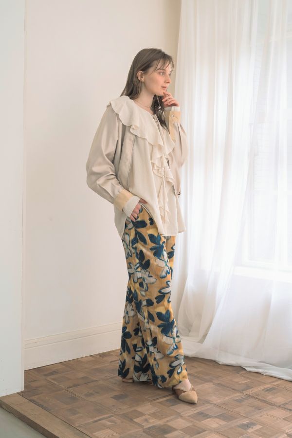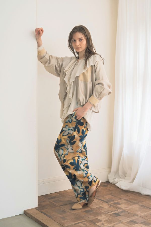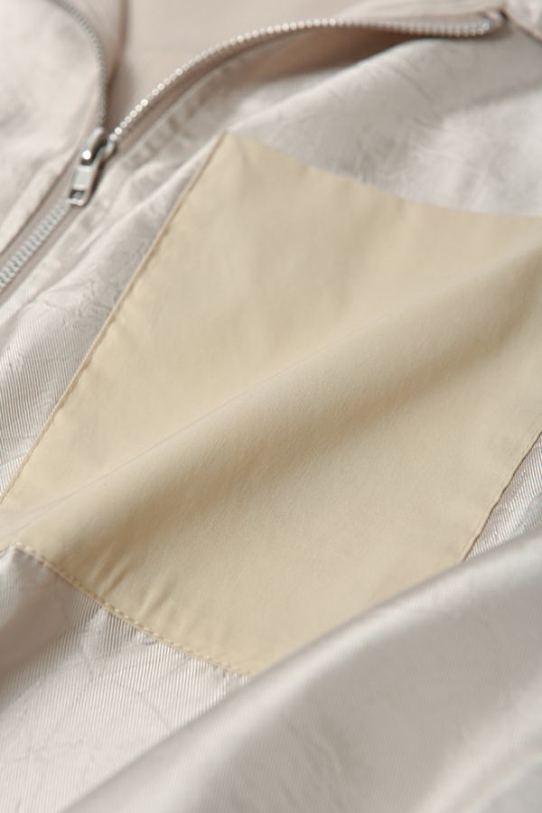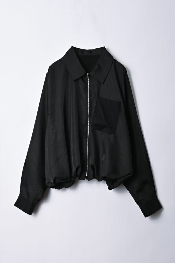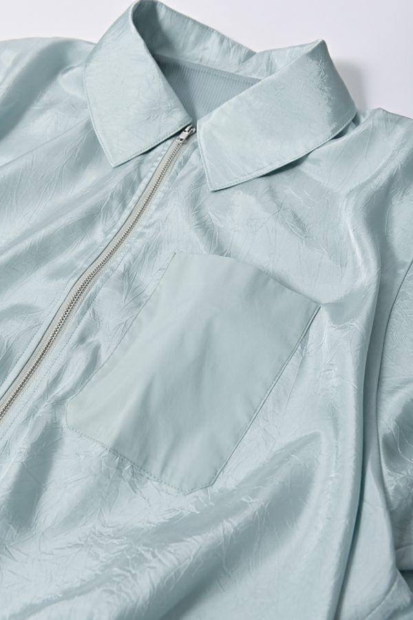 ステンカラージップ前開きショート丈ジャケット。トレンドのショート丈ジャケットで素材は光沢がキレイな柔らかいサテン地で落とし込みました。 ステンカラーで襟元にはキッチリ感を残し、裾にはゴムギャザー仕様で膨らみを持たせたバルーンシルエットが特徴的になっています。身頃のみ裏地付きで、袖カフスと左胸ポケットは異素材使いがポイントです。 薄く軽いので、カーディガン感覚でシンプルなインナーやワンピースに羽織るだけでもスタイルUPになります。また、前ファスナーを閉めてブラウスのようにも着て頂けます。