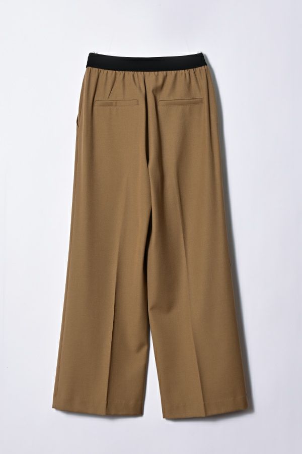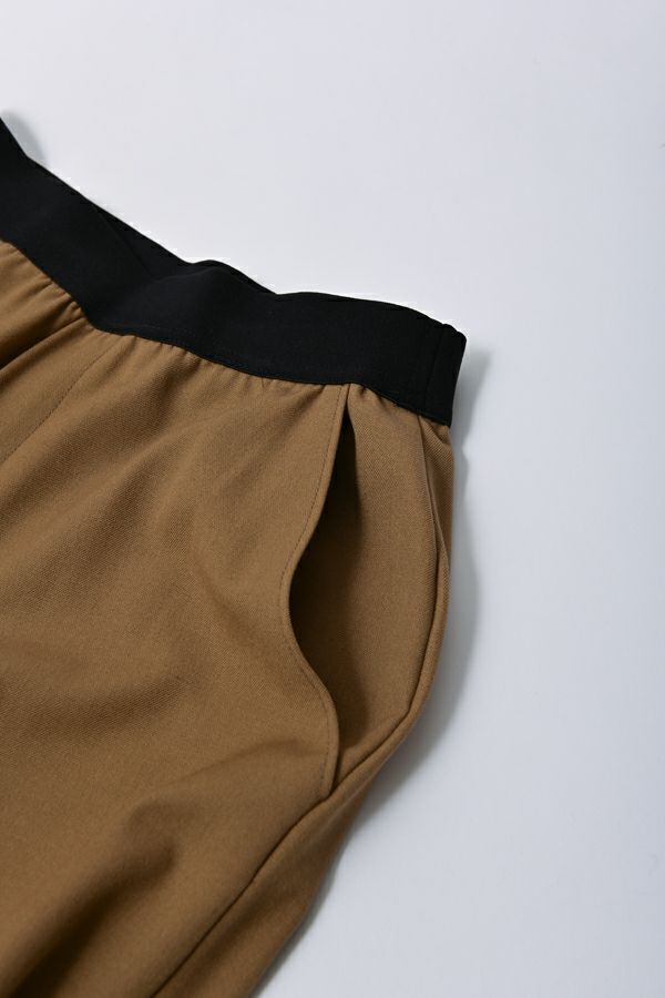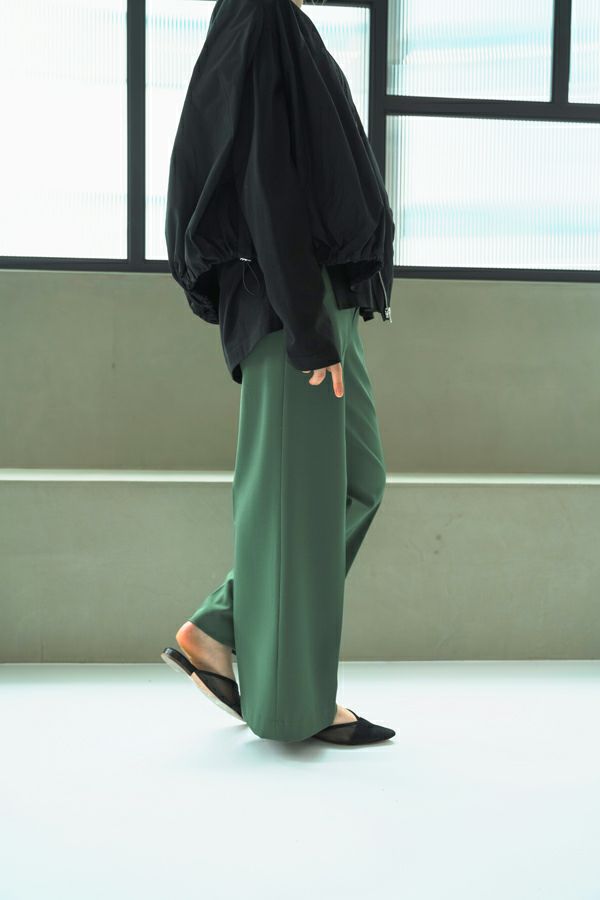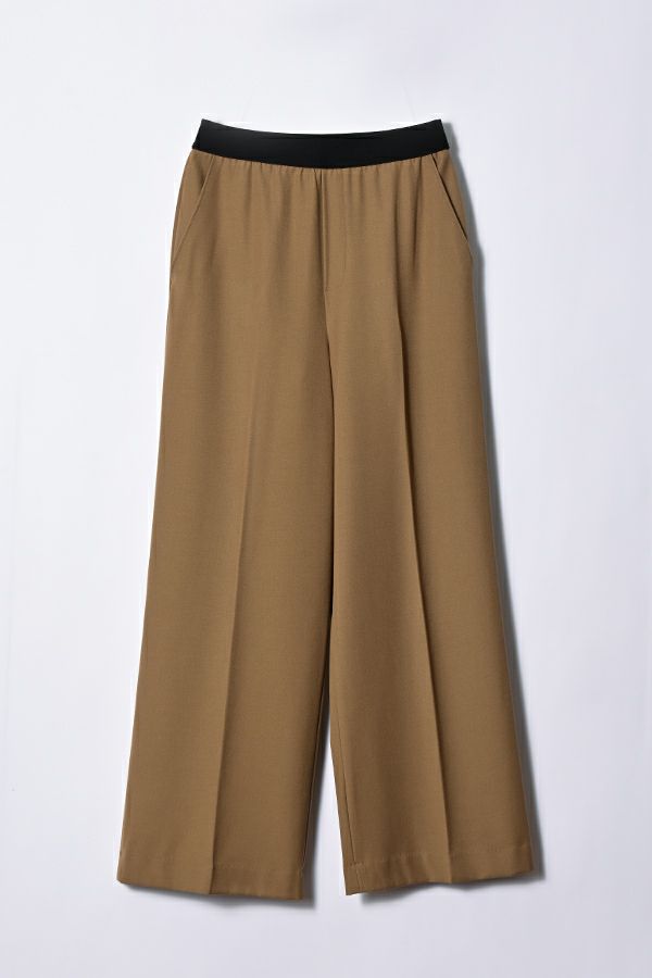 綺麗なシルエットでウエストゴムの万能セミワイドパンツ。 素材にウールが少し入った、微起毛がかった表面生地でウォーム感があります。 深みのある穏やかな秋らしいカラー展開となっています。落ち感のある生地感とセンタープレスの入ったラインで、脚のラインを拾わず脚長に見えます。 トップスのバランスを選ばず汎用性の高いパンツなので、何にでも合いますがキレイめなパンツなので、足元にはスニーカー合わせが可愛いいのでおススメです。