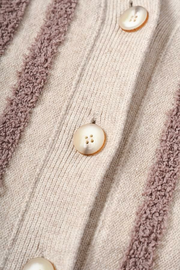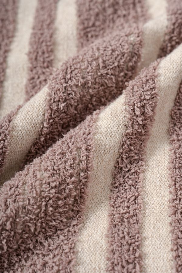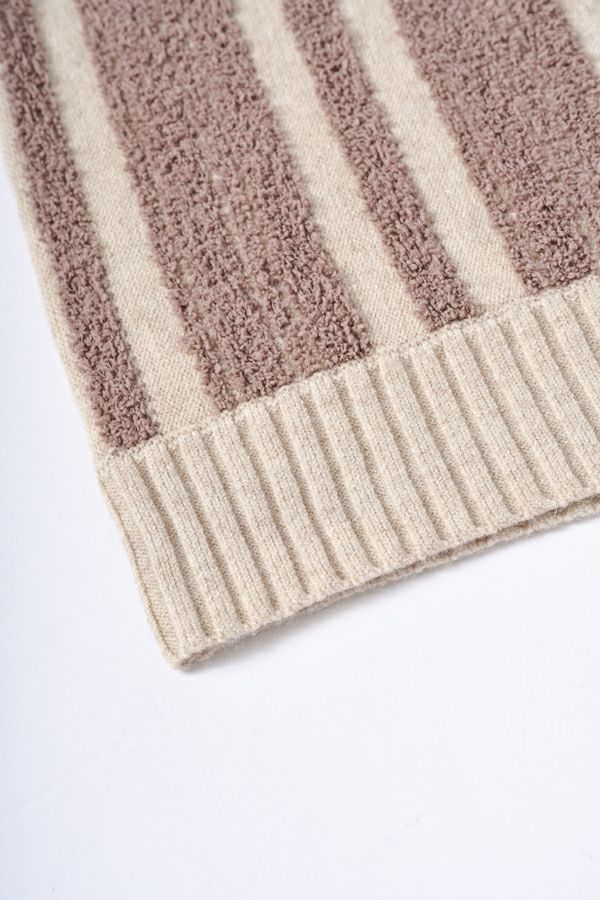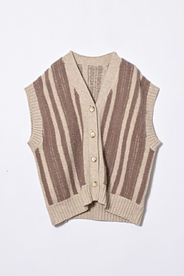 ファンシー糸を立体的に編み込んだ華やかなカラーリングが光るニットベスト。 モール糸(糸全体に直立した毛羽のある意匠糸のことです)を立体的に編み上げ、こなれ感がプラスされつつ、着ぶくれ見えしないようにストライプ柄にすることで縦見えの視覚効果を取り入れたアイテムです。 体のラインを拾いにくい、程よい厚みが着回し抜群のベスト。肌触りも柔らかく着心地が良いのも嬉しいです。デニムなどのカジュアルなアイテムにさらっと合わせるだけで遊び心あるカジュアルコーデに大活躍。 ストレート・テーパードシルエットのパンツを合わせたり、タイトスカートなどでも大人カジュアルをお楽しみいただけます。