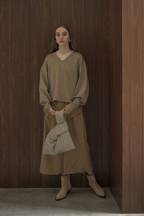 モードなVネック長袖カットプルオーバー。 肩先を落としたドロップショルダーと前後のネックラインがしなやかでリラクシーな雰囲気がポイントです。 カットソー素材でカジュアルになり過ぎないように、袖口にかけて絞ったような長めの切替とタックを入れてフィット&ボリュームな袖シルエットにも拘りました。 ラグウォームモイストポンチ生地使用でモチッと感のある風合いが快適な着心地。 タイトスカートやデニムに前裾をウエストインして、後ろに抜いて着るのもおススメです。 インナーにブラウスやカットソーを重ねて、裾を出すレイヤードスタイルも◎ ラグウォームモイストポンチとは →湿気や汗を熱に変える吸湿発熱性がある為、暖かさを実感できます。 加工工程に拘ることによって生み出されたソフトな風合いと滑らかな肌触り に加えストレッチ性にも富んでいるので、心地よい着用感が楽しめます。 ピリングもしにくく、機能性・ファッション性・安定性を兼ね備えたJapan quality 素材です。