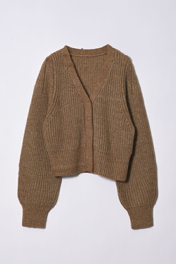 トレンドであるグリッター素材の糸で編み上げた、オケージョンにも相応しい華やなカーディガン。 肩幅を小さくして、袖の付け根部分にタックと程よいボリューム感のあるスリーブシルエットでドラマチックに仕上げました。オケージョンスタイルにもスタイリングしやすいように、スッキリとした衿に前立てのグログランテープがアクセントです。 腰より少し高めの位置に設定した裾リブが、着用時に目線が上がるようデザインされているので、ハイウエストのスカートやボリュームシルエットのボトムスを合わせるとスタイルバランスがよいです。