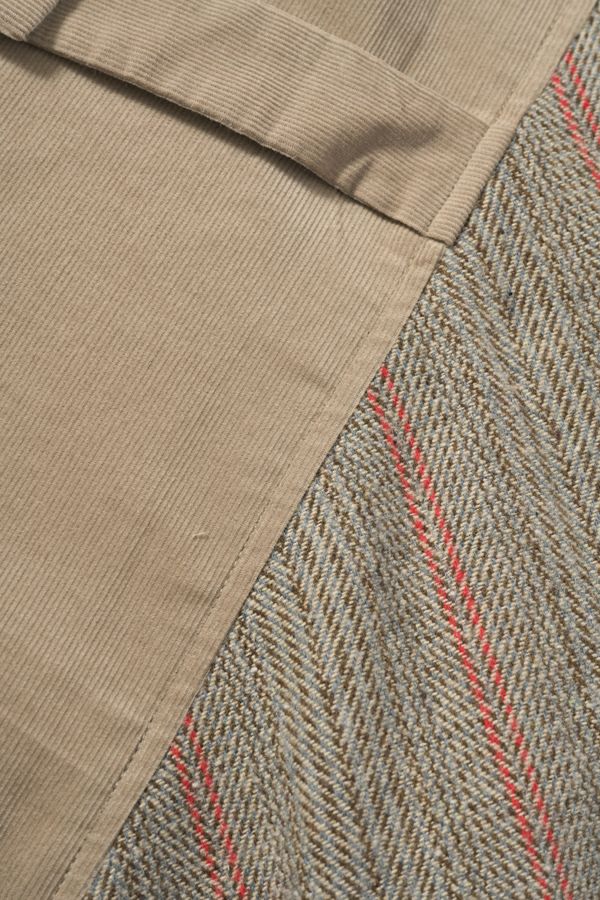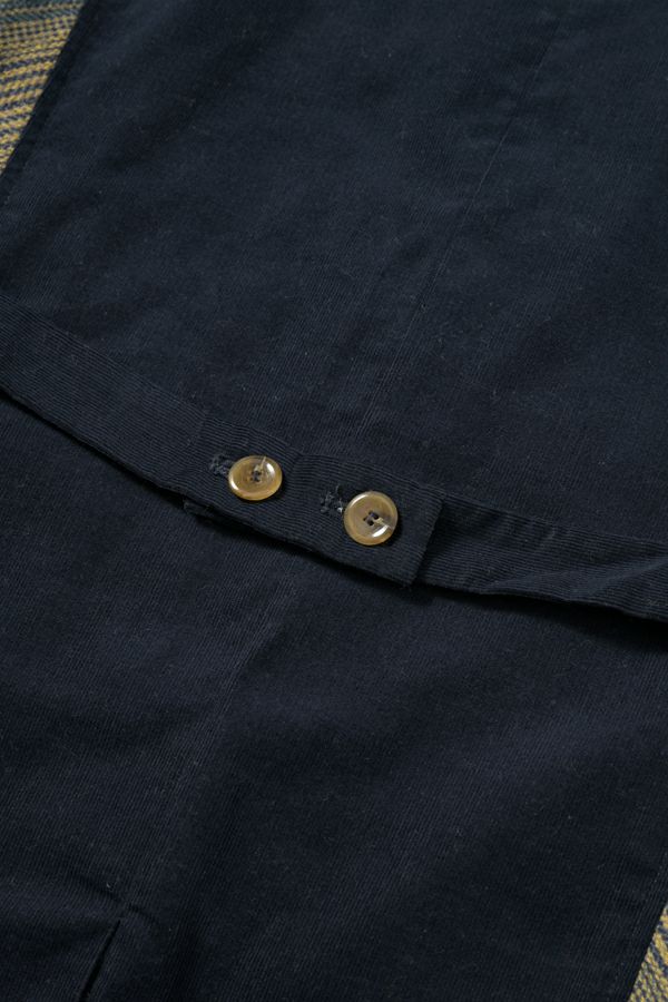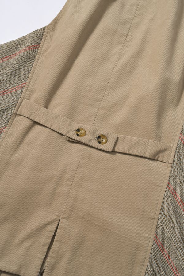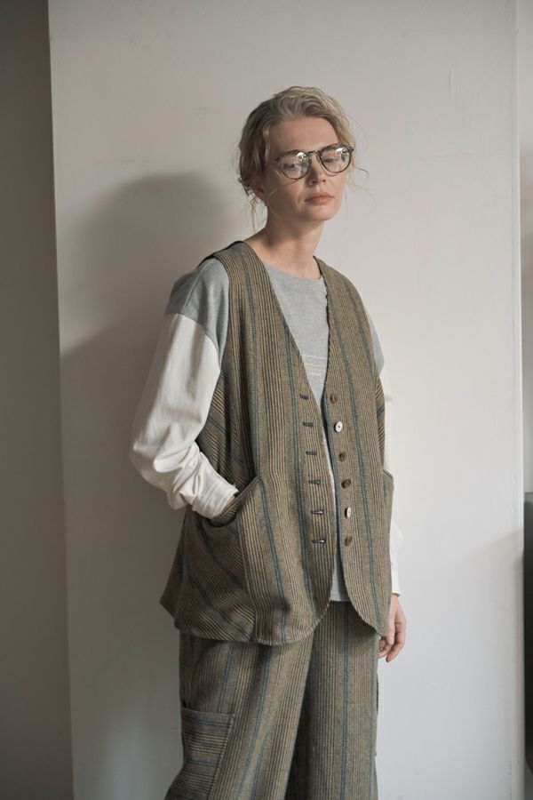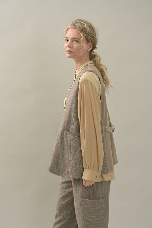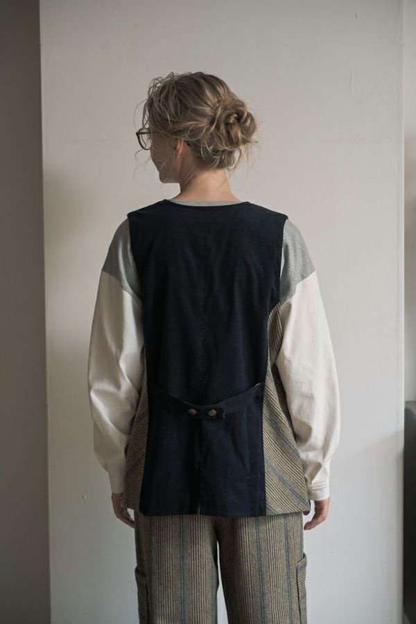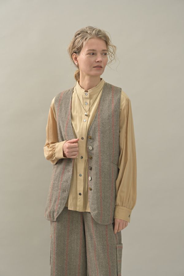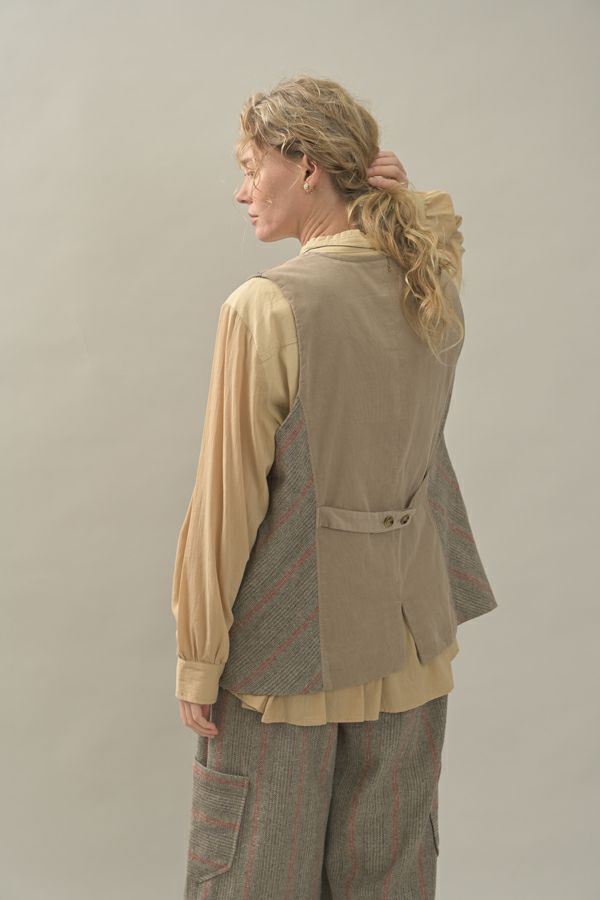 クラシカルな印象のツィードベスト。 後ろ身頃はソフトな細コーデュロイの配色で背中をスッキリ見せ、メリハリを。 バックベルトが腰高に見せ、スリットで動きやすい仕様にしています。 前立てのボタン部分は、数種類の個性的なボタンをあしらい遊び心もプラス。 袖ぐりを大きくくってるのでゆったりとしたインナーにも着合わせしやすいです。 同素材のツィードストライプパンツ(24238-9773B-R)とセットアップ可能です。