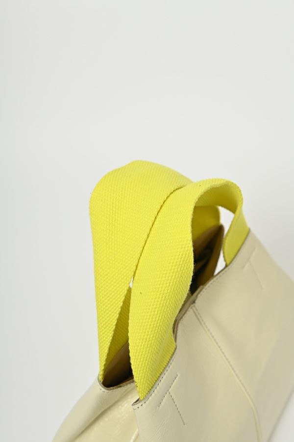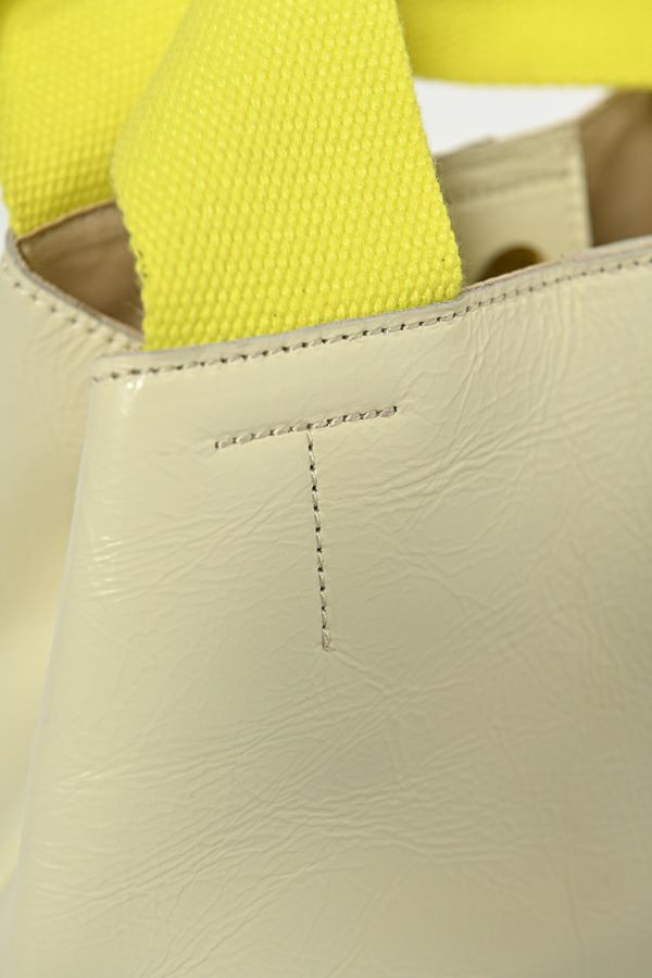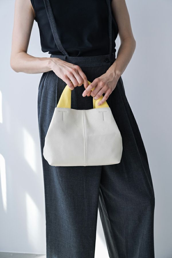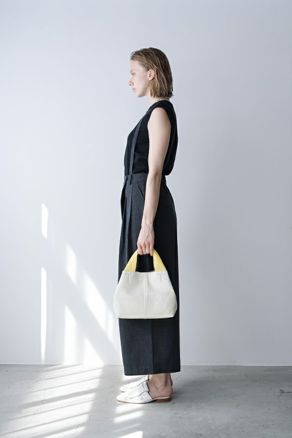 絶妙なサイズ感でスタイリングに映えるトートBAG。 光沢のある牛皮革のバッグ。カラフルなハンドルとの組み合わせが新鮮。 シンプルなスタイリングにプラスすれば、こなれ感のある雰囲気に。 両サイドの金具を留める事で形が変わる仕様です。内装にはファスナーポケット1つとオープンポケット2つが付いています。