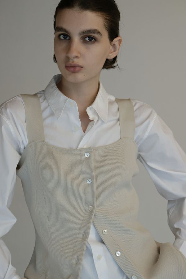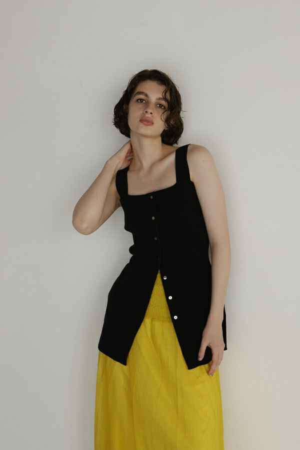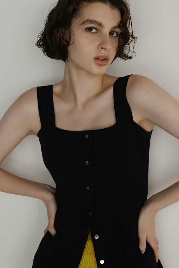 グッとあがる雰囲気を醸し出す大人ニットタンクトップ。 大人の女性シルエットに設計された細やかなリブ編みで、チュニック丈の前開き仕様がコーデの幅を広げてくれます。 素材のポリエステルはPBT(ポリブチレンテレフタレート)繊維が使われています。PBT繊維は伸縮性があることが特徴ですが、よく耳にするポリウレタン素材よりもゆるやかなキックバックなので長時間着ていてもストレスフリーで快適なストレッチ感とハリ感、耐薬品性がありポリウレタンよりも劣化しにくいのでハンドウォッシュが可能な優れたアイテムです。 1枚着で大人女性のスタイリッシュな着こなしに、さらにジャケットを羽織ってモードスタイルになります。 ●前後着用可能な2WAY仕様 ●手洗い可能
