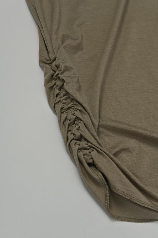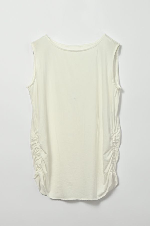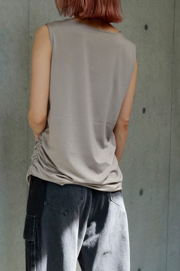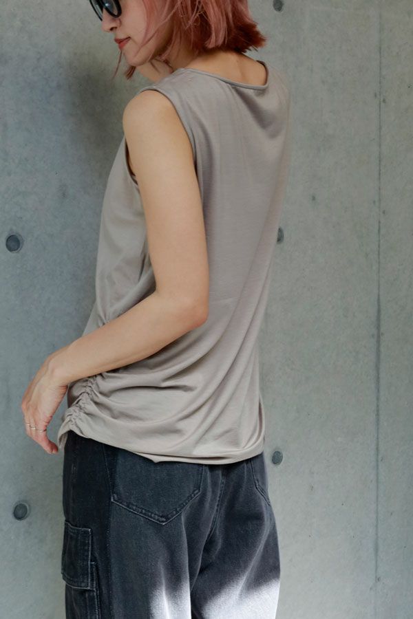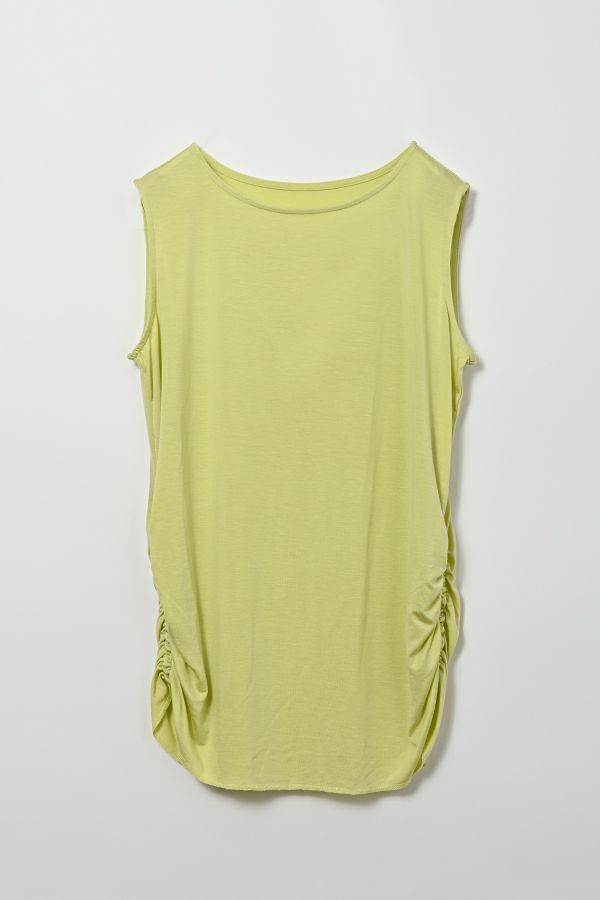 腰周りをカバー、大人女子の手放せないデザインタンクトップ。 ぬめり感のある上質なテンセルで編まれたベア天竺です。しっとりした肌触りでとでも柔らかく、保湿性、吸湿性を持ち速乾性が高い素材なので一日中快適なまま過ごせます。 絶妙な透け感が洗練された大人な印象を与えてくれます。シアー素材は色ものでも強くなり過ぎず着回しも利くので、差し色として取り入れても上品さを保ち、ベーシックカラーは統一感を持たせるアイテムとしても◎ ジャケットなどに合わせた時のデコルテの見え方に拘った衿開きです。 キャミソールやチューブトップの上にサラッと着用するだけで手軽に格上げスタイリングが叶います。インナーとして着用しても もたつかないシャーリングの分量です。 短丈の羽織りとレイヤードしてシャーリングをデザインポイントにした着こなしもおすすめです。 ●日本製